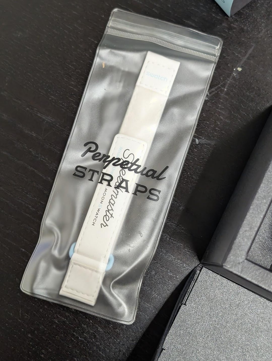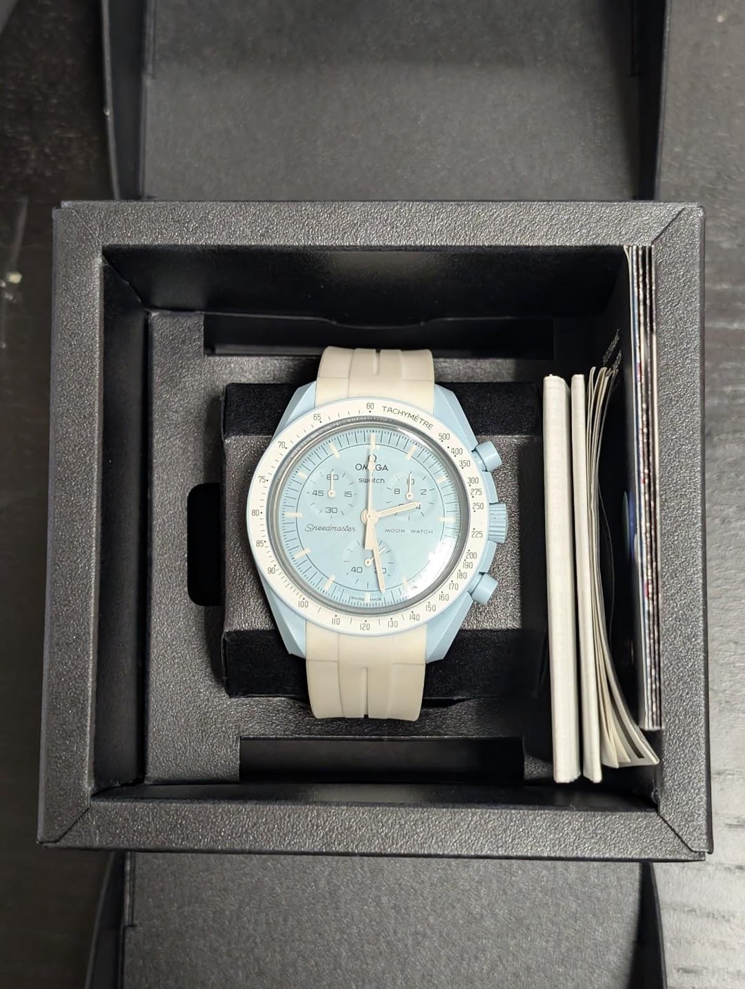Hey folks, this is a Swatch Moonswatch Mission to Uranus, including a perpetual crystal protector (already applied and I am throwing in a spare) and Perpetual strap made for the Moonswatch Uranus along with everything that came with the watch - box, papers, tag, it's all there. Bought by me from the Swatch store in San Francisco on June 23, 2023, worn here and there, treated well, but now I'm just trying to pare down the collection to the essential. I don't have to say much, it's stylish, it's fun, it doesn't take itself too seriously, great color, the piece is in great condition, no scratches or anything like that, mainly because I put a screen protector on the crystal as soon as I bought it so it hasn't gotten scratched up at all. All edges are still sharp and the timing mechanism runs great. Happy to provide new pictures and video as I know this is my first transaction under this name (I deleted my old Reddit account a while back). Asking $200 shipped, Paypal and Venmo are both fine, can ship anywhere in CONUS. Feel free to ask me questions! Thanks for looking!
