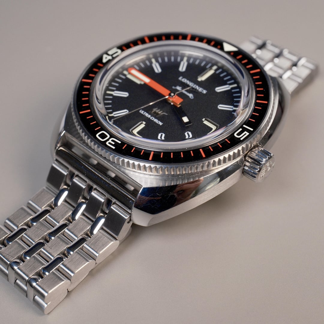 Longines Ultra Chron 43mm Stainless Steel Diver. L2.836.4.52.6. Purchased new from Hodinkee in 2024. This is the 43mm stainless steel model with the incredible sapphire bezel. The bracelet is a great vintage-style 7-link bracelet with straight lugs. The domed sapphire crystal showcases the beautiful textured black dial and signature red minute hand. The stainless steel case and bracelet have some hairline desk diving scratches. The sapphire crystal has a tiny flea bite around 7:30 that I only noticed when taking these high resolution photos. Box and papers included. $1995 including shipping to CONUS. PayPal preferred. [Timestamp](https://i.imgur.com/cSYUnzs.jpeg)
