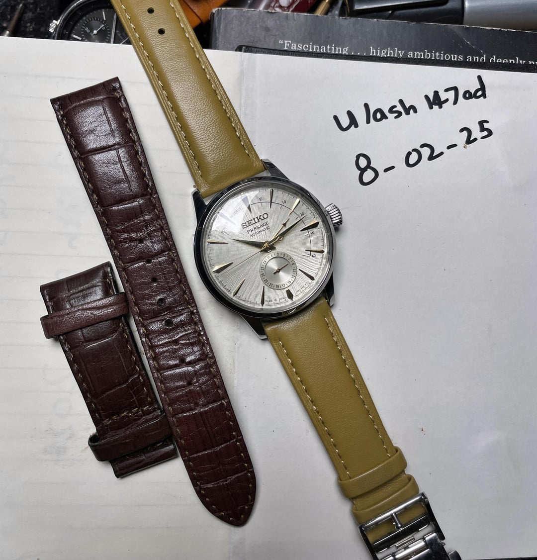 Greetings fellow Watchnerds/Watchhoggers and Enthusiasts! Listed today is this rare Seiko Presage Cocktail Time 🍾 A gorgeous champagne guilloche pattern textured dial a power reserve indicator and date window Stretched golden diamond hour markers Reflective golden sword hour/minute needles to contrast the case and dial aesthetic The case is pristine keeping original lines and texture from factory. It has been never polished or buffed. The back sticker is still intact It has never been tampered with, all parts are original as they should be. It keeps excellent time Reference Number: SARY107 Diameter: Case: 40.5mm with crown | Lug to Lug: 47.5mm | Lug Width: 20mm Condition: Case has no scratches | Dial is in nice and clean condition Movement: Seiko 4R57A Automatic Caliber Crystal: Hardlex Crystal Strap/Bracelet: Comes with the original brown leather strap and butterfly clasp along with an aftermarket mustard leather strap Accessories: Comes with a replacement Seiko box Price: Priced to sell at 550$ with Express Worldwide Shipping Payment Method: PayPal F&F or Zelle Not looking for trades Lowballers will be politely ignored Timestamp in last picture My Instagram for verification: https://www.instagram.com/whor3ologist/ My Carousell for verification: https://www.carousell.com.my/u/whor3ologist/ DISCLAIMER - GENERAL POLICY Sold on as-is basis. This is a pre-owned watch - no warranty, no exchanges, no returns. I always check my listing timepieces for Quality Control in order to ensure they are in working order and keeping time prior to selling. Due to the nature of vintage/pre-owned timepieces, there may be signs of wear and cosmetic imperfections not to be considered as defects. However, I do mention everything in the details Once an order is placed it cannot be cancelled as my watch releases are limited in quantity Please purchase if fully committed. If there are any issues, please feel free to reach out and I will do my best to work out a solution. Reputation is everything for me. Please check my feedbacks in case of any doubts