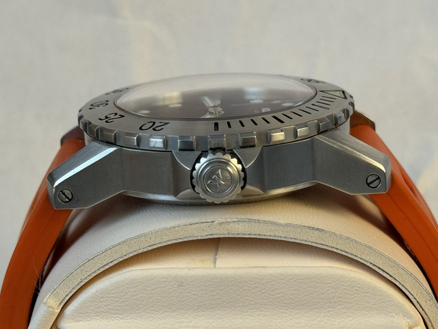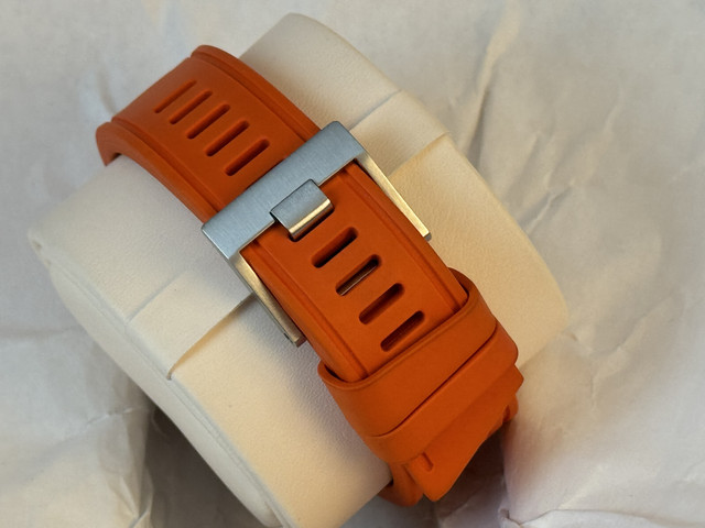 It is fitted on a Orange Rubber Isofrane, Italian made. I can switch it for Nato or other straps I have.