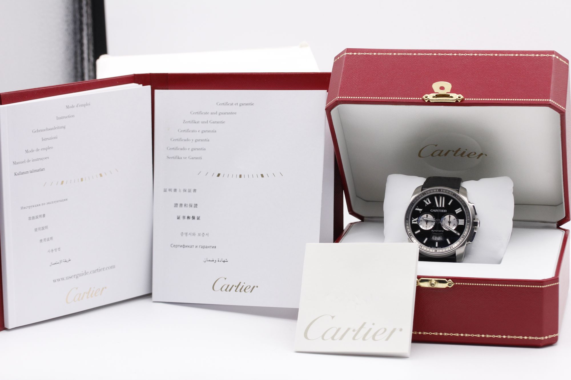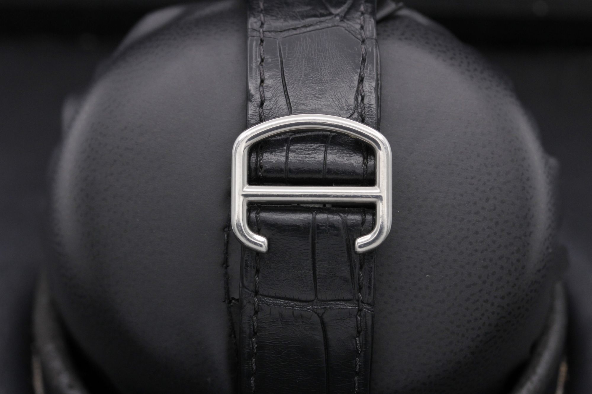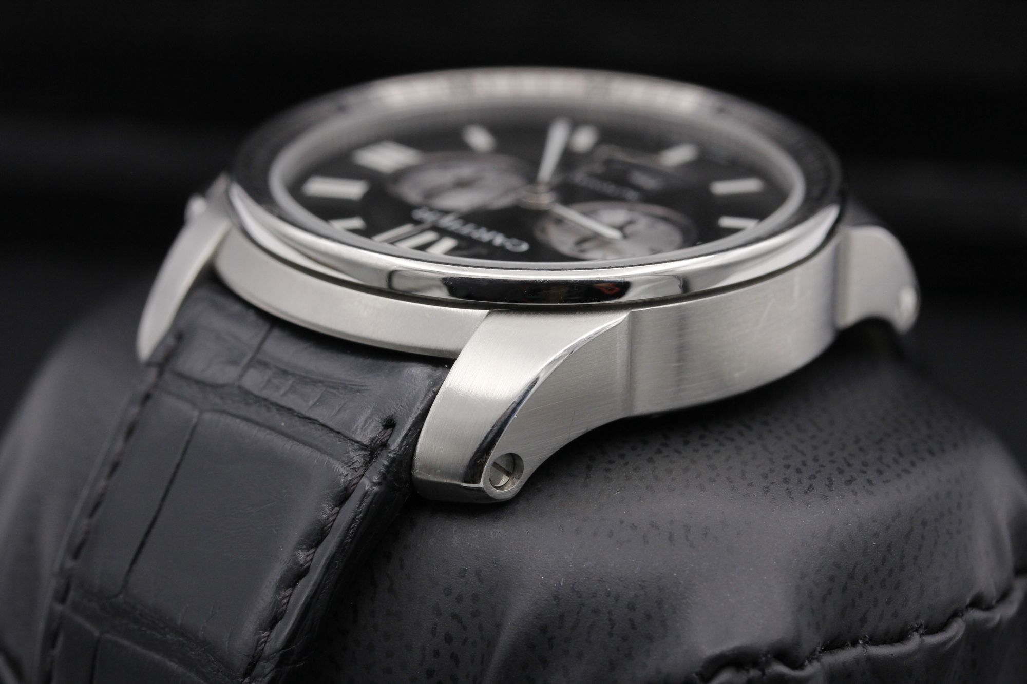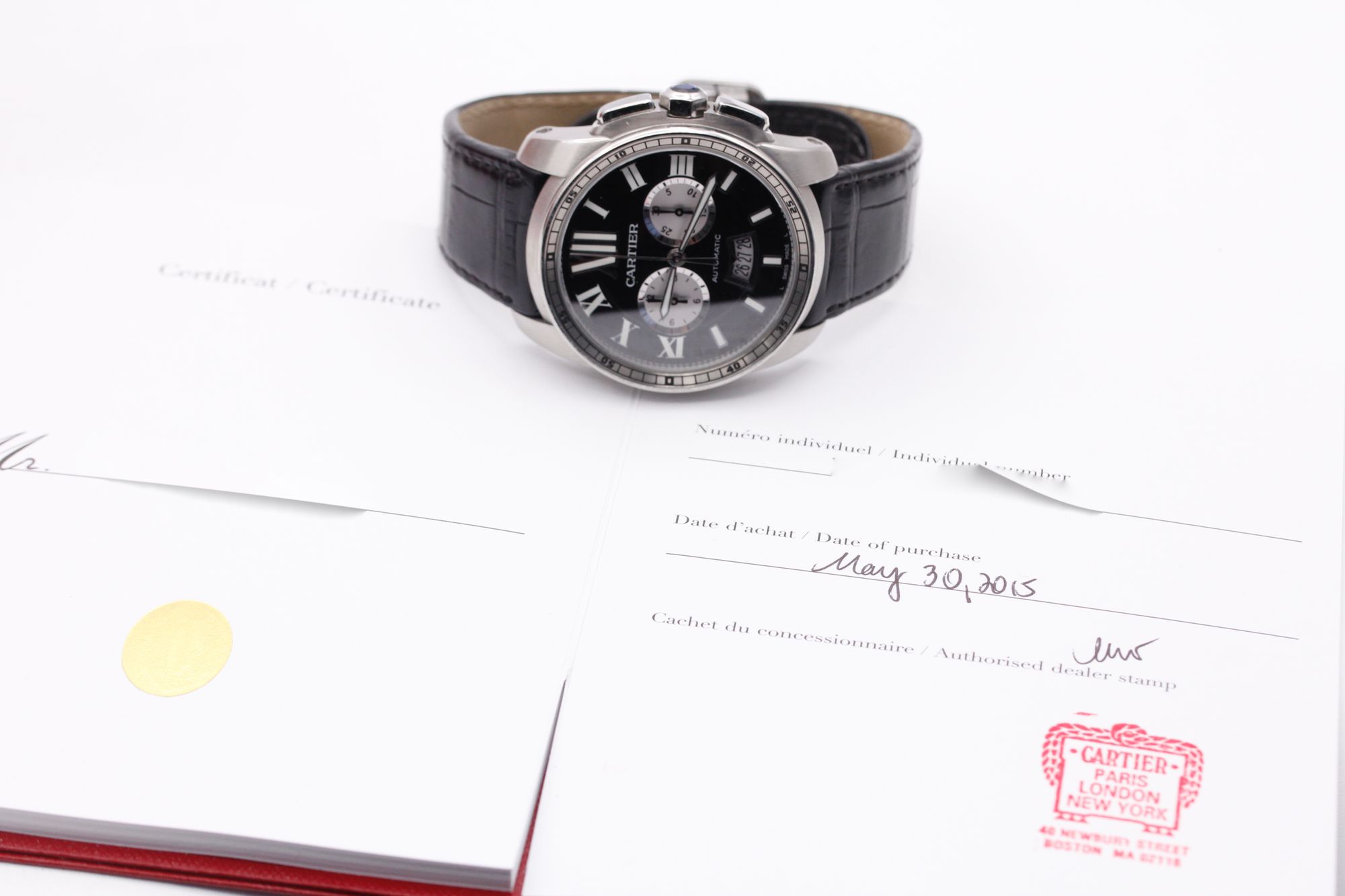 Brand: Cartier Model: Calibre de Cartier Chronograph Case Size: 42mm Condition: Pre-Owned Grade: Mint Bracelet Type: Alligator Material: Stainless Steel Dial: Black Age: Modern Movement: Automatic Papers: Yes Box: Yes Reference: W7100060 Additional Notes: Warranty Dated - May 2015