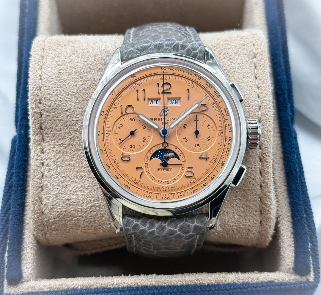 [WTS] Rare 2024 UNWORN Breitling Premier B25 Datora 42mm AB2510 Chronograph Moonphase COMPLETE SET w/ Custom Grey Ostrich Leather Strap by Aaron Bespoke $14,500 MSRP!