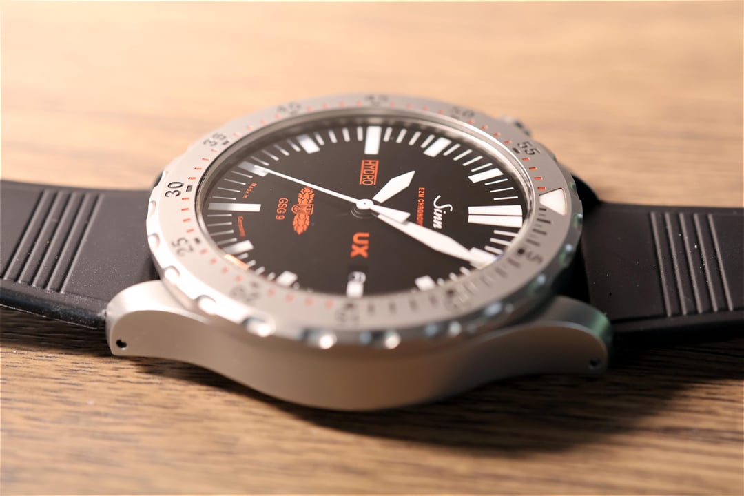 Up for sale is my Sinn GSG9 UX Hydro. This is an oil filled quartz monster. It is unique in a lot of ways. Firstly, the case is fully oil filled which gives it ridiculous pressure resistance. This is impressive but not all that useful for most of us. More practically, the oil gives the watch a ‘digital’ kind of look. It projects the image of the dial/hands directly onto the crystal. It's a very unique effect that 99% of other watches on the market don't have. The oil expands and contracts as the watch heats and cools. To keep it air bubble free, there is a metal baffle on the case back that allows the inner volume of the watch to change slightly. You can actually move the baffle with your finger if you push on it. Every part of the watch feels of rugged quality. The bezel is well machined and precise. The crown action is smooth and stable during screw down and time setting. The case edges are distinct but not sharp to the touch. Even spring bars have an extra deep This example is in decent condition with some scratching on the case and minor scratches on the outer AR coating of the crystal. The battery was last changed by Sinn in later 2021 and likely has a few more years before it needs that again. It comes with papers (chronometer certificate, warranty cards, operating manual) and a Sinn deployant clasp for a Sinn rubber strap. It comes supplied on a generic 22mm rubber strap. Also throwing in a generic 21mm leather strap in case it’s at all of use to the buyer. I purchased this watch from its original owner in Japan about a year ago. Timestamp in album. Asking $1310 shipped CONUS. Payment via PP FF or PP GS (+4%). What I really like about it: * The oil filled effect is fantastic * Bezel feel is light and refined * It has a very hefty feel to it Some specs and things: * Oil filled * 44mm case * 50.5mm lug to lug * 7 year battery, last battery change in December 2021 * 5000 meters water resistant * ETA 955.652 10 sec/yr thermocompensated movement * Tegimented bezel