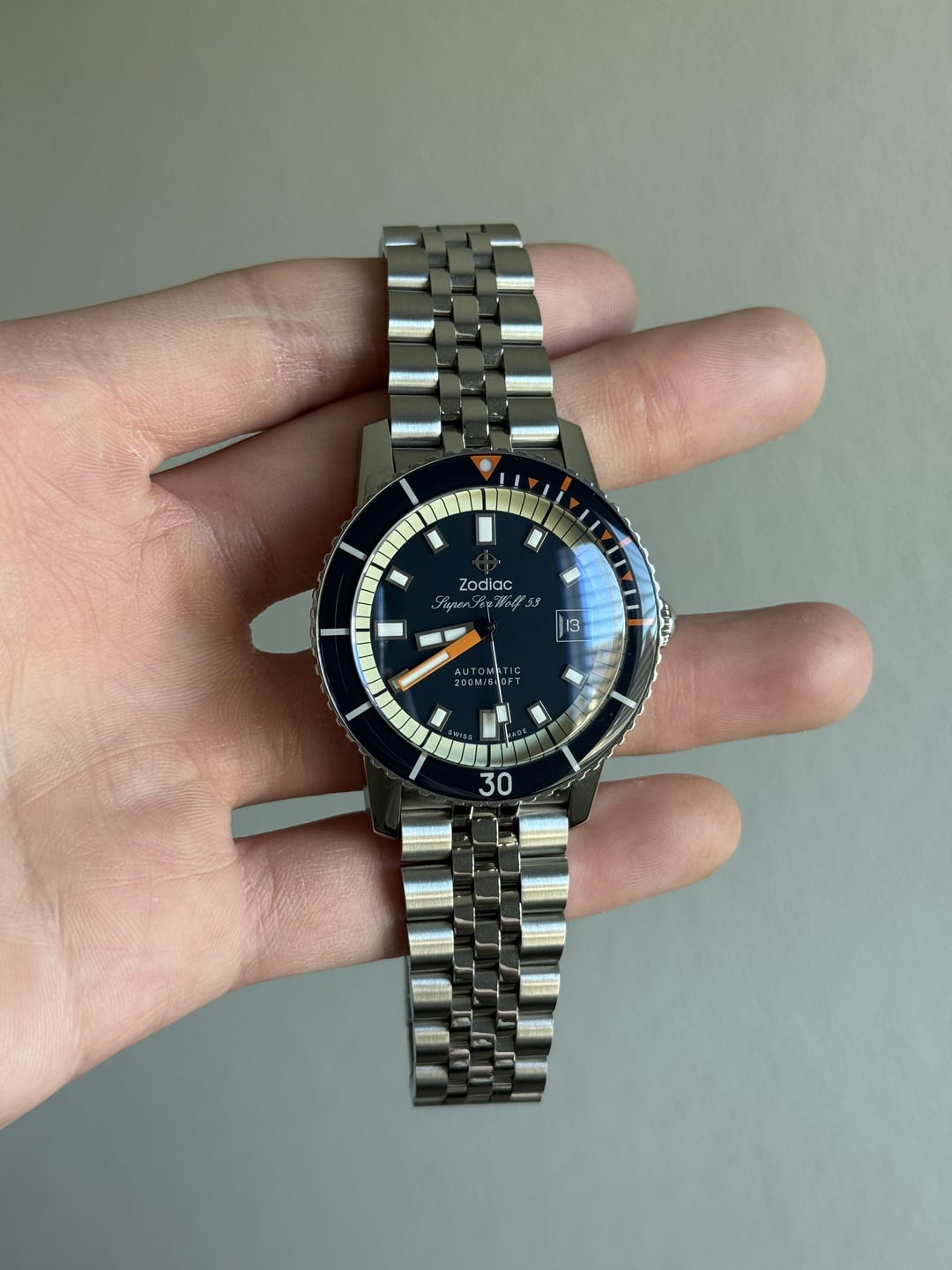 [Timestamp](https://imgur.com/a/yI45BRp) [Album](https://imgur.com/a/yI45BRp) **Price: $575 via Zelle/Bank Wire shipped and insured to CONUS** Up for sale is a Zodiac Super Sea Wolf in the navy blue and orange colorway on jubilee bracelet. It wears great and the orange really pops against the blue dial in the sun, but unfortunately I just have too many blue divers and am letting this one go. The relatively short lug-to-lug allow the watch to be wearable on most wrists, and the jubilee is supremely comfortable. This example is in great condition, having only been worn a few times, and comes with the spare links and original box. Thanks for looking!