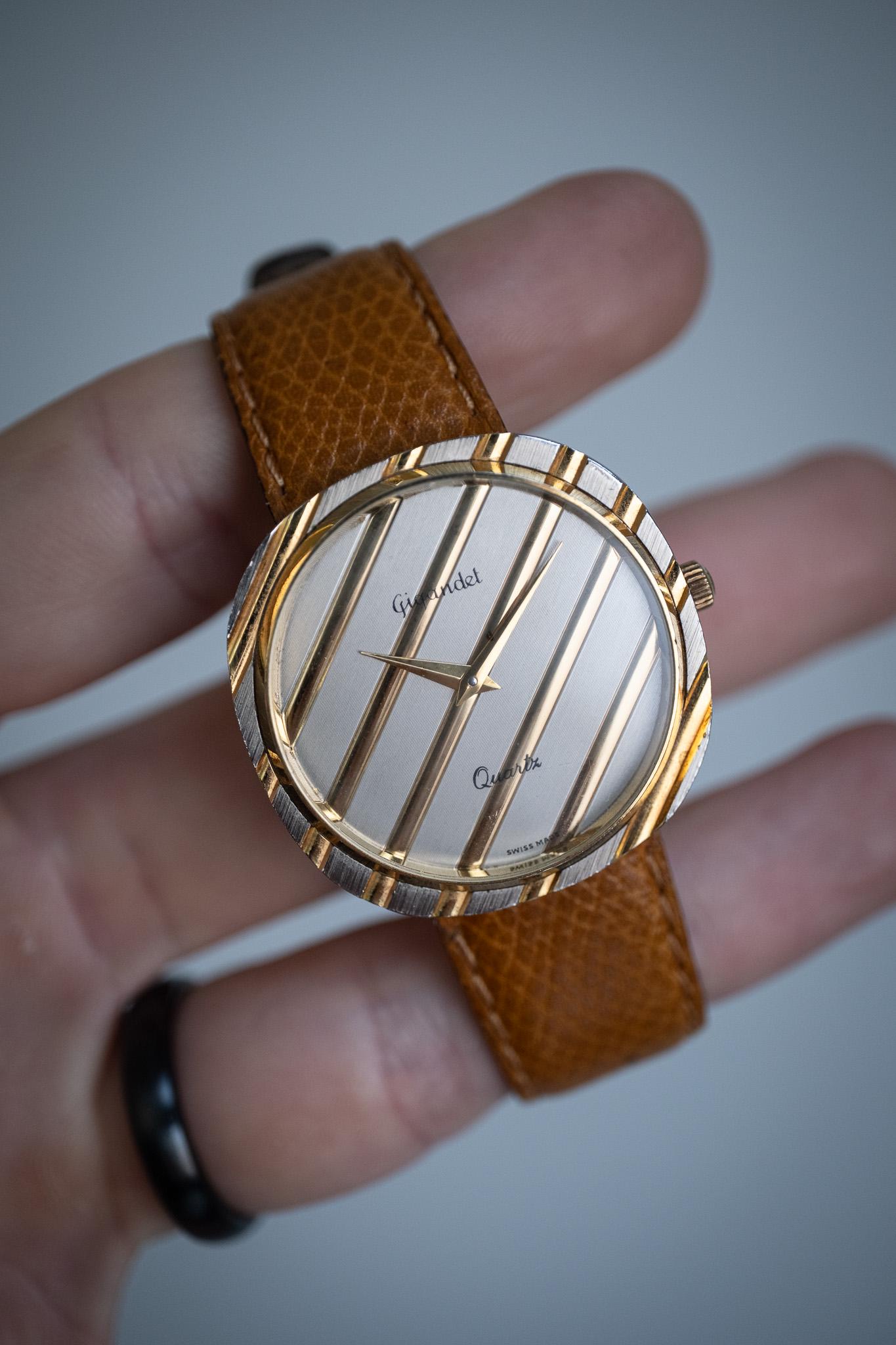 Timestamp and video: [https://imgur.com/a/qX10k6S](https://imgur.com/a/qX10k6S) This Gigandet "Polo" is likely from the late 80's or early 90's - when the inspiration for this piece was in its heyday. Gold plate and stainless make up the entirety of this watch. The banding runs at a 45 degree angle, which sets this model apart from some other Polo-inspired pieces. Due to the recessed lugs, this watch sits like a jewel on top of the wrist - it's definitely not trying to hide. This watch has presence, so don't be fooled by the measurements. Check out the vid to see what I mean. The case shows minor wear, but nothing egregious. More importantly, the dial and hands are perfect. Watch is running well on a new battery. Oh yeah - as a little surprise, this comes on a genuine Gucci strap + buckle. *Width: 32mm* *Lug to lug: 32mm* *Thickness: 6.9mm* $179 shipped in the US. You can find this watch and more on my [IG page](https://www.instagram.com/zachs_wrist_shop/). Don't hesitate to send me a chat with any questions!