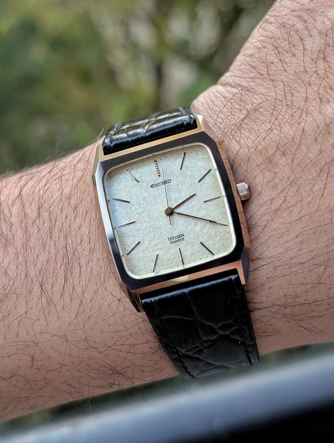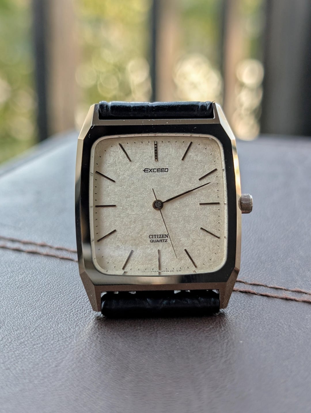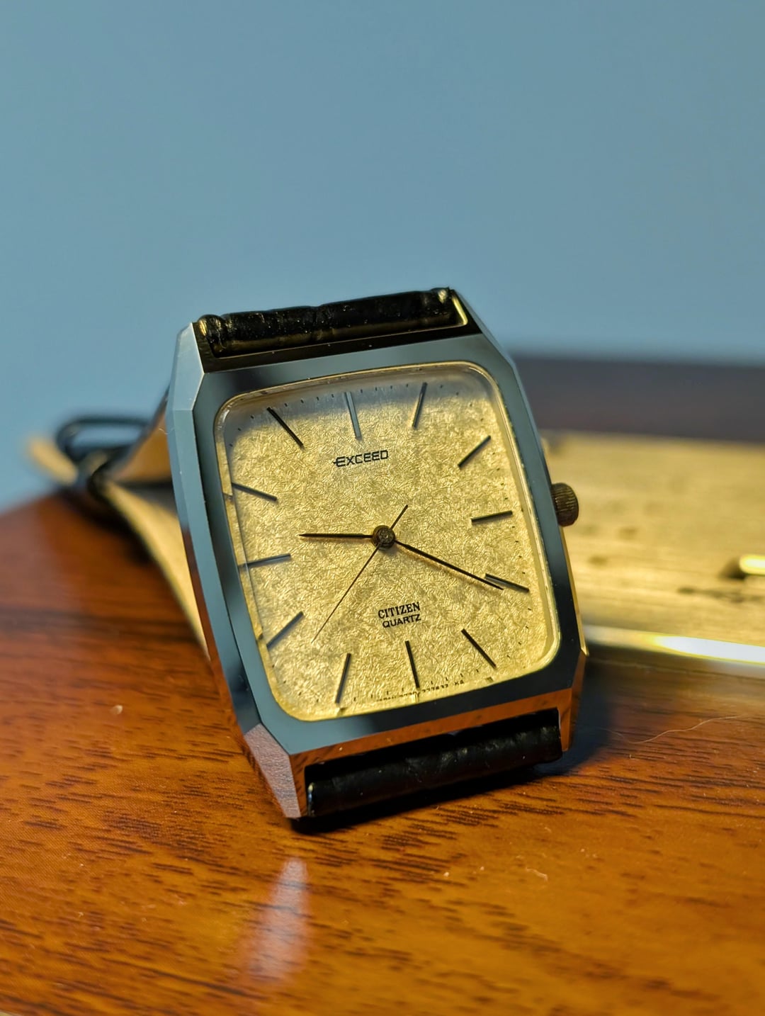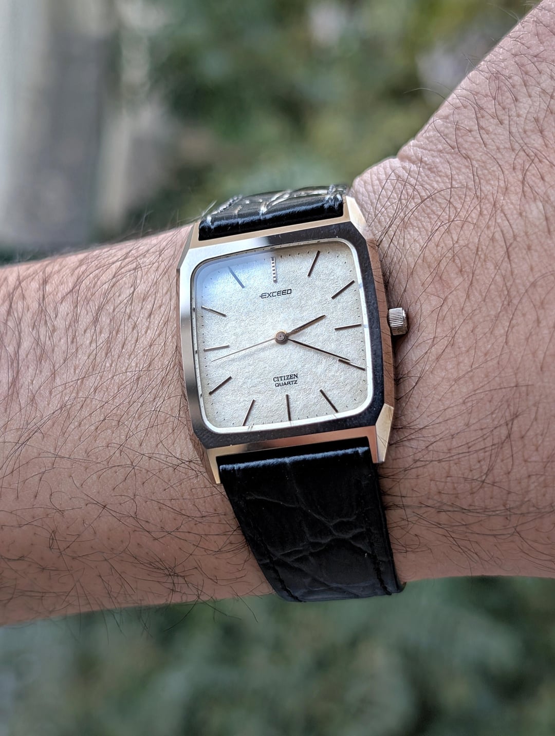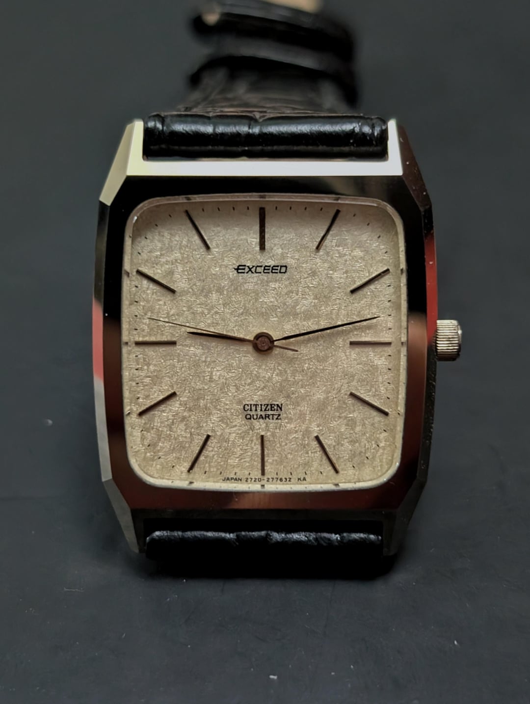 Greetings Watchexchange! Up for sale is a spectacular vintage Citizen Exceed with a titanium nitride ceramic case, sapphire crystal and a beautiful textured dial. These older Citizen Exceeds are very reminiscent of the Seiko Dolce watches of the era, and feature stunning faceted ceramic cases which are virtually scratch proof. The watch has a near mint case, scratch-less sapphire crystal and comes on an aftermarket 20mm leather strap. The watch has applied indices, with a perforated marker at 12 o'clock, and a signed crown with the "E" for Exceed. The dial has a beautiful almost woven texture, that plays well with light. The watch runs well, and has recently had a battery replacement. The watch is pictured on a 6.5" wrist for size reference. [Timestamp ](https://imgur.com/a/guxbwSJ) The watch is priced to sell at $175 shipped via UPS and paid via Zelle or Wise. Please allow 3 to 5 business days of your payment for the watch to be shipped out. Be sure to reach out to me if you have any questions or require additional photographs or information, I entertain requests for custom timestamps. Thanks for looking!