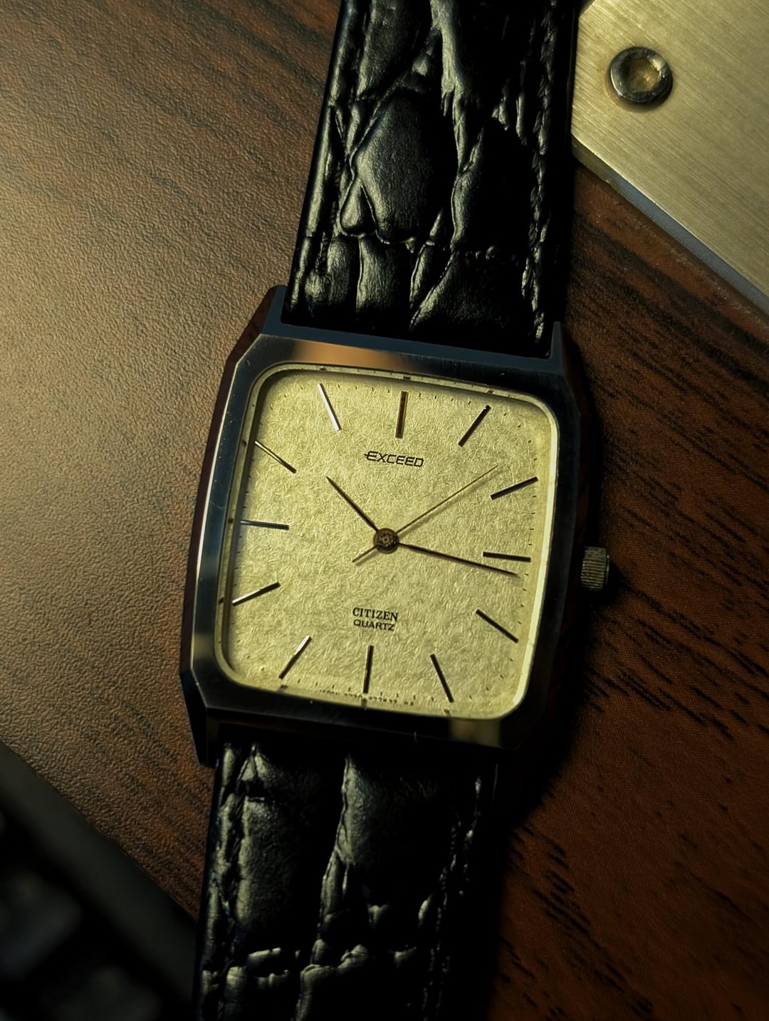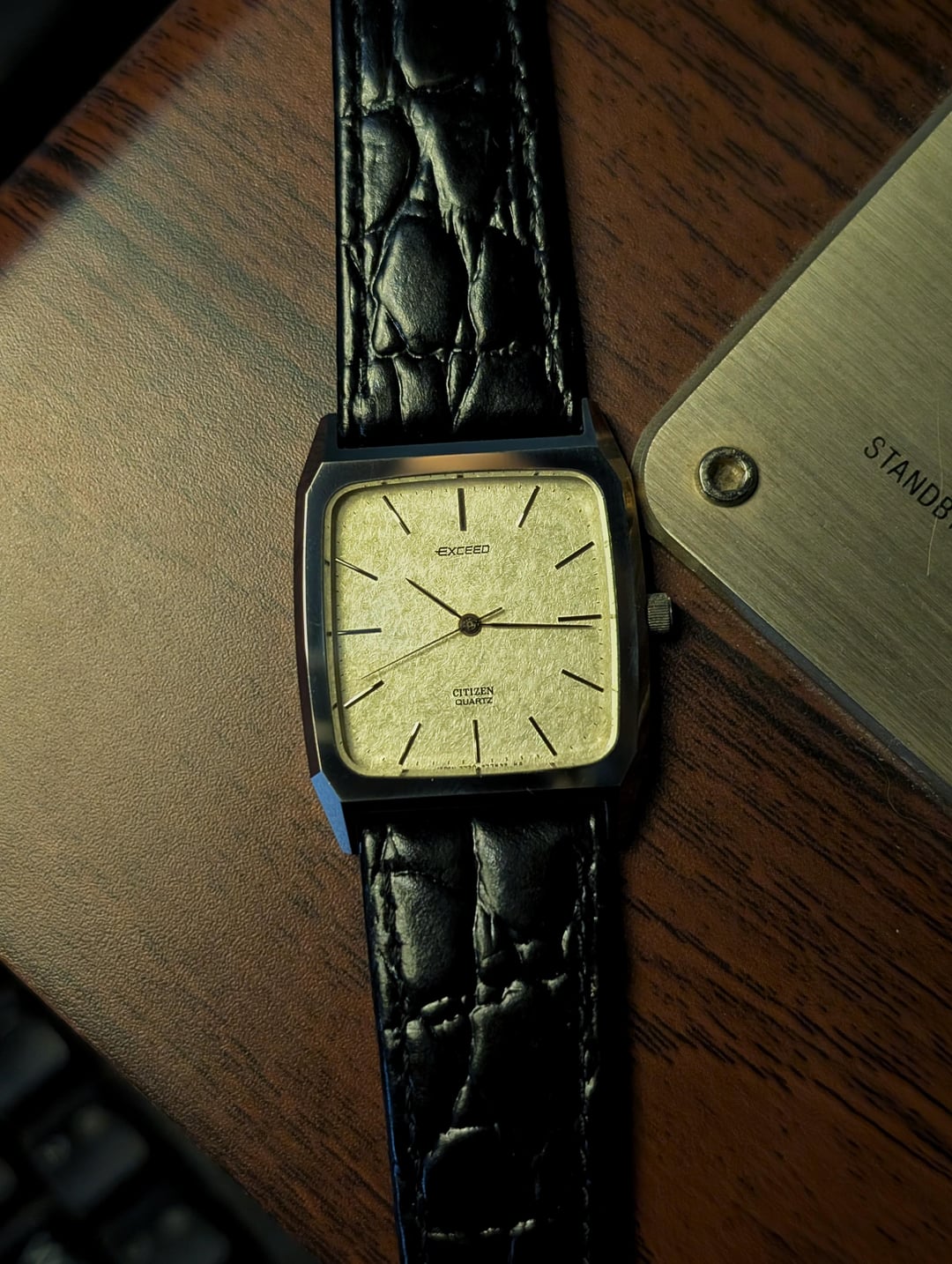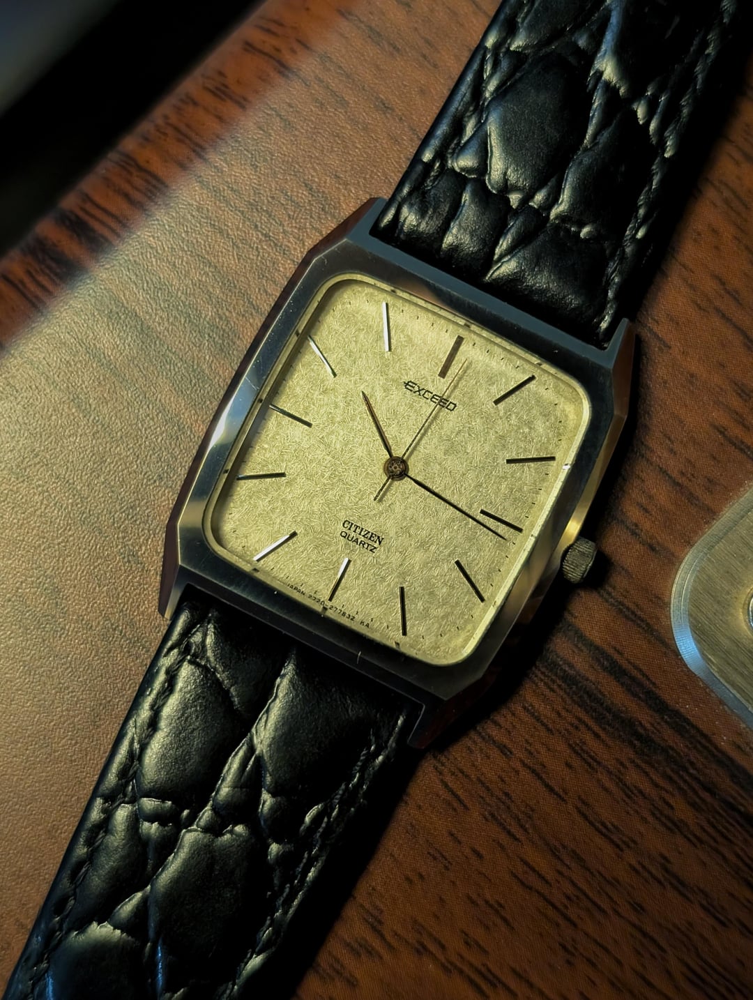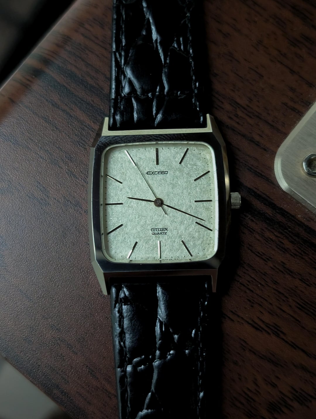 Greetings Watchexchange! Up for sale is a spectacular vintage Citizen Exceed with a titanium nitride ceramic case, sapphire crystal and a beautiful textured dial. These older Citizen Exceeds are very reminiscent of the Seiko Dolce watches of the era, and feature stunning faceted ceramic cases which are virtually scratch proof. The watch has a near mint case, scratch-less sapphire crystal and comes on an aftermarket 20mm leather strap. The watch has applied indices, with a perforated marker at 12 o'clock, and a signed crown with the "E" for Exceed. The dial has a beautiful almost woven texture, that plays well with light. The watch runs well, and has recently had a battery replacement. The watch is pictured on a 6.5" wrist for size reference. [Timestamp ](https://imgur.com/a/guxbwSJ) The watch is priced to sell at $175 shipped via UPS and paid via Zelle or Wise. Please allow 3 to 5 business days of your payment for the watch to be shipped out. Be sure to reach out to me if you have any questions or require additional photographs or information, I entertain requests for custom timestamps. Thanks for looking!