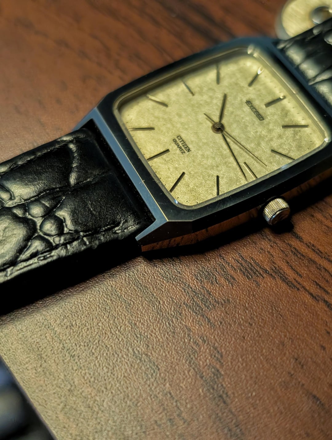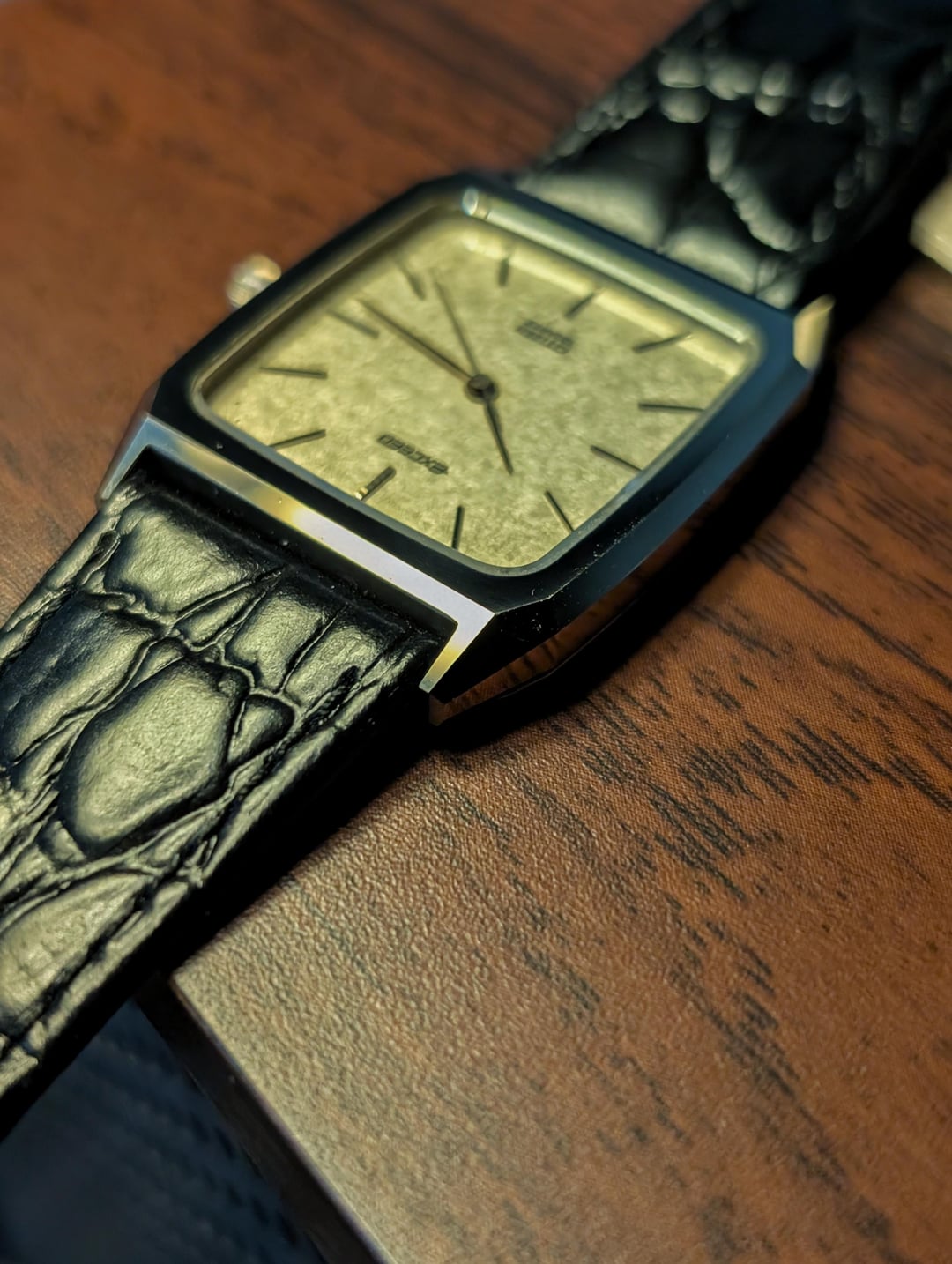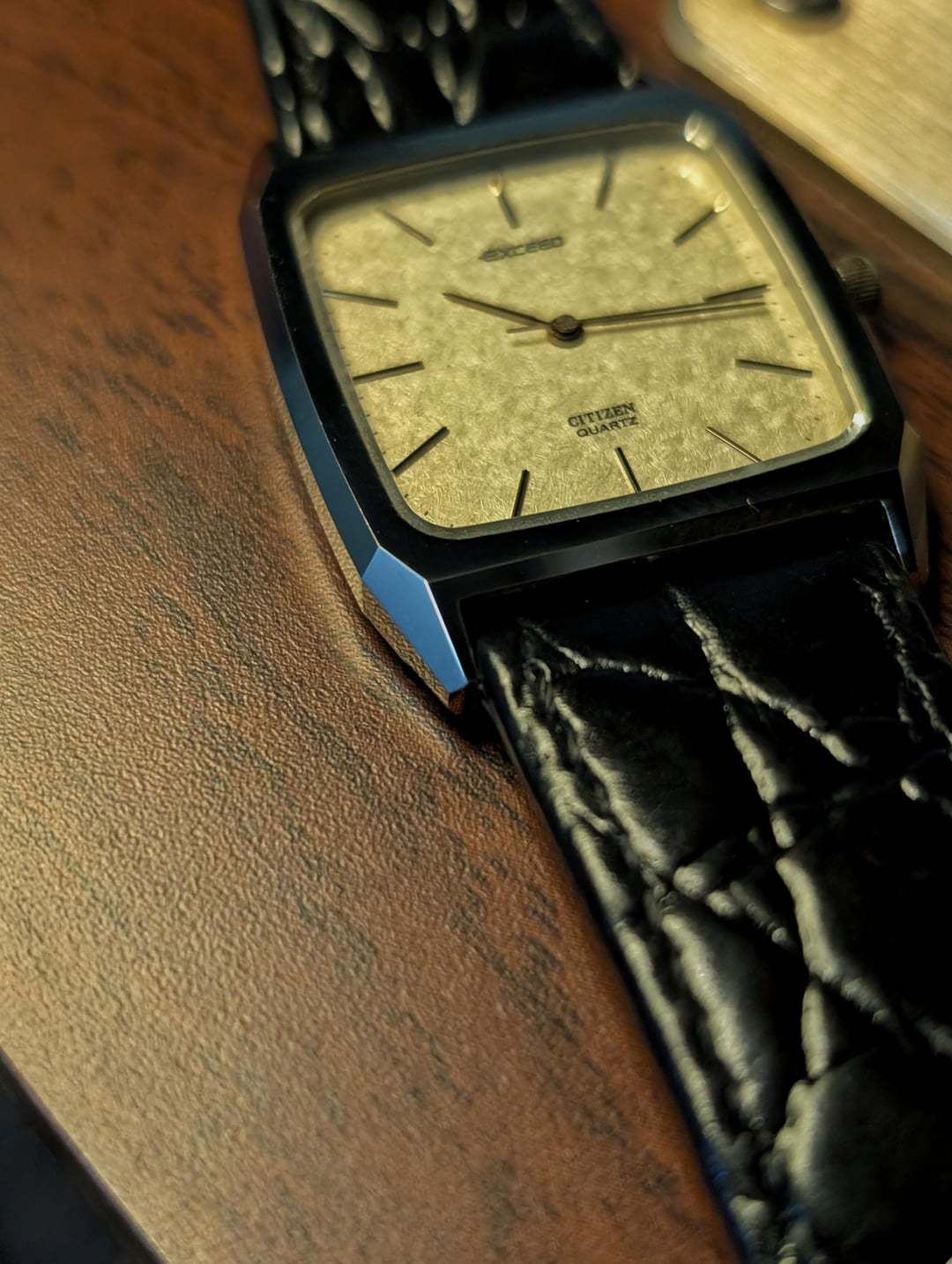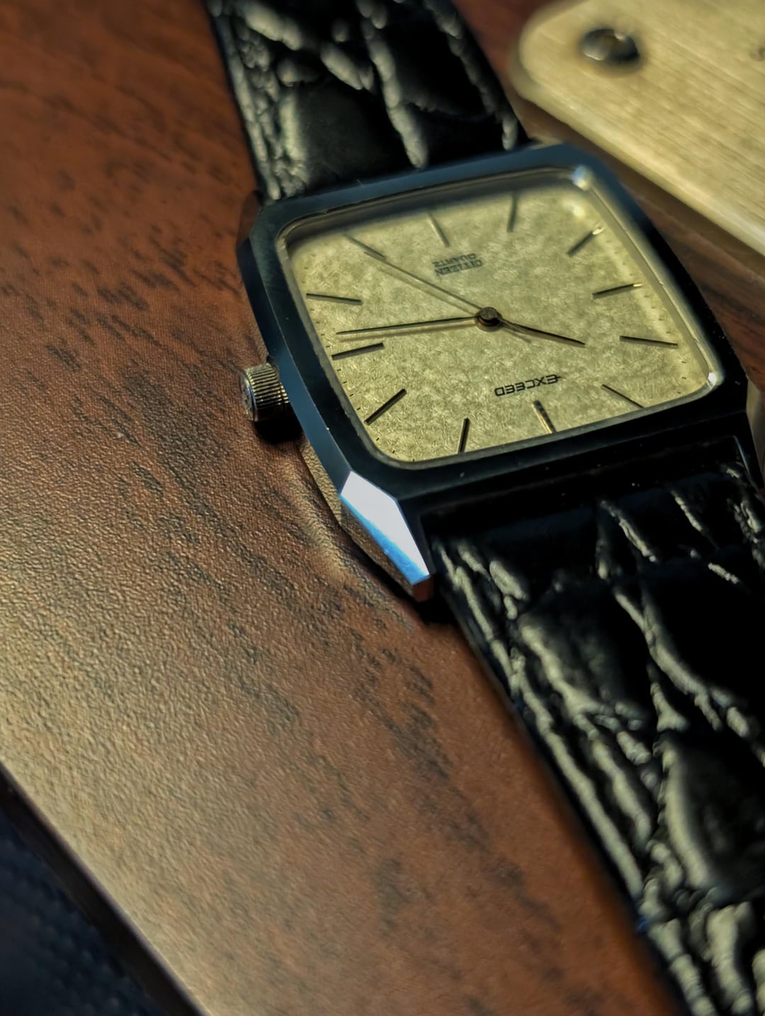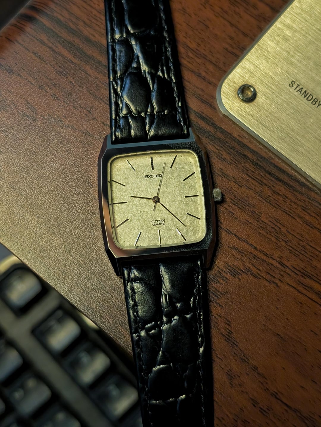 Greetings Watchexchange! Up for sale is a spectacular vintage Citizen Exceed with a titanium nitride ceramic case, sapphire crystal and a beautiful textured dial. These older Citizen Exceeds are very reminiscent of the Seiko Dolce watches of the era, and feature stunning faceted ceramic cases which are virtually scratch proof. The watch has a near mint case, scratch-less sapphire crystal and comes on an aftermarket 20mm leather strap. The watch has applied indices, with a perforated marker at 12 o'clock, and a signed crown with the "E" for Exceed. The dial has a beautiful almost woven texture, that plays well with light. The watch runs well, and has recently had a battery replacement. The watch is pictured on a 6.5" wrist for size reference. [Timestamp ](https://imgur.com/a/guxbwSJ) The watch is priced to sell at $175 shipped via UPS and paid via Zelle or Wise. Please allow 3 to 5 business days of your payment for the watch to be shipped out. Be sure to reach out to me if you have any questions or require additional photographs or information, I entertain requests for custom timestamps. Thanks for looking!