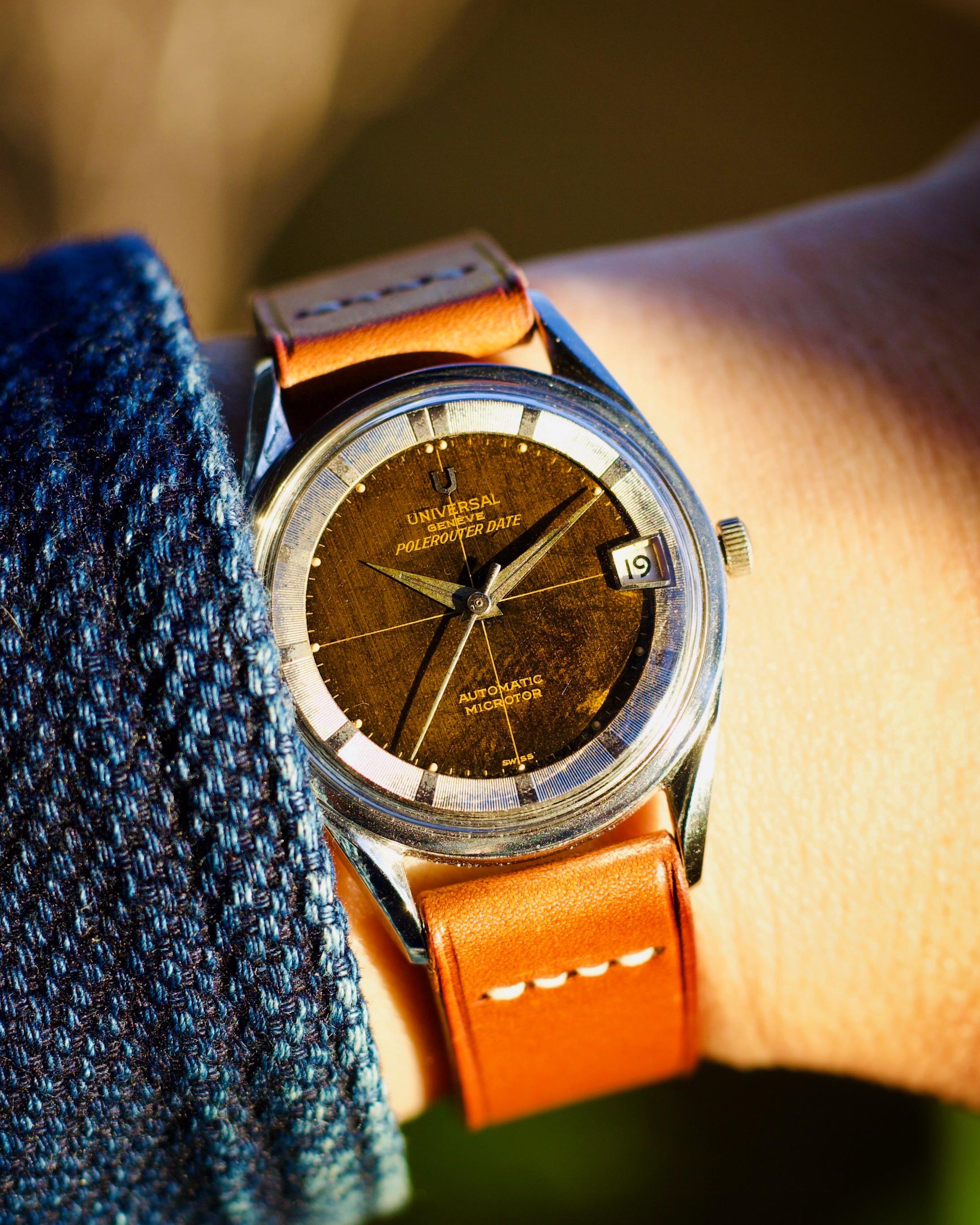 Universal Geneve Tropical Polerouter Date ref. 204503-2BD There are Polerouters and there are is the Polerouter. While there is buzz surrounding the recent acquisition of UG by Breitling, nothing beats vintage. The “Clapton” and the Polerouter are double dragon leading the brand but the Polerouter is desirable in tropical spidering form with trapezoid date window. The dial color is a toffee chocolate sprinkled with turmeric— Even better this one was locally serviced around 2023. video and timegrapher: https://imgur.com/a/vWK6XK7 • 35mm twisted lug case X 43h X 18mm strap • unsigned crown—common as many needed to be swapped - local special: can possibly accommodate at ButterScotch in Downtown Long Beach by appointment - All sales final unless the watch is misrepresented or lost in transit (always fully insured) - Link to [feedback here](https://www.reddit.com/r/WatchExchangeFeedback/search?q=soycowboy&restrict_sr=1&sort=new) & [watchcharts here](https://watchcharts.com/repcheck/user/soycowboy?source=reddit&type=feedback) Asking a *negotiable* **$4999** via bank wire, Zelle, venmo, or possibly PayPal Friends & Family with super strong references or if I know you. Price includes fully insured Fedex shipping in the USA— hand delivery in most of the Los Angeles or Orange County areas with drinks or coffee on me ;). Cheers, Stephen