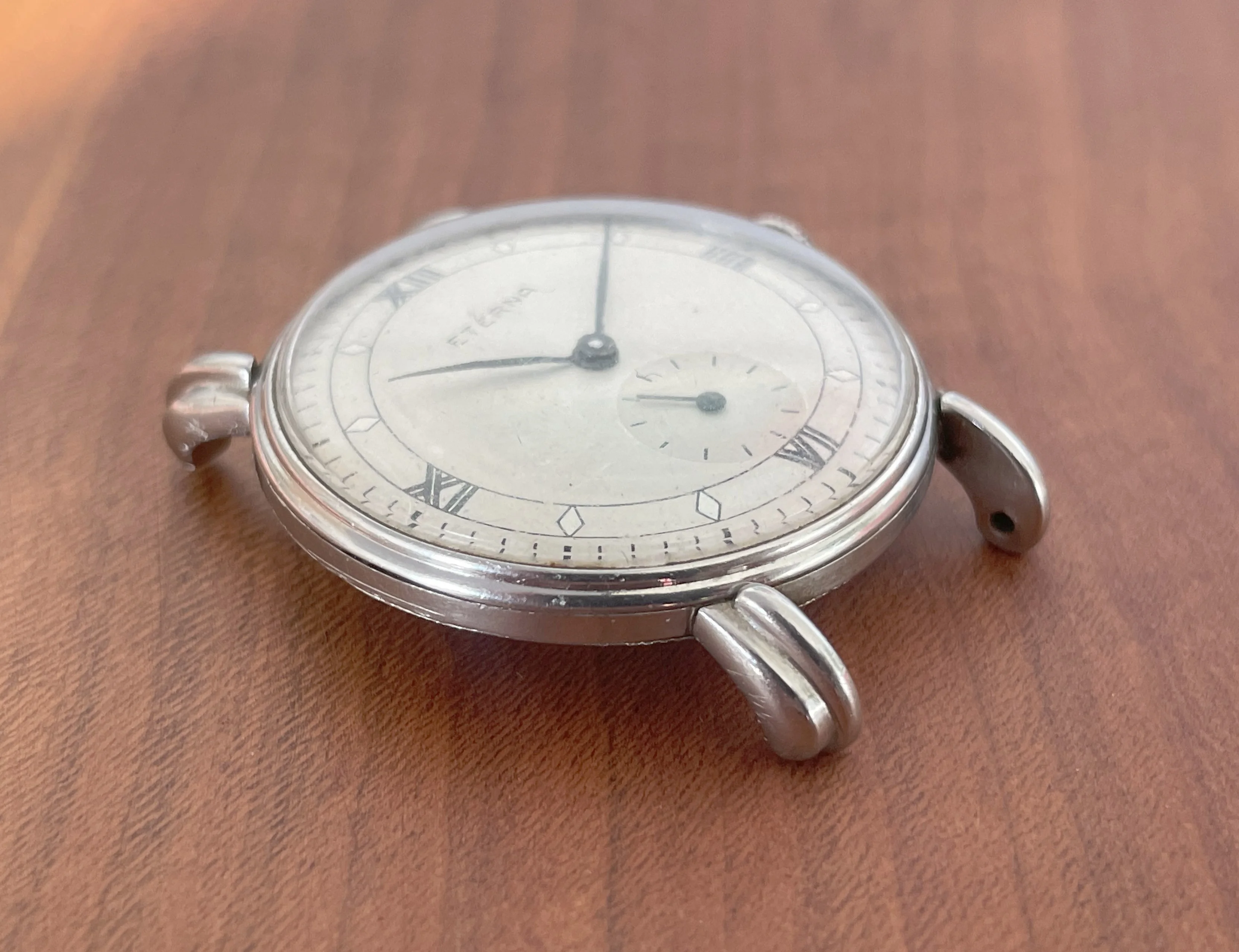 For sale is this 1940s Eterna with a fancy case and a nice dial design.