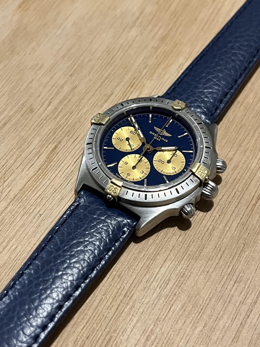 Hello WatchExchange, For sale is this beautiful Up Breitling Callisto Chronograph ref. 80520-1, in this fantastic deep blue colour with gold details. It features the same movement used in the Speedmaster pro, the Lemania 1873. This watch is in good overall condition. There is a flaw on the minutes hand, as pictured. The movement was serviced last year. Runs great. These were made from the mid-1980’s until the early 1990’s. It shares a very similar case design to the chronomat, but with mid-sized dimensions. The case size is 36mm not including the crown and has 18mm lug width. The watch sits nicely on a brand new leather strap that compliments the watch a lot. It comes with its original buckle. It also comes with the original bracelet that is in not so good condition. Original Box is also included but the inside material has pealed off a lot. Asking a reasonable 1250$ shipped and insured worldwide ! Located in Europe.