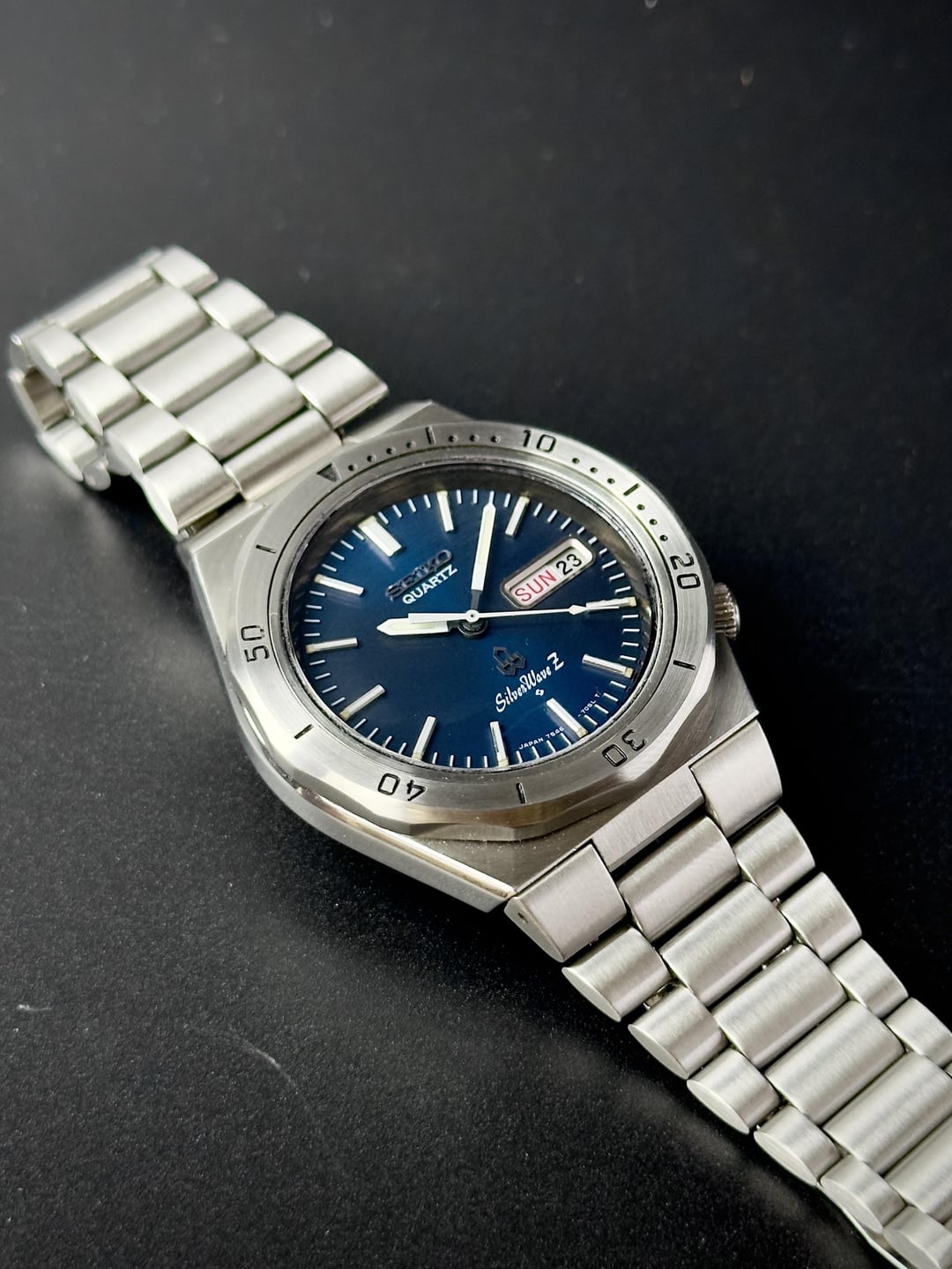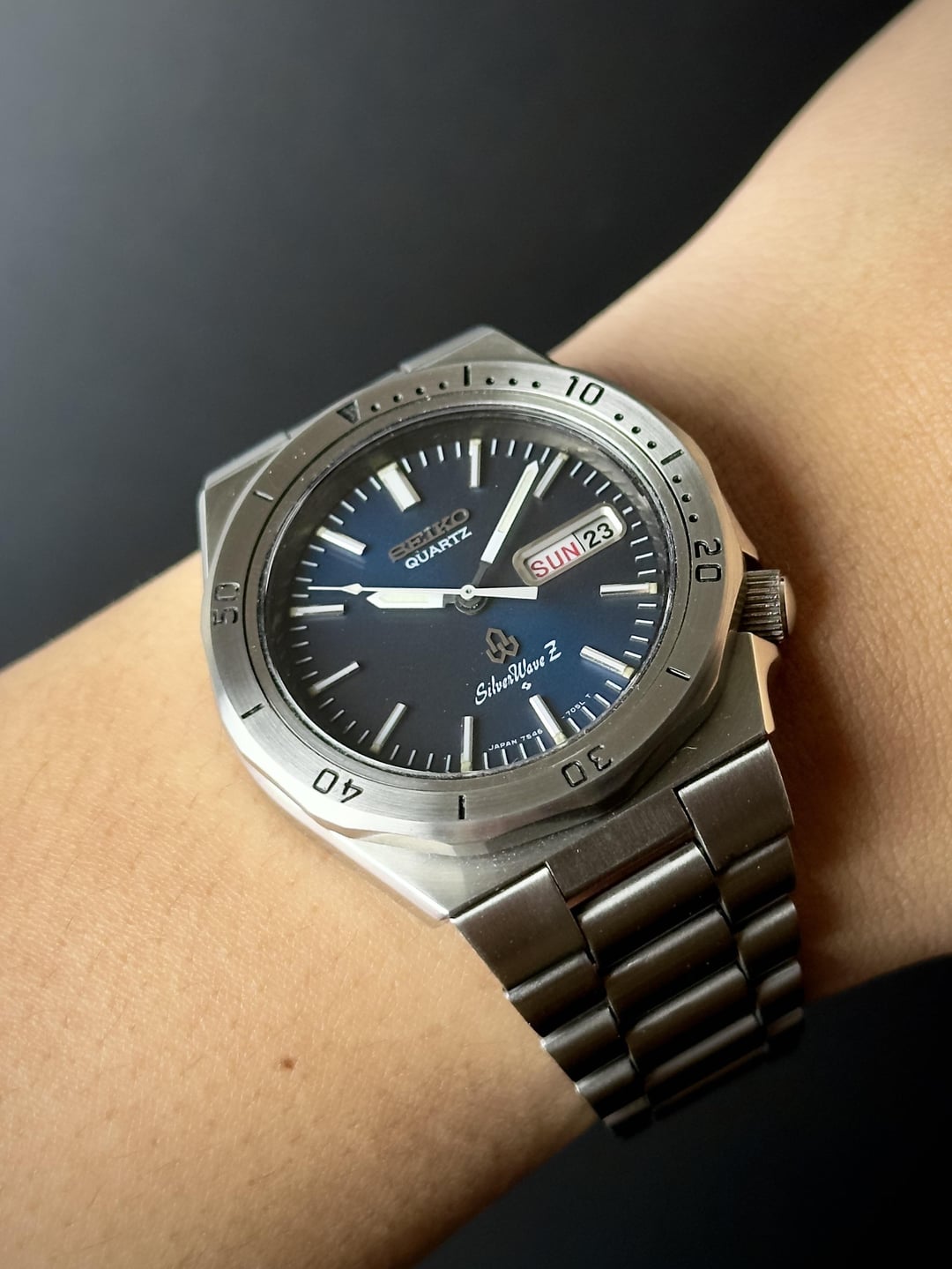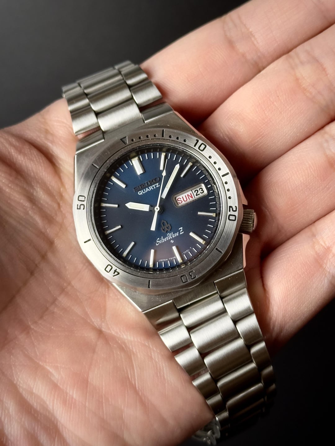 Up for sale is a Seiko 7546-7040, a standout piece from the SilverWave family—Seiko’s first line of watches built for diving in excellent condition Images: https://imgur.com/a/1ANyoux Timestamp: https://imgur.com/a/ki18ahg Video: https://imgur.com/a/DGspNUo What makes this one special is its space blue dial, which shifts in shade depending on the lighting. The crisp white printing and hands create a striking contrast, ensuring excellent legibility even in low-light conditions. The integrated lugs and dodecagon bezel give it a distinct luxury sports watch feel, reminiscent of Genta’s design language seen in the Royal Oak. Like most SilverWave models, this one comes with a screw-down crown and caseback, built for durability. And being a JDM model, it features the sought-after English/Kanji day wheel—a detail that collectors love. The watch is in excellent condition, with only a few minor hairline scratches visible upon close inspection. The bezel has been lightly polished to restore its shine without compromising its character. The movement has been cleaned, and a new battery has been installed, ensuring reliable performance. The bracelet comfortably fits wrists up to 18.5cm. It comes with a standard Seiko box. Price: $475 (shipping included). Payment via PayPal F&F or G&S (buyer covers +4.6% fee). No trades please. Feel free to message me with any questions or if you’re interested. Have a great day! Check out my other watches on Instagram: @jasonswatchcorner