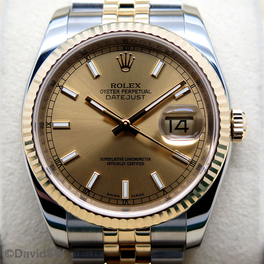 | Rolex DateJust 36mm CHAMPAGNE 18K Gold Fluted Steel SUPER JUBILEE 116233 Watch collectorswatches (8899) |