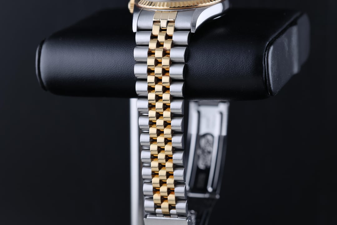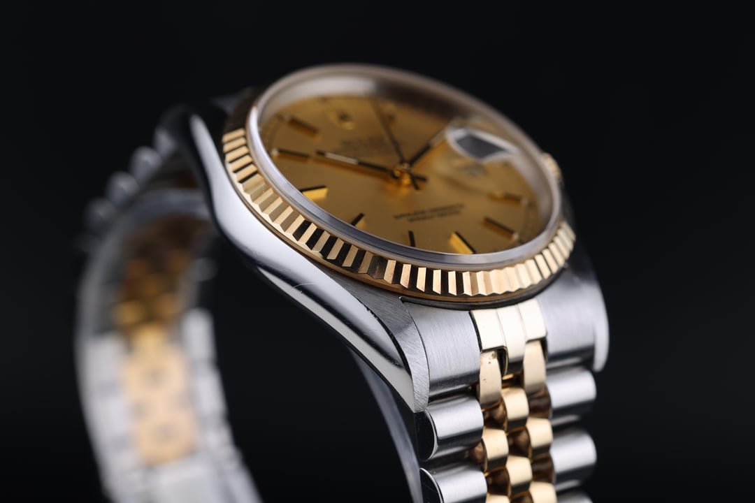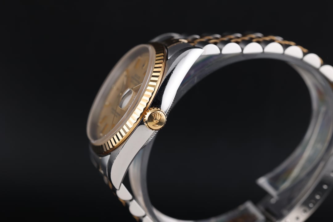 A timeless expression of elegance, the Rolex Datejust 16233 combines the enduring appeal of a two-tone steel and 18k yellow gold construction with a warm champagne dial, embodying the perfect balance of refinement and versatility. The dial presents a rich golden hue that plays beautifully with the fluted bezel, while the applied indices and crisp black minute track maintain legibility and classic charm. Housed within the 36mm Oyster case, this reference features the automatic Rolex Caliber 3135, known for its precision, durability, and quickset date function, allowing for easy adjustments. This piece is in excellent condition, with a tight Jubilee bracelet, sizable to a 7.25-inch wrist. Accompanied by its original Japanese papers, this Datejust offers a fantastic blend of collectibility and wearability. Yours for $5750 via bank wire. Have references on WUS, Reddit, TRF, and 100% feedback on eBay. You can reach me via PM / [[email protected]](mailto:[email protected]). Follow me @ [www.timepiecetreasurebox.com](http://www.timepiecetreasurebox.com), on IG @ [timepiece\_treasure\_box](https://www.instagram.com/timepiece_treasure_box/), or on FB @ [Timepiece Treasure Box](https://www.facebook.com/profile.php?id=61566943652417). Thanks for looking.