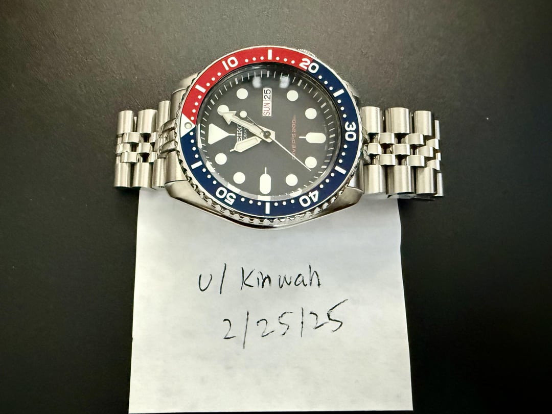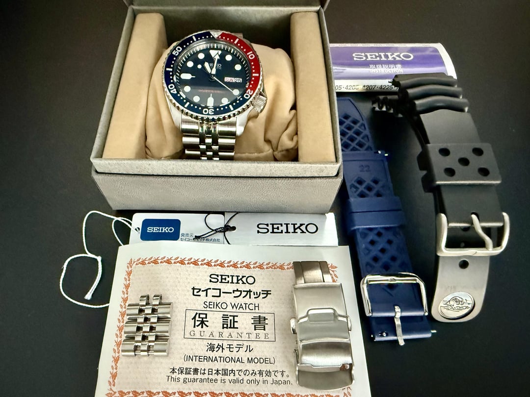 Selling this SKX009 I purchased from eBay in 2019 from a Japanese seller. I bought this new and it came with the original rubber strap. Watch comes with aftermarket jubilee bracelet that's sized for my 6.5" wrist (I also installed a strapcode clasp with on the fly microadjust and also included the original clasp as well), extra 3 jubilee links, original rubber straps (never worn, but missing 1 spring bar), blue aftermarket rubber straps. Comes with box, international Japanese warranty, hang tags, and manual. Brand: Seiko Model: SKX009K1 (SKX009KC in Japanese market) Case diameter: 42mm Case thickness: 13mm Lug width: 22mm Box & Papers: Yes, see description above Condition: Overall great condition, no scratches on the glass and very minor ones on the bezel, some scratches on the polished sides of the case but no big dents or scuffs. Bracelet is also in good condition with some minor scratching from usage. Watch runs well but due to it being a non-hacking movement, I'm unable to really time the watch. Price: $275 Payment: Zelle Trades: No If you have any questions, please don't hesitate to ask, I can also send videos if you request one.
