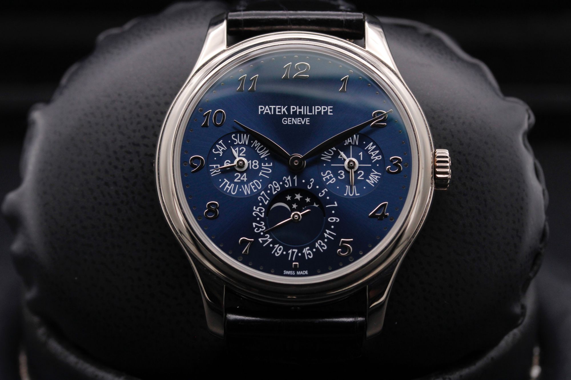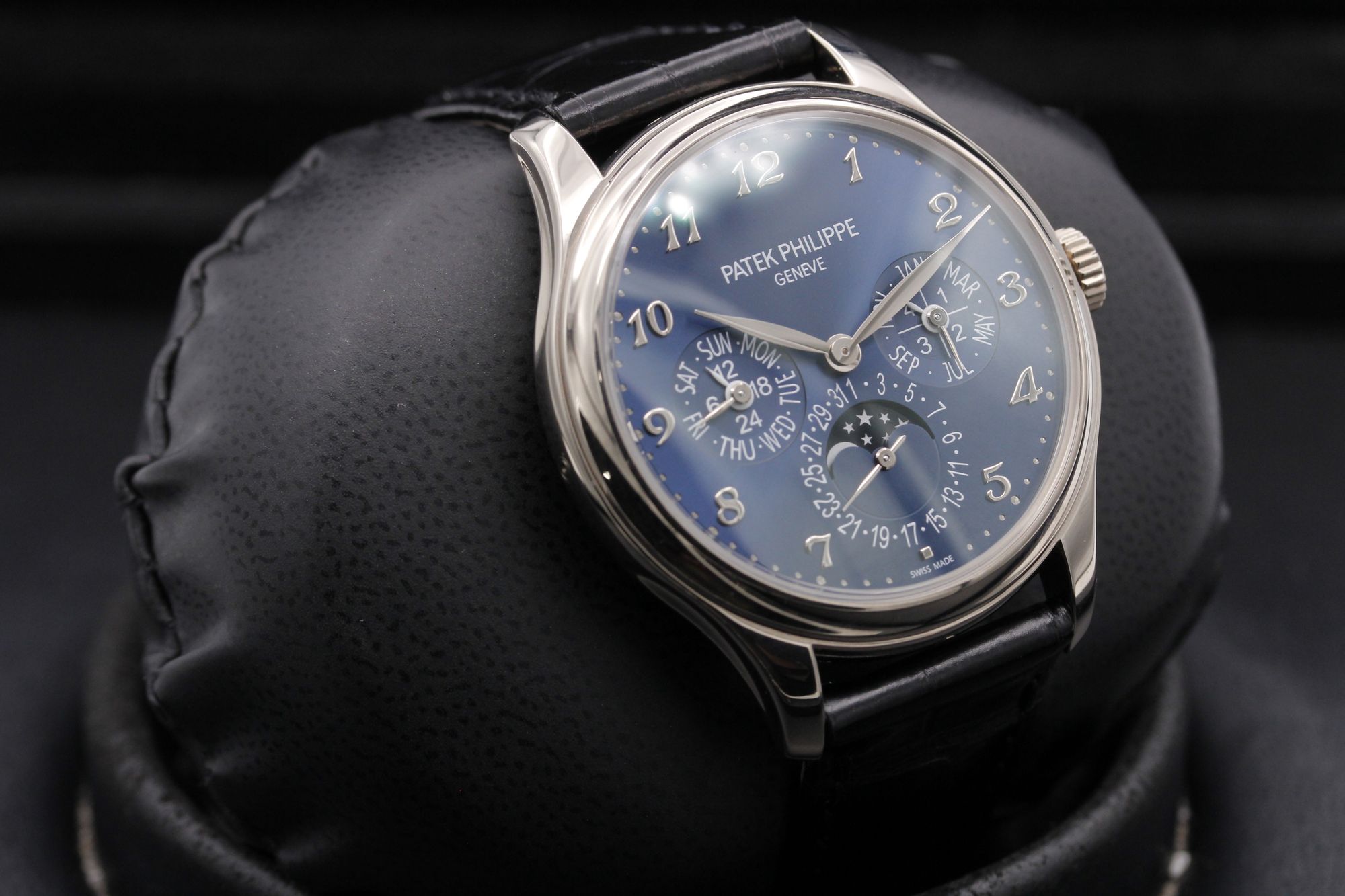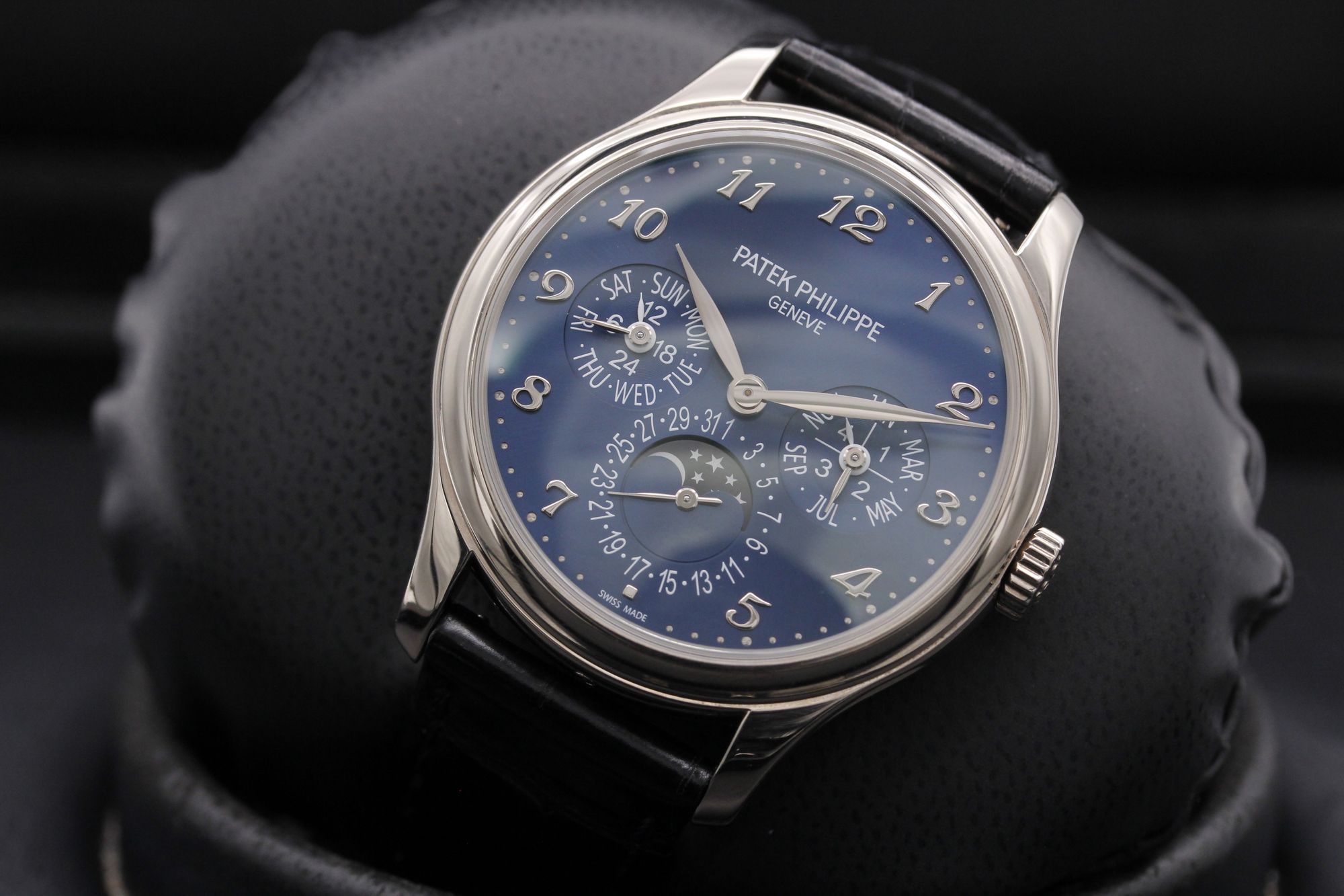 Brand: Patek Philippe Model: Perpetual Calendar Case Size: 39mm Condition: Pre-Owned Grade: Excellent Bracelet Type: Alligator Strap w. White Gold Deployant Buckle Material: White Gold Dial: Blue Age: Modern Movement: Automatic Papers: Yes Box: Yes Reference: 5327G-001 Additional Notes: Certificate Dated - September 2019