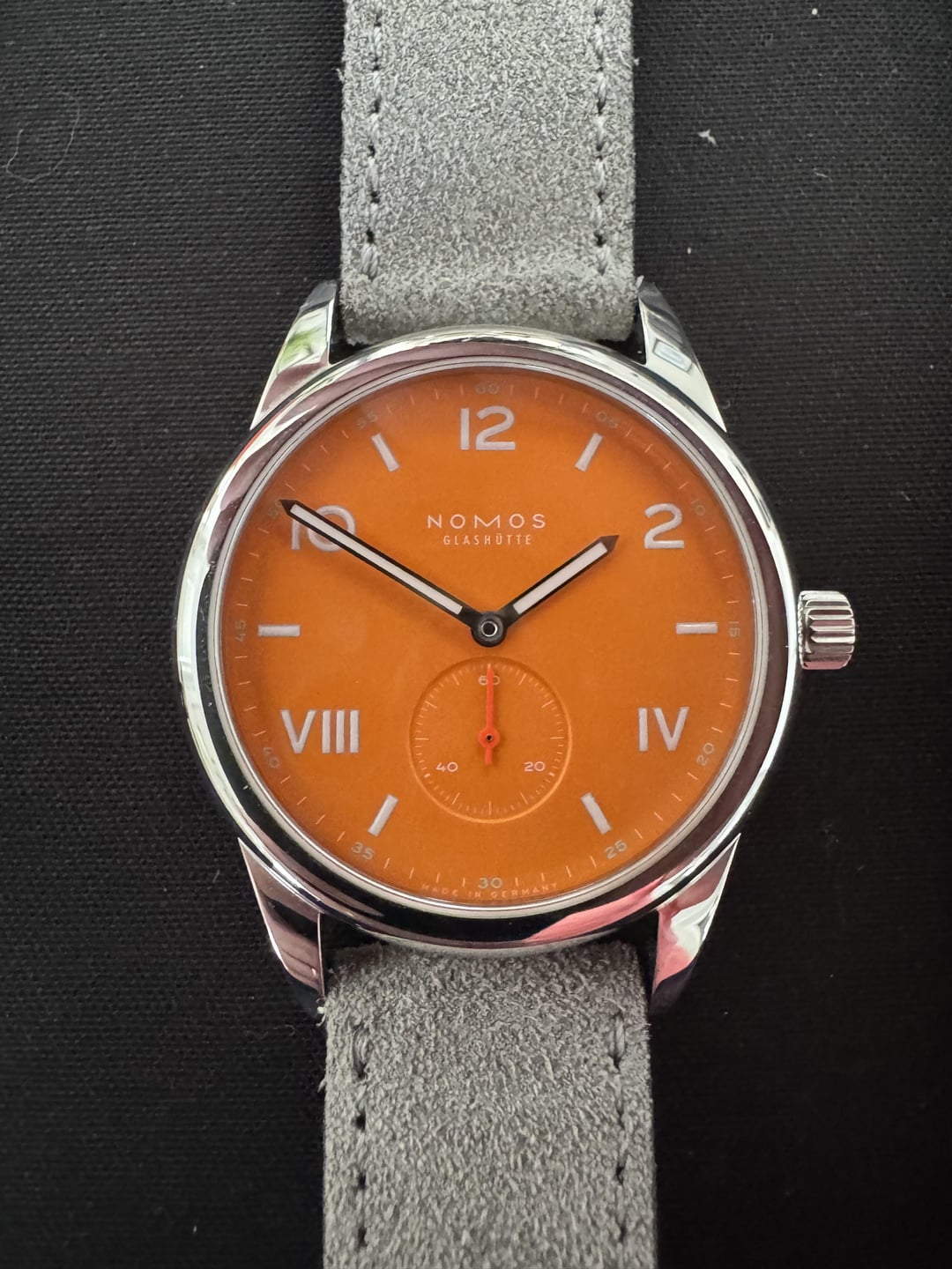 I'm selling this Nomos Glashutte Club Campus 38mm Future Orange to fund another purchase. This watch is in excellent condition. Comes with an extra Nomos strap and box and papers. Reference - 729 Dial - Orange, Arabic and Roman numerals and indexes with white superluminova (blue luminescence) Case - Stainless steel, stainless steel back Diameter - 38.5 mm Height - 8.5 mm Lug-to-lug - 48.9 mm Glass - domed sapphire crystal Movement - Alpha, manual winding Water resistance - 10 atm Details of the watch can be found here - [Club Campus 38 Future Orange](https://nomos-glashuette.com/en/club/club-campus-38-future-orange-729) I'm asking $975 shipped CONUS. Zelle, PayPal F&F, and Venmo F&F with good transaction history. No trades so no need to ask! Let me know if you have any questions. Happy to do FaceTime or provide more pics upon request.