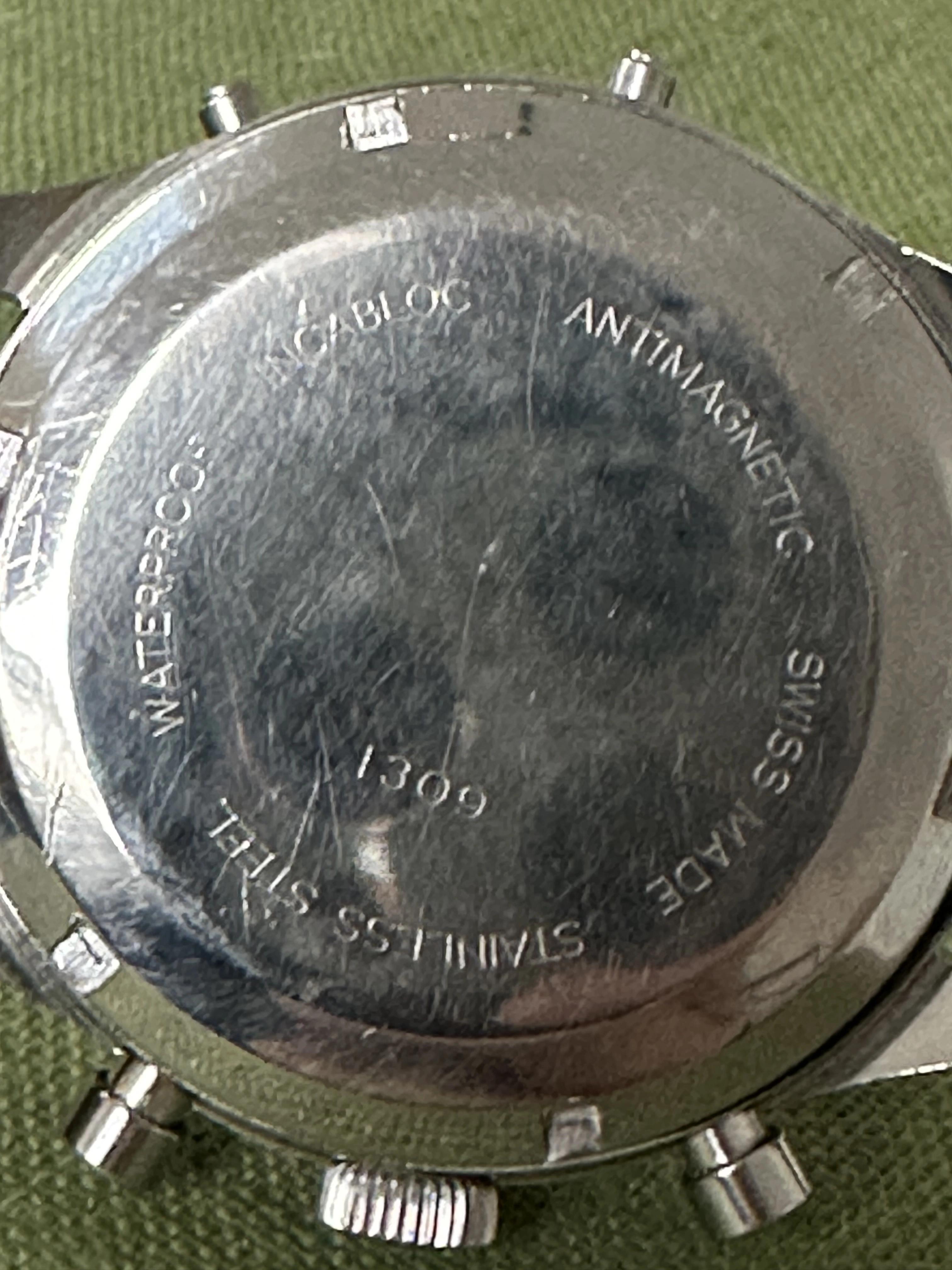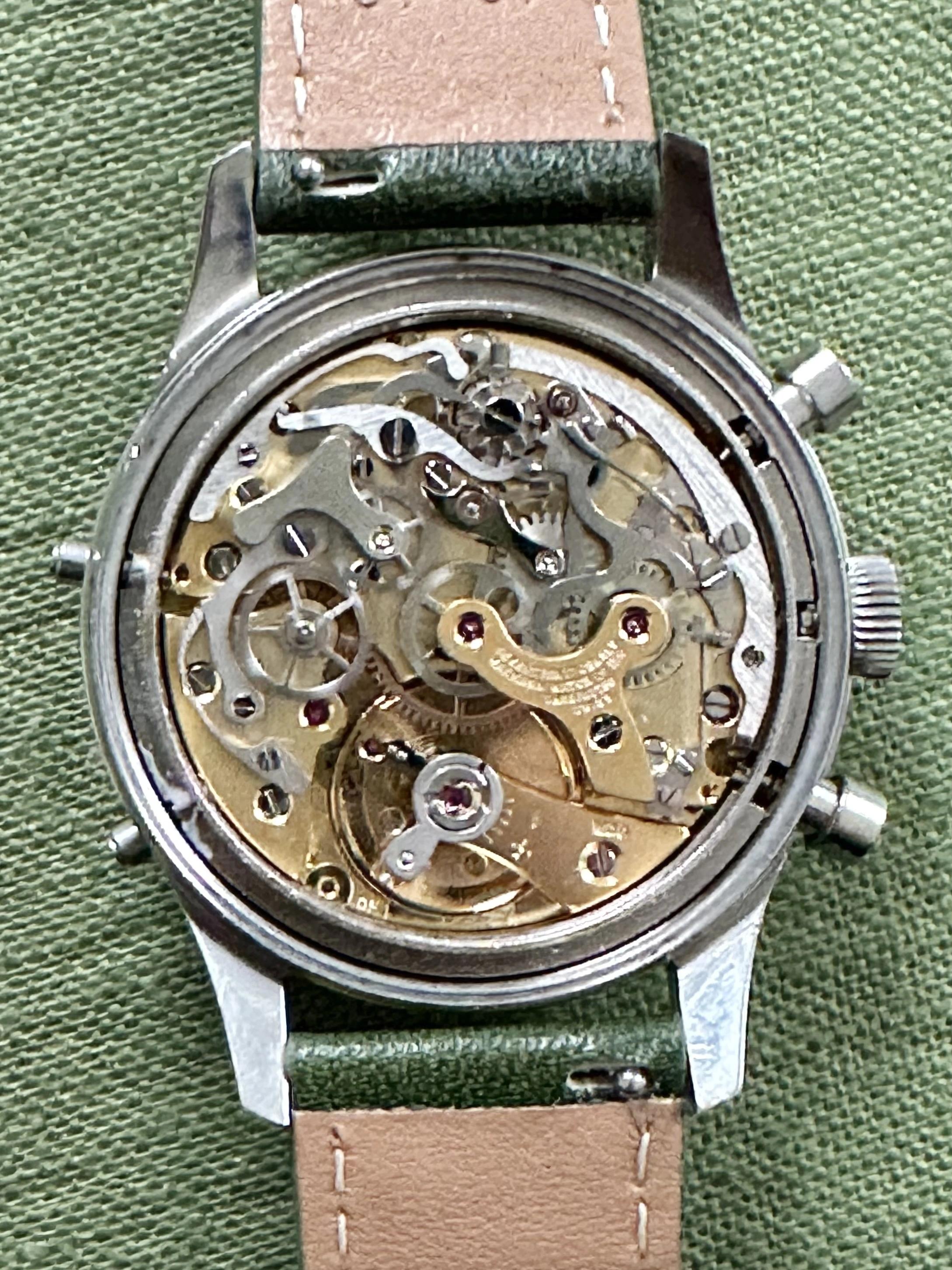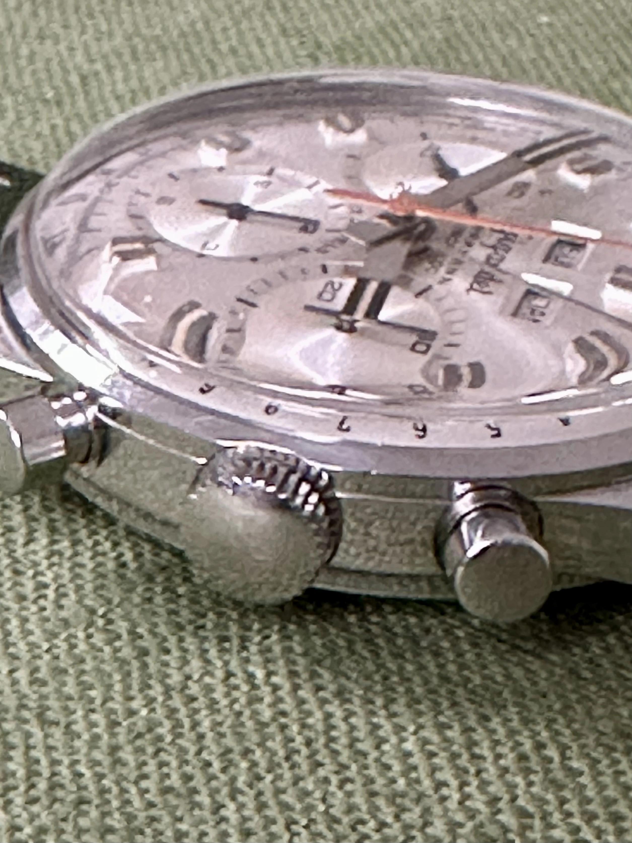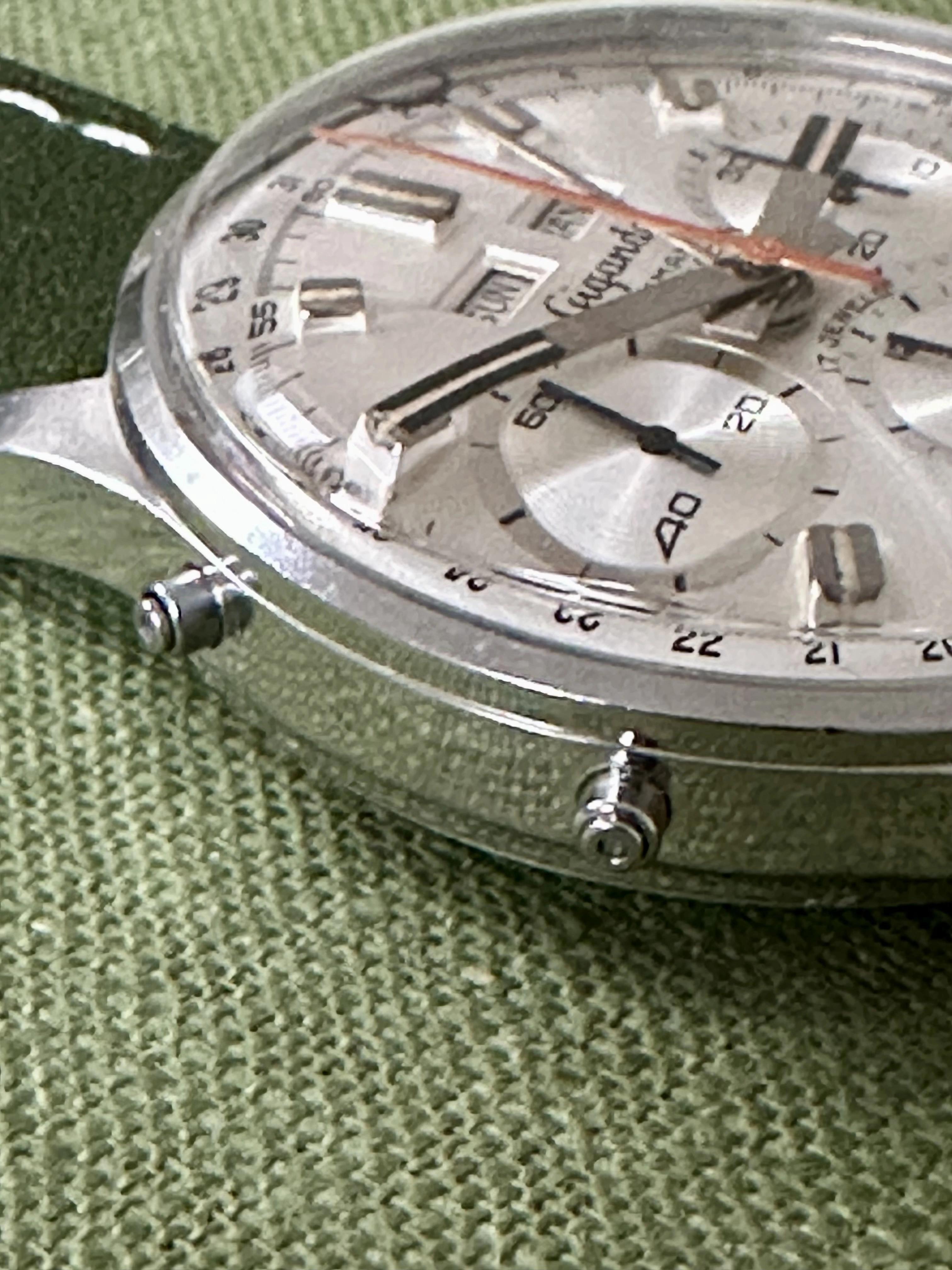 This Gigandet Wakmann Triple-Date calendar is a perfect example of design that works. Beautiful clean silvered dial with tritium indices catches the light really well. Dial is in great condition. Dual Branded Walkman and Gigandet. Stainless steel case measures 37mm in diameter but wears very large as there is no bezel and the dial goes close to the case edge. The BEAUTIFUL Valjoux 723 movement has been serviced last week .
