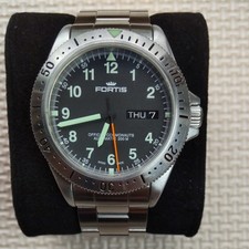 Complete overhaul was done in August 2024, receipt included. Timegrapher shows -1 up to +2 sec/day. Crystal looks great. Bezel inserts look good, bezel around shows some wear. Case shows wear, no major scratches. Lume works just as it did when it was new, glows superb. Outter and inner box, papers, tag, everything included. Fortis Leather strap, Non Fortis Nato strap, Non Fortis leather Nato strap. Both Nato straps have original Fortis buckles. As you can tell, I've never done this. 25 years on Ebay (username: lincoln.nebraska), lots of positive feedback (100%) asking $1200.