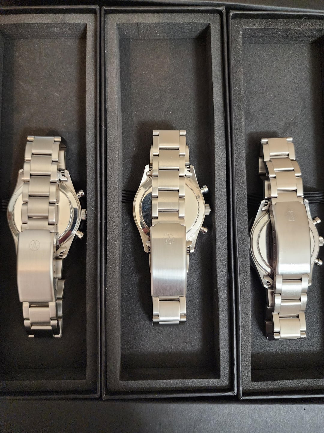 Offering 3 sold out Vintage Rally Timers. Would love to sell together as a set but can split up as well. These are absolutely fantastic, and really capture the vintage chronograph design well, perfectly sized at 37-38mm (depending on where you measure). All 3 watches are in excellent condition, with some very light wear on the bracelets, and little or no visible wear on the watch heads. Each watch includes the original box, and all bracelet links. More pics available upon request. Specs: The VRT is powered by a rugged meca-quartz mechanism, resulting with a watch that combines the accuracy of quartz with the crisp feel and performance of a mechanical chronograph. Case diameter: 37mm (I measured approximately 38mm at the bezel) Case length: 44m Case thickness: 13.8mm (Includes crystal) Lug width: 20mm Crystal: Vintage inspired domed and round sapphire-coated mineral glass Depth 50 meters - 165 feet Price: $735 for all 3 shipped, or $245 each (before splitting them up I will let the ad run for a few days to see if anyone is interested in grabbing all 3) Payment method: Paypal F&F, or G&S (3% will be added to price) Location: Colorado Springs, USA No trades please