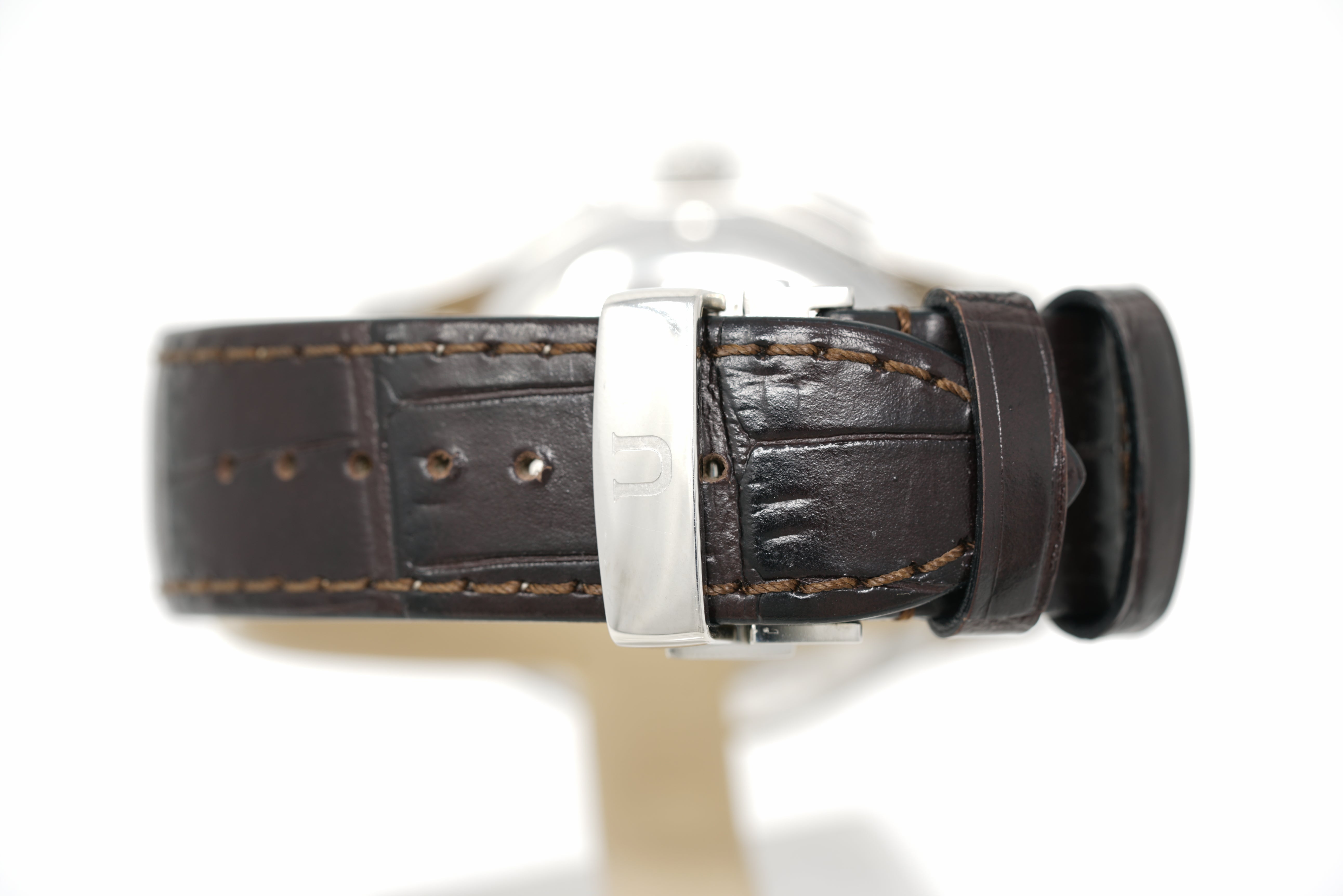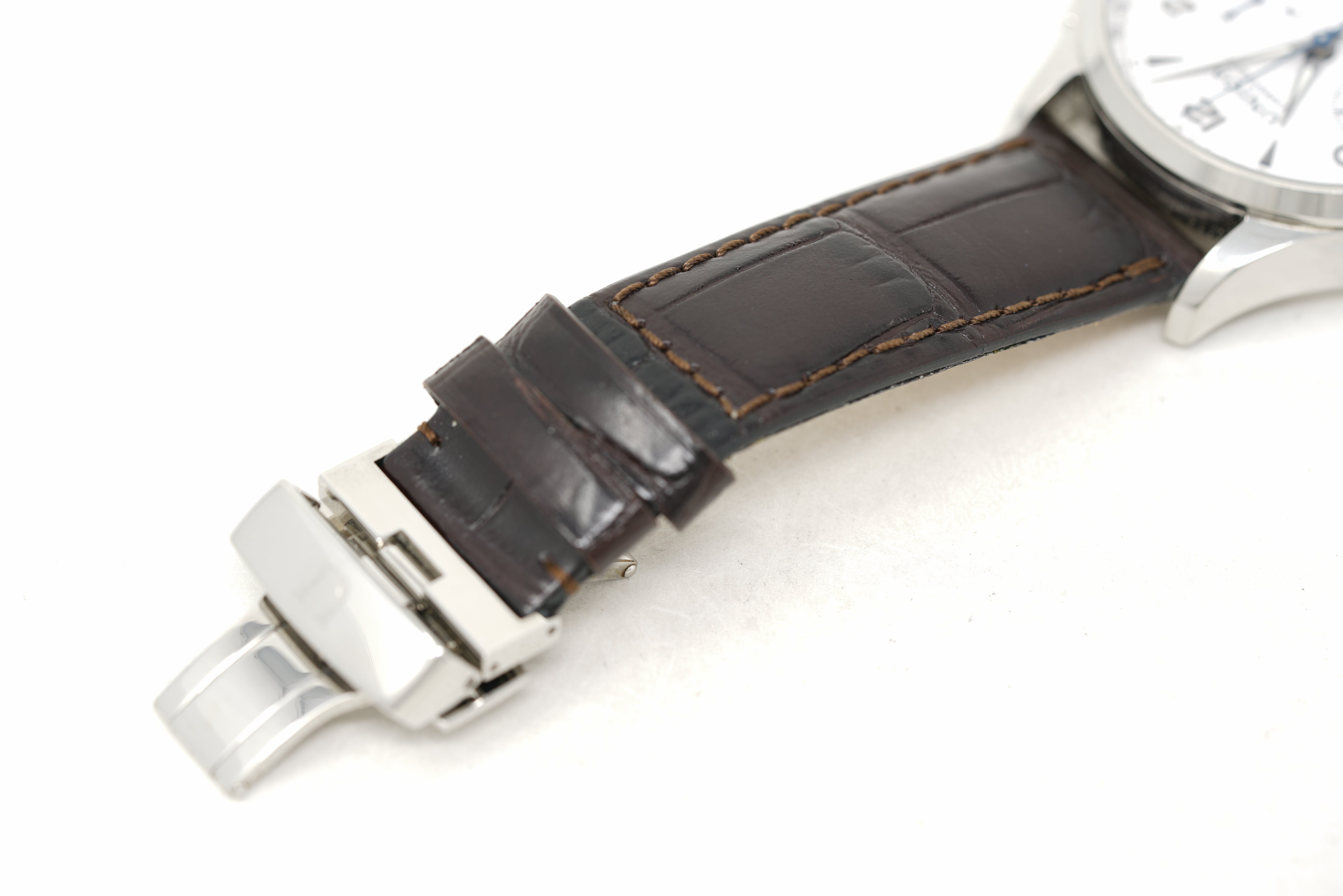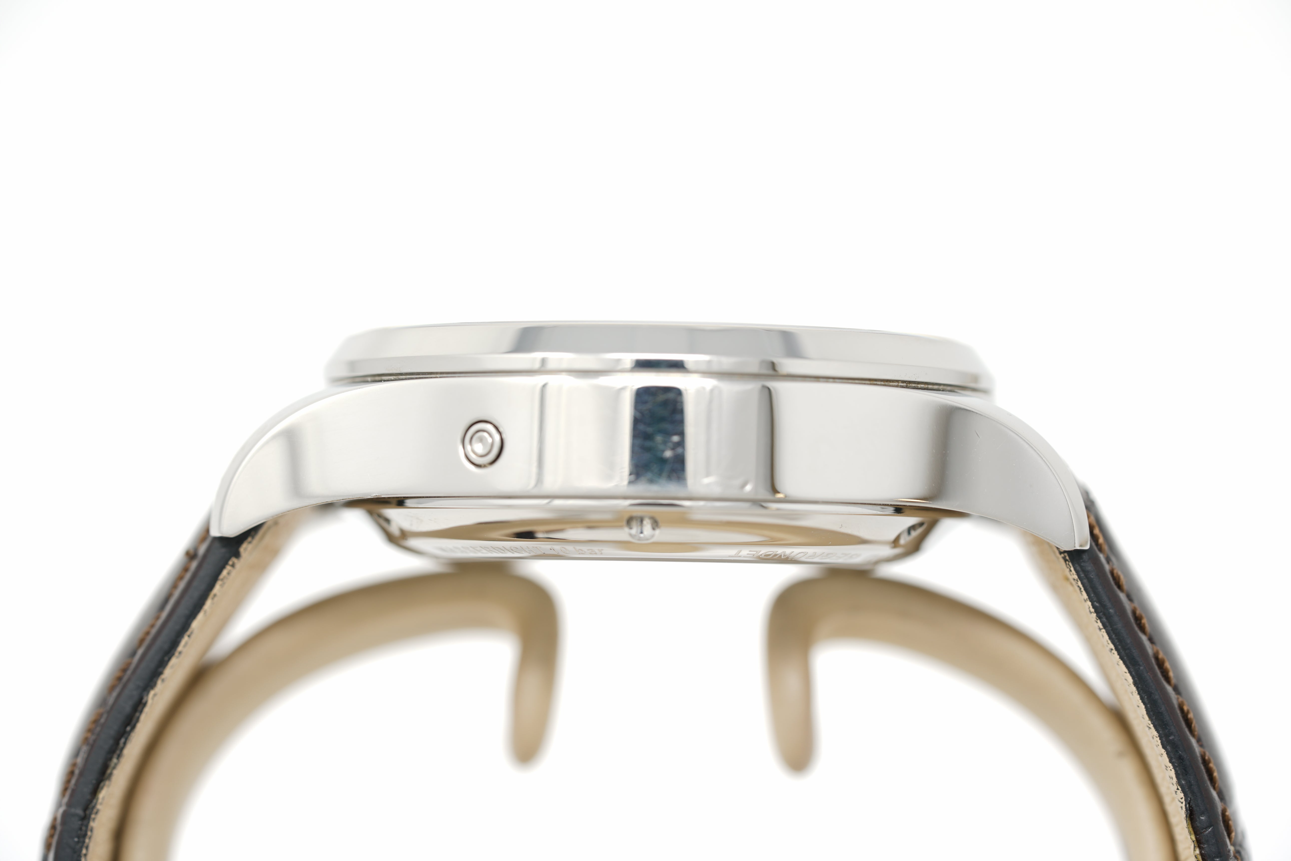 This pre-owned watch is in 80% condition due to marks on the lugs, bezel, and throughout the case (specifically a nick on the side of the case at 9 o'clock). The strap is in 86% condition due to slight creasing and marks on the clasp. Originally purchased in April 2016, this watch comes with its inner and outer box, instruction manual, warranty card, and the one-year Topper Pre-Owned Select warranty.