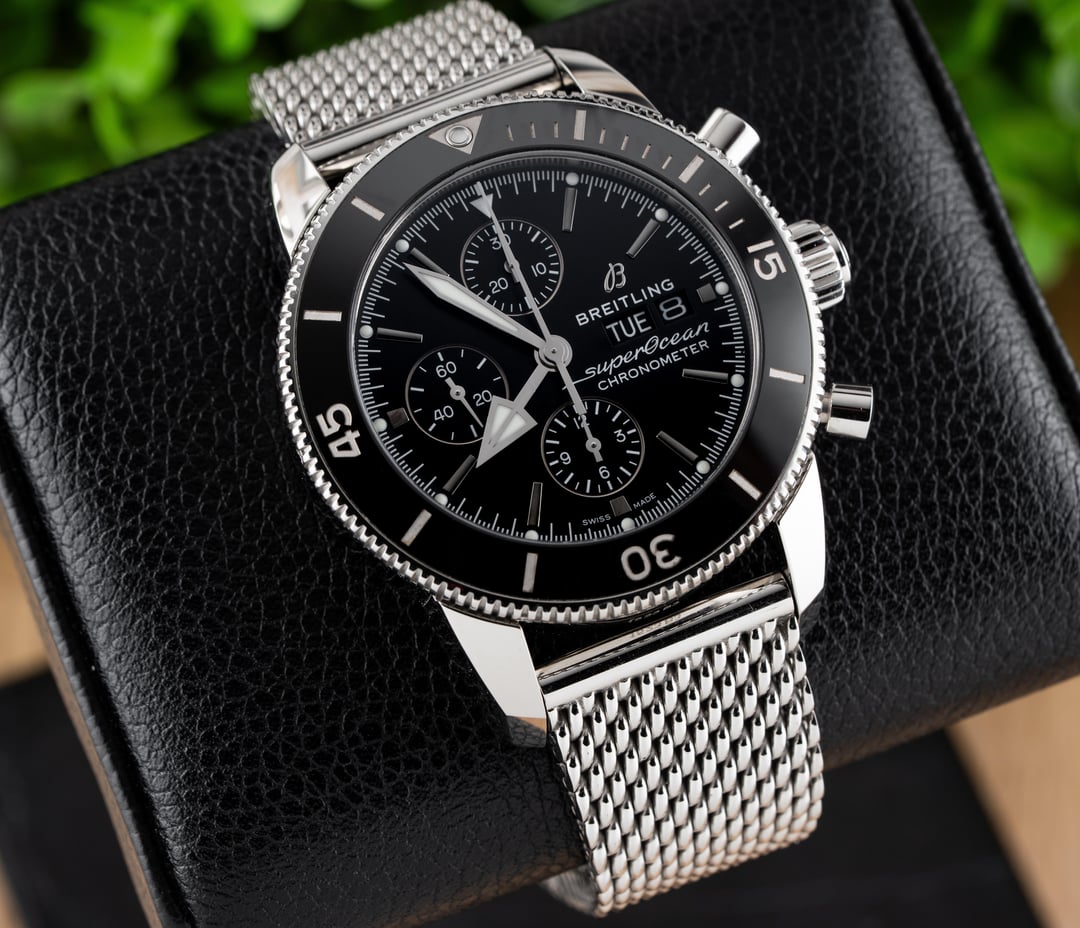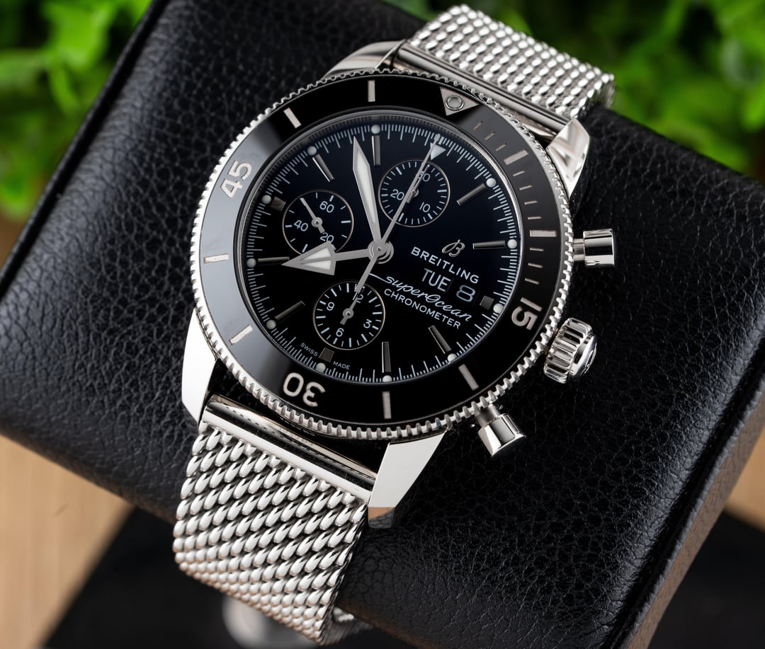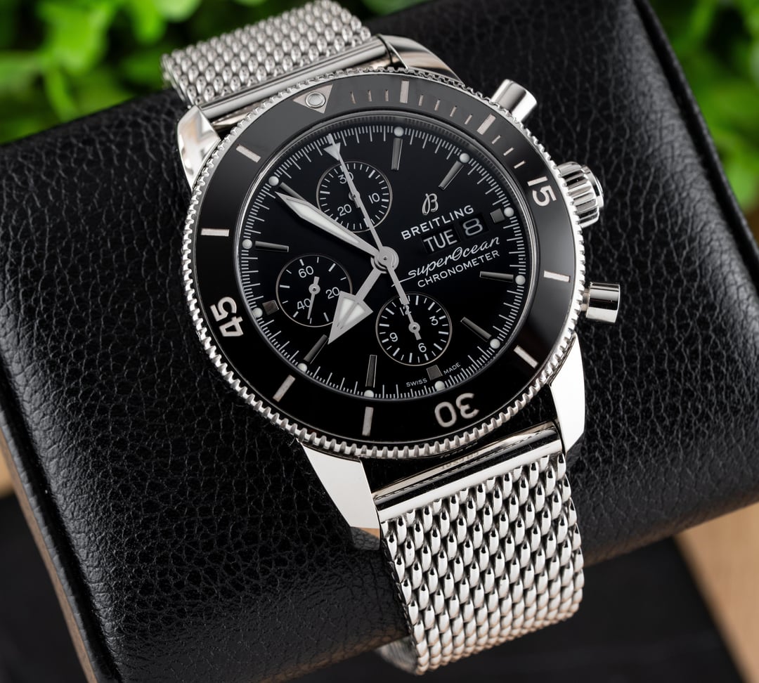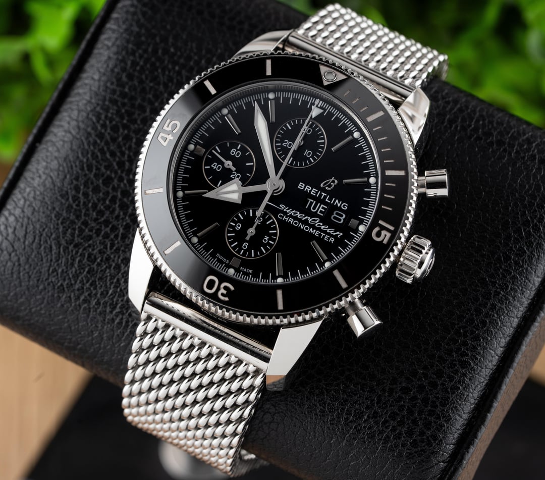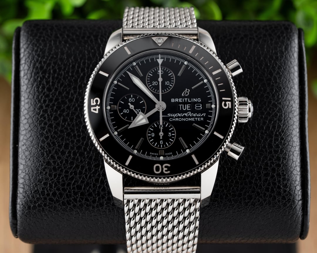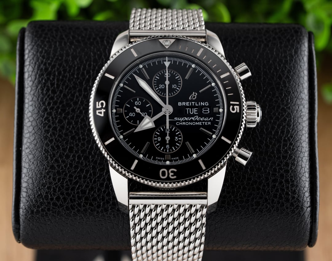 For sale is this beautiful Breitling Superocean Heritage II Chronograph 44!! This stunning piece features the black dial & comes on the stainless steel mesh bracelet! The reference to this timepiece is A13313 Price: $4250 shipped in the USA This watch comes with the full set of box & papers! It includes the Breitling Blue Outer Box, Breitling Blue Travel Pouch/Pillow, Quick Start Guide, and Warranty Card Dated 11/16/2021!! Condition: 9.5/10, this timepiece is in excellent preowned condition and shows only minor signs of wear. Name of Watch: Breitling Superocean Heritage II Chronograph 44 Black On Bracelet Reference number: A13313 MSRP: $6900 + sales tax Movement: Breitling Caliber 13 Case size: 44mm Case material: stainless steel Dial: black Bezel: stainless steel with black ceramic insert Strap/Bracelet: stainless steel mesh bracelet Clasp: folding deployant clasp with safety latch Crystal: sapphire Caseback: solid Functions: time, date, day, chronograph Jewels: 25 Power Reserve: 48 hours Vibrations per hour: 28,800vph Water Resistance: 200M / 660ft Please feel free to contact me with any questions or pricing requests. I sell hundreds of watches per year and have EXCELLENT reviews online with hundreds of references I can provide as well. Please pay attention to the pictures I’ve included, as I feel they are very representative of condition. Also please excuse any lint or dust in the photos. Thank you, -Eric at Queen City Watches