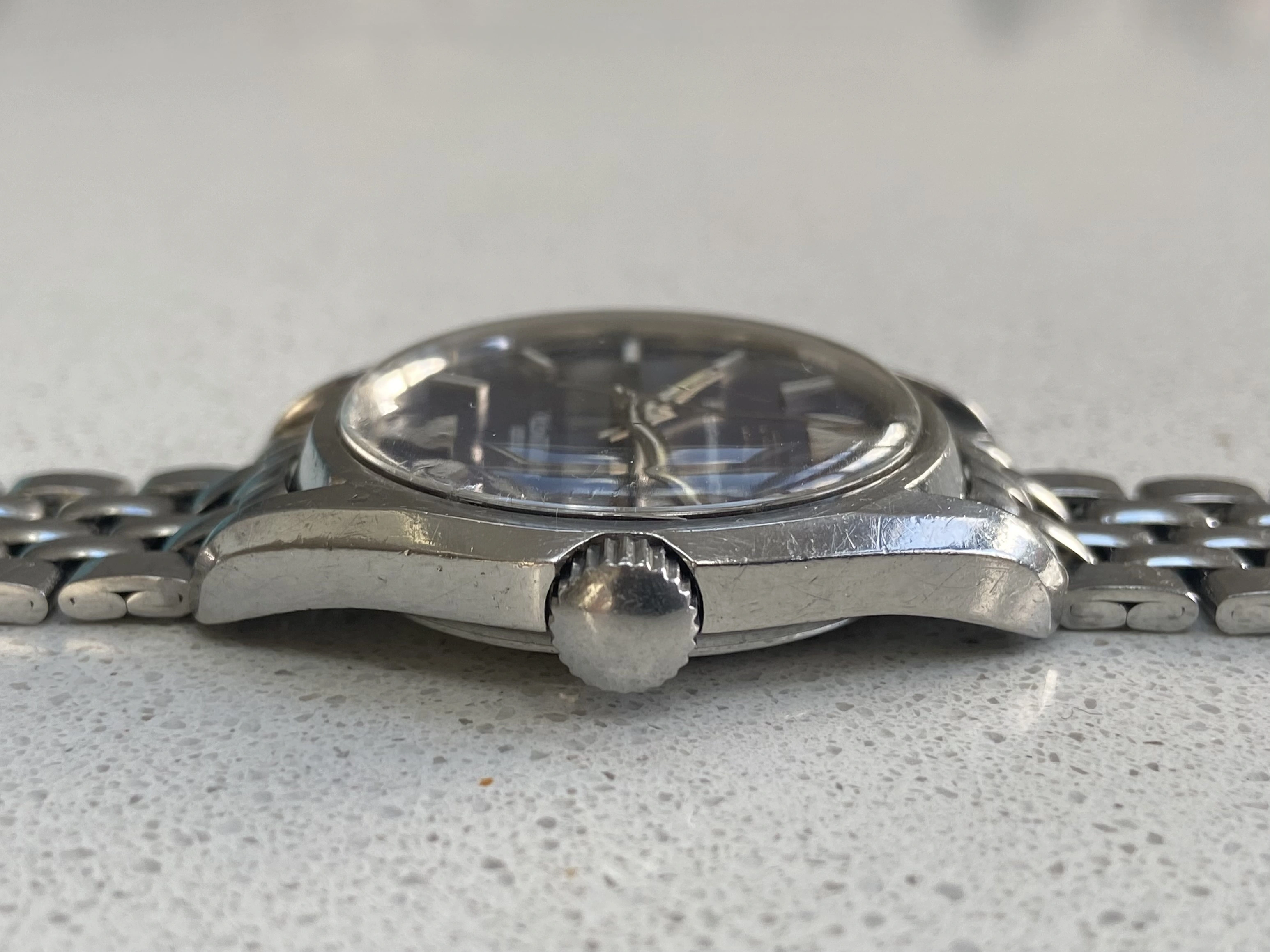 Stainless steel 37mm case. Nice and thick and has been previously polished. Plain screw down crown which I believe is correct for this reference. Crystal doesn’t have the five dots in the middle so I assume it’s a generic replacement.