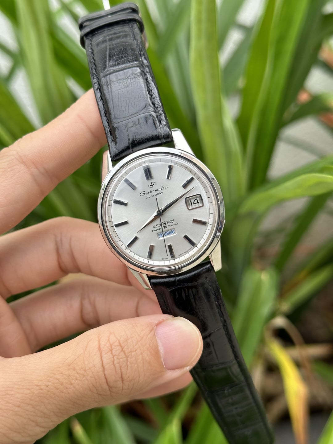 Up for sale is my Seikomatic Weekdater, dating from 1965. This is pre-Grand Seiko debut model, it shares some of the design features of the Grand Seiko 62, features the Diashock 26 jewels. It has a unique way of showing the day, above the six o’clock, which looks better then the contemporary method. The crown is located at the four o’clock, and is recessed to the point of unnoticeable. • Movement: 6206-8990, 18000bph Automatic movement • Production Year: April 1965 • Original beautiful dial no blemish • Quickset date and day are working properly. English only day wheel • Acrylic box shape crystal free from scratches • Stainless steel case, Dolphin case back, Dimensions of Case: 36 x 42mm, thickness 10mm, lug width 19mm • Performance: +15s per day • Come with black crocodile strap Timestamp: https://photos.google.com/share/AF1QipPAvhyVXav8DCjvTt69_7pZi_hwTnaBM16RTa86BDvwWsVtlyC19NzNdLip8qj_KQ?key=akx2d3F5bzJfUS1pZEcxNWY2QVYwX1RHbXFfLWRR Album: https://photos.google.com/share/AF1QipOIg8nh2SWoQmAt77-ASsA-R013tA9dt3721SHWDQ3K0XRjv0a838L1qZspNR3PNw?key=NTZZRlN2WjNCU1JXYUIzZzhkajRsbXRKS1RDZ2p3 I’ve been selling watches in this sub years now, please check my transaction flair. I’m asking for USD 399 Net via PayPal F&F or direct wire including DHL Express Worldwide shipping with tracking number. Thanks! DHL Express -> US conus, North America, Europe, Australia : 3-5 days