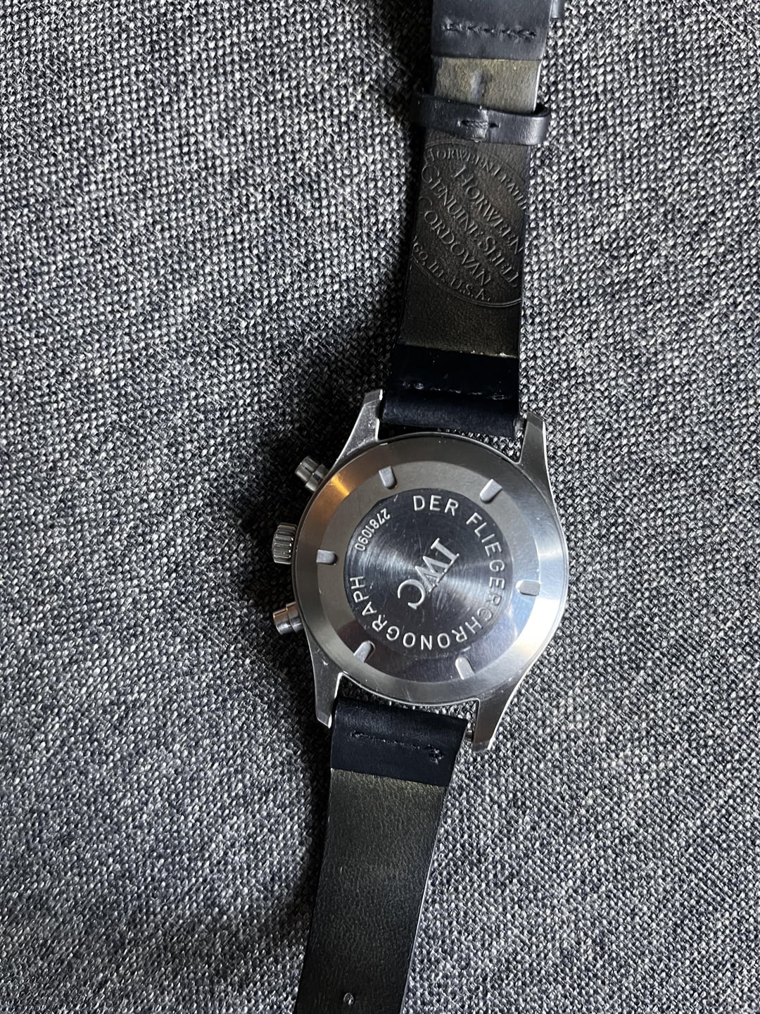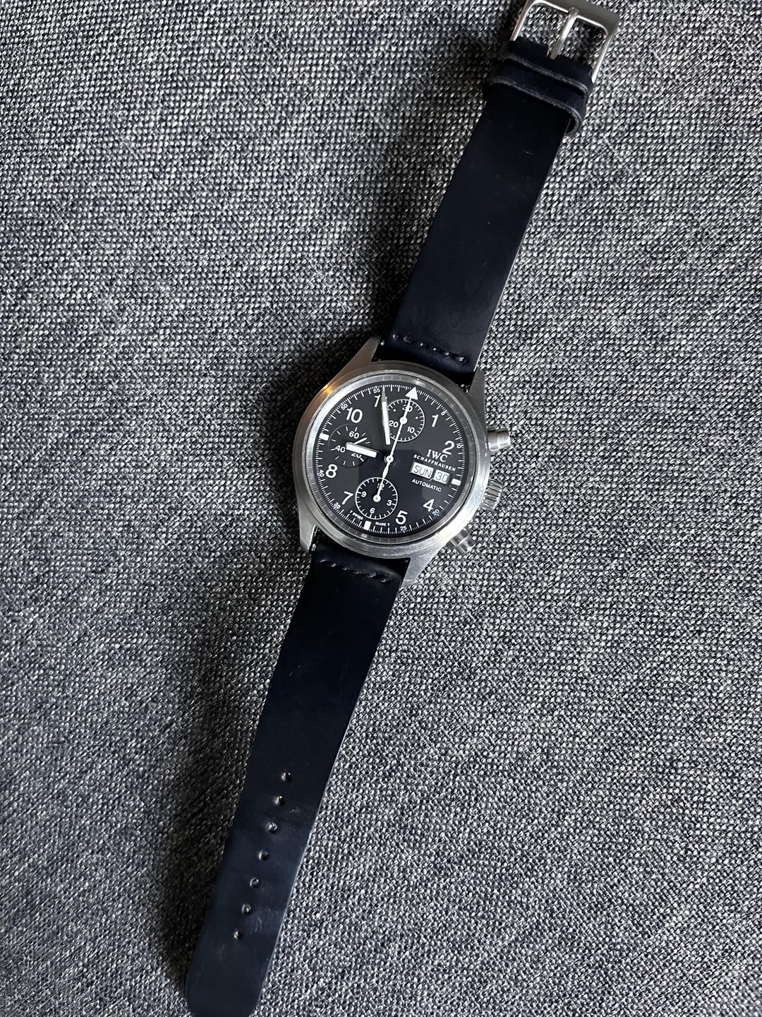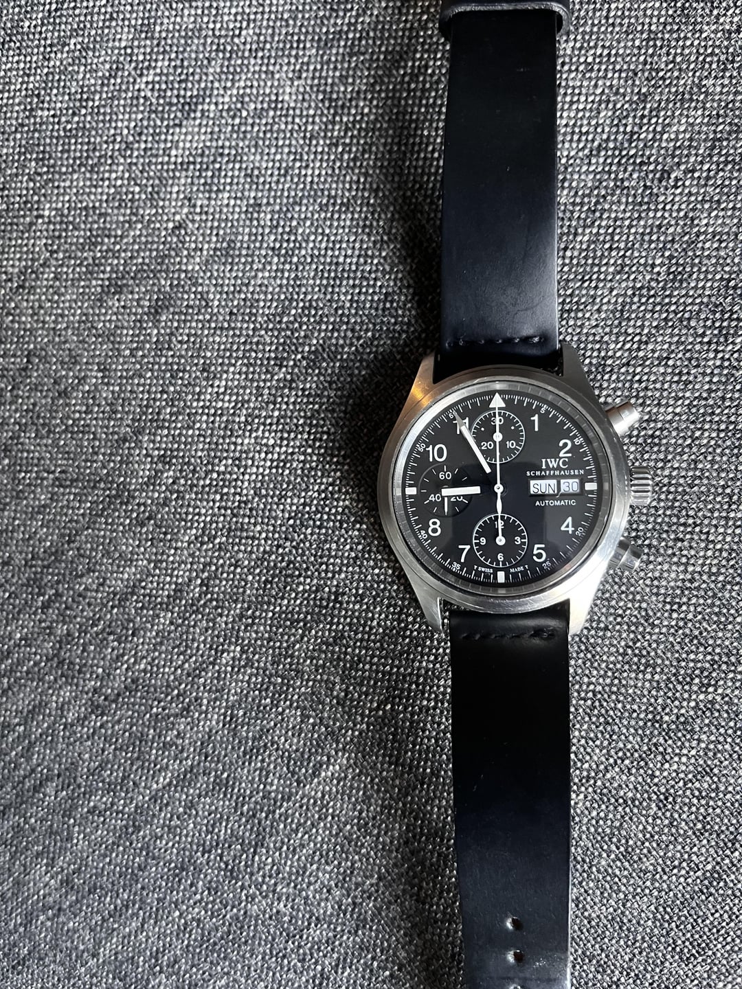 For sale only is my IWC Pilot’s “Fliegerchronograph” 39, reference: IW3706 for $2999 - Prefer CONUS sale through Zelle, Wire or Paypal FF - Please don’t hesitate to reach out with any questions Details on the watch: - Purchased watch-only from dealer. I have contact information if desired and can inquire if third party warranty remains - Serial number traces watch to approximately 2001 - Comes with non-OEM, but premium Horween Shell Cordovan black leather strap and buckle. Feels as soft and durable as thick rubber straps and fits wrist sizes 6”-7.5” - Light patina on hands as well as quarter day markers - Watch is keeping good time, however I would recommend brining to watchmaker as day advanced shortly after midnight and date advances around 7-8am. If this is of concern, I’d have them adjust accordingly. Features: - Small hacking seconds - Sapphire glass, highly legible and antireflective coating - Day and date display - Chronograph function with hours, minutes and seconds Case - Case, steel case - Diameter, 39mm - Screw in crown - Water resistance, 60M, 6.0 bar Movement: - IWC 7922 Calibre - Automatic winding - Power Reserve, 44 hours - Frequency, 28’800 VPH (4 Hz) - Components, 242 - Jewels, 25