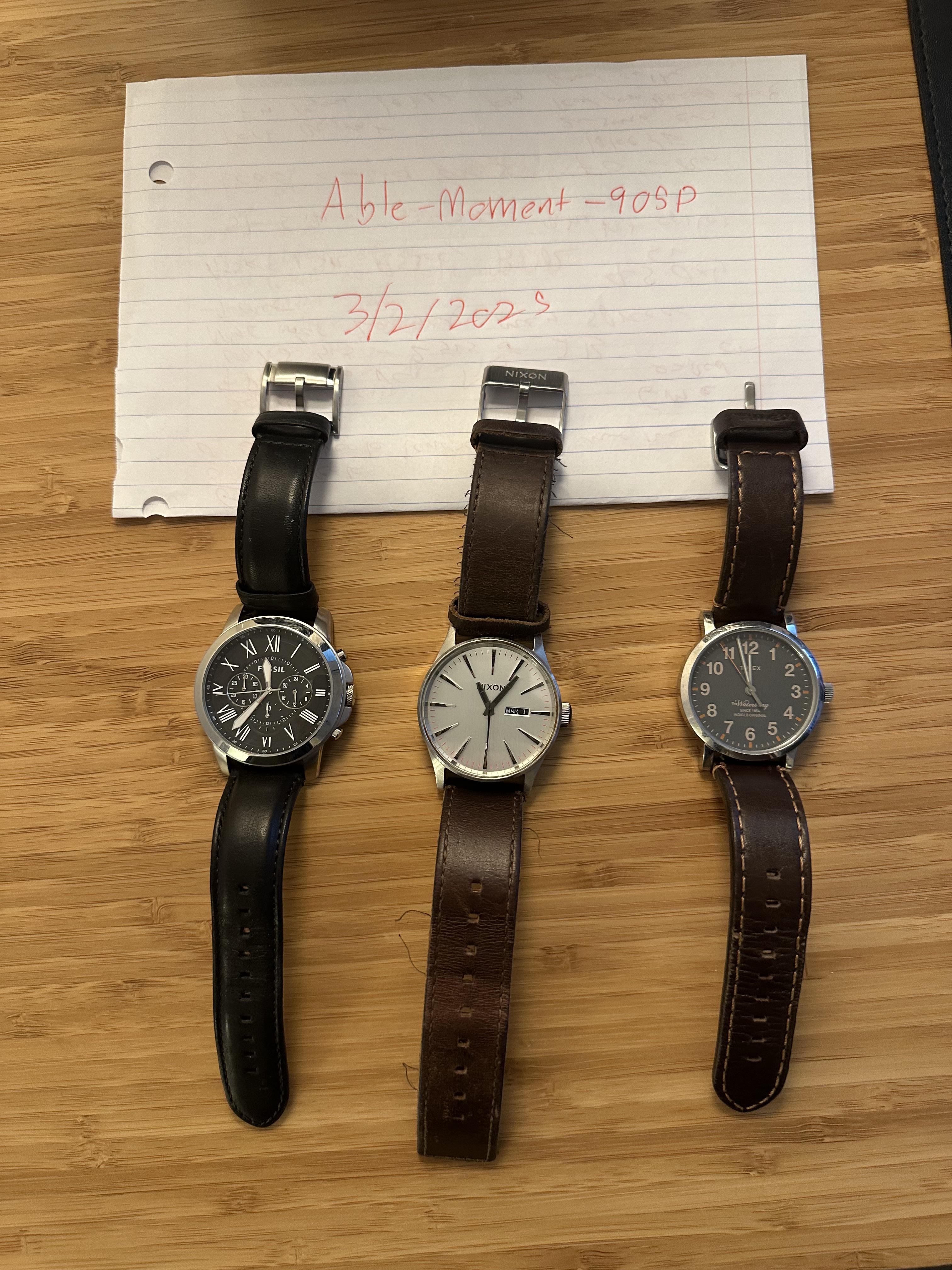 Have a Fossil F24812 (valued at $75), a Leather Sentry Watch Nixon (valued at $150), a Waterbury Timex (blue face) (valued at $125) for sale. You can buy each of them individually at the above price or all 3 in total for $275 Open to trades, buyer pays for shipping