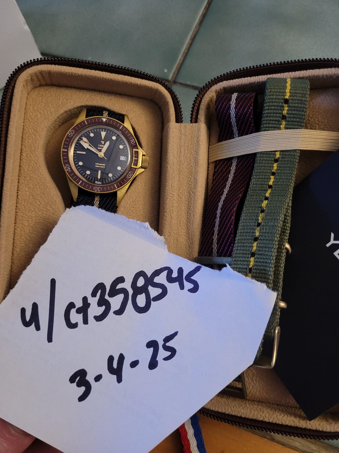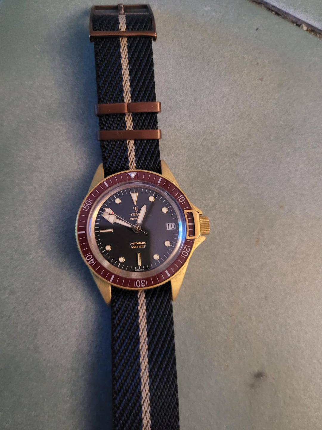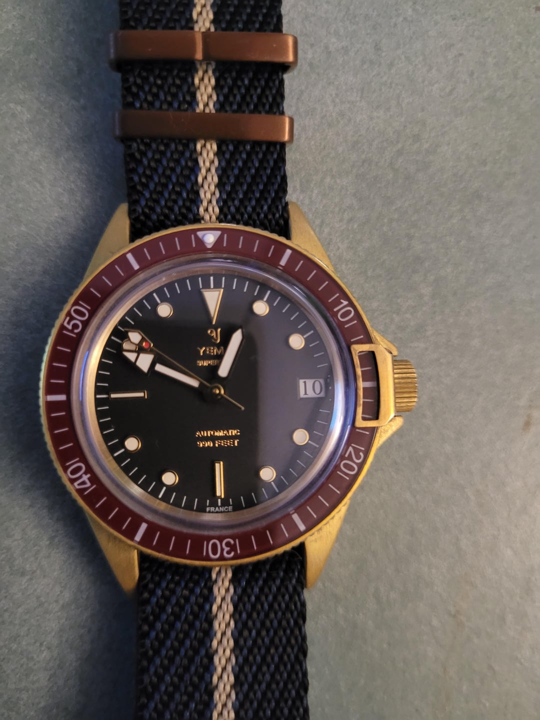 Clearing out some watches that have fallen out of rotation a bit. Here is a Yema Superman 300 in bronze with the Bourdeaux dial. 39mm case, red bezel, double domed sapphire crystal and 300m eater resistance. Not sure if they still make this particular model. I did remove the patina and restart it a few months back. It can be removed or left to darken as preferred. Comes with box, papers, oem nato and 2 additional straps. Looking to get $850 shipped CONUS Open to reasonable offers, and potentially trade offers