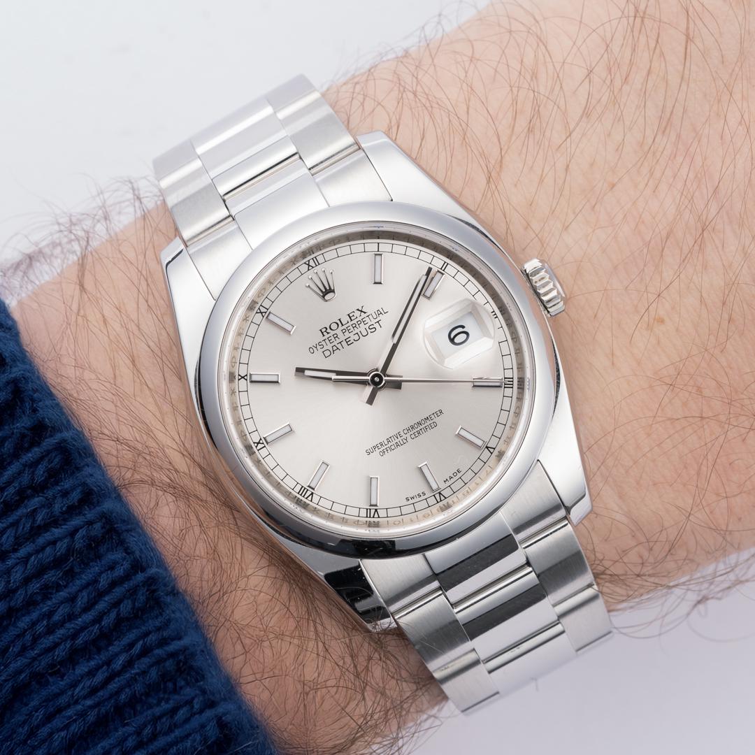 **Model**: 116200 **Condition**: Excellent (little to no signs of wear) **Year**: 2010 **Scope**: Box & Papers **Movement**: Automatic **Case Width**: 36mm **Strap Length**: 7.25" **Listing ID**: 220001773 Price: Offered at $6,350 shipped. Wire, Zelle, or Crypto [Album](https://imgur.com/a/8OHjWEy) | [Timestamp](https://imgur.com/tE7v3Ib) **Our Take** The 116200 is likely best known as the Crown's mid-2000s to late 2010s, steel smooth bezel, 36mm steel Datejust option. Additionally, the 116200 was one of the last generations to feature the esteemed Rolex caliber 3135. This silver Datejust on Oyster makes for an excellent casual yet sophisticated daily wearer. This particular ref. 116200 is in excellent pre-owned condition, meaning there are very little to no signs of wear. The movement is keeping time within COSC Standards and is running excellently. The steel smooth bezel is sharp and features the same factory finish with sharp edges. The movement was pressure tested to ensure proper water resistance. The watch includes a full collector's set including inner/outer box, manual, warranty card, and hangtags.