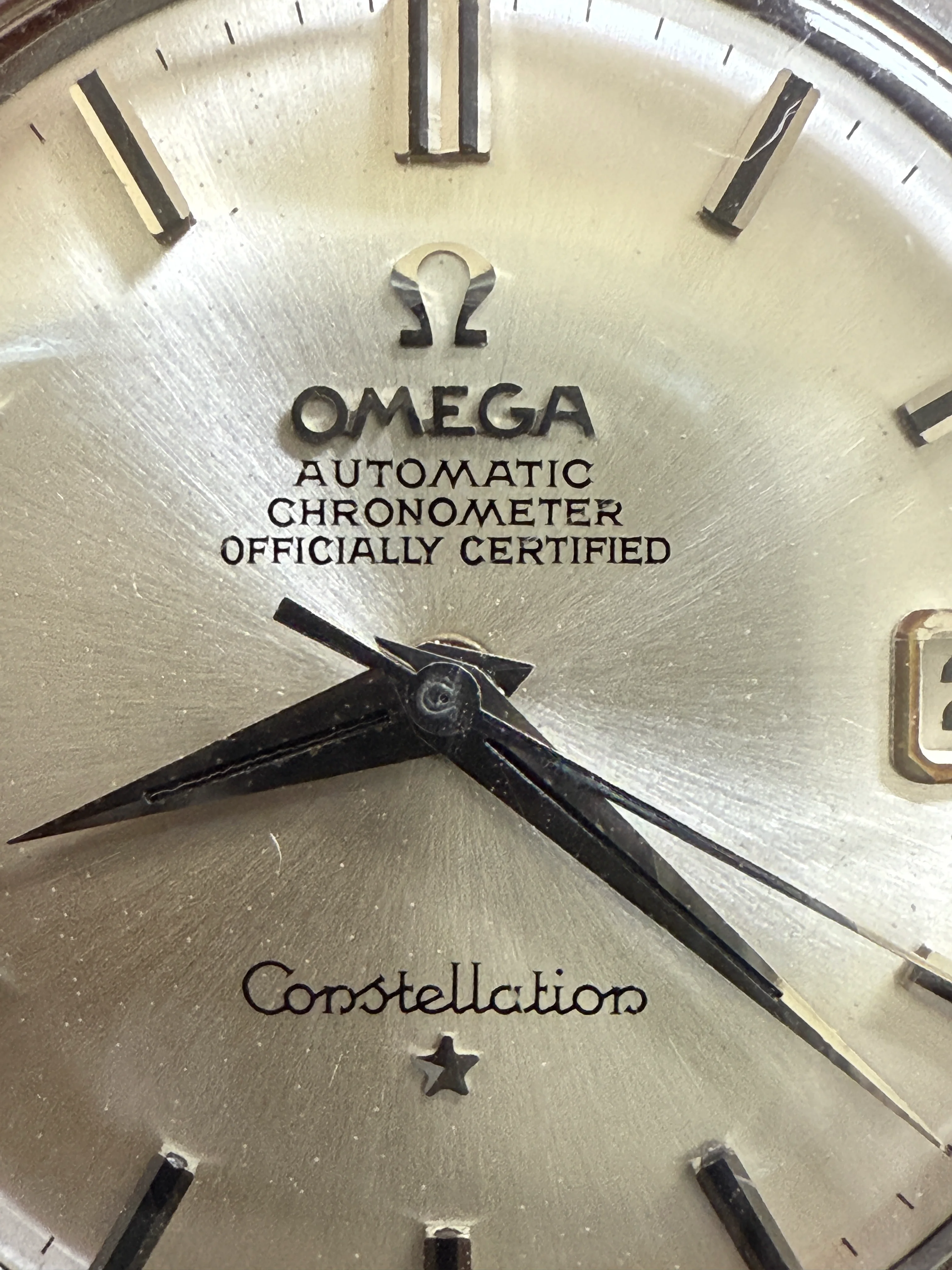 A stainless steel Omega Constellation Dog leg 168.005 in very good condition, 34.5mm, original silver sunburst domed dial.