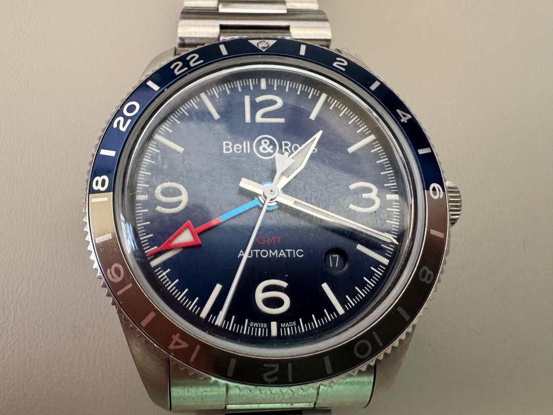 I just bought another Grail watch, I have too many watches and I've decided it is time to reduce my collection to just a handful. Hence I'm parting with my Bell & Ross Vintage Collection GMT. I bought this in January of 24 in Tokyo. The Watch has a 2 year warranty card dated 2023 4 17. While I am the second owner, it still had the plastic on it when I purchased it. Unfortunately I don't have the box. It is in very mint condition with only about 10 days on my wrist. Anyway it is a caller GMT with a decorated ETA movement visible through a sapphire case back, really nice and smooth 24 click bezel. I believe this model is discontinued and B&R seem to have replaced with the BR-05 Nautilus Homage. Anyway it is really nice watch with a sunburst blue face, 41mm size at only 12mm thick. Super comfortable and classy watch with an eyecatching blue face that looks great in sunlight. Time to move it on to someone who will actually wear it. Specs * BR-CAL.303. Automatic mechanical.MOVEMENT * Hours, minutes and central seconds and date. Second time hand of 24 hour rapid-setting, independent from the hour hand.FUNCTIONS * 41 mm in diameter. Satin-polished steel. Bi-directional bezel with 24 hour scale. Blue and grey two-colour anodized aluminum disc. Screw-down crown. Sapphire [case-back.CASE](http://case-back.case/) * Blue sunray. Numerals and indices coated in white Super-LumiNova®. Metal skeletonized Super-LumiNova®-filled hour and minute hands.DIAL * Box-type sapphire crystal with anti-reflective coating.CRYSTAL * 100 meters.WATER-RESISTANCE * Grey and blue elastic canvas or satin-polished steel.STRAP * Folding for metal bracelet.BUCKLE 2000 US. Accept Zelle and Paypay Friends and Family.