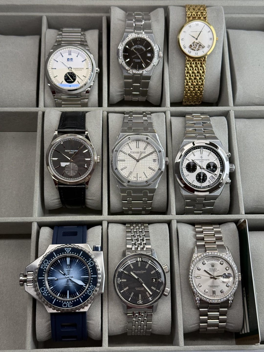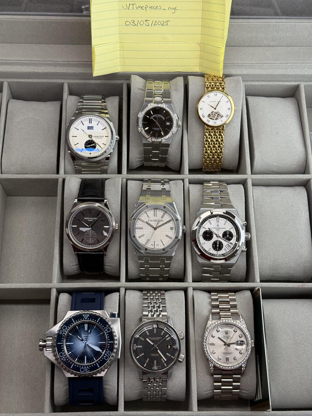 Hey r/Watchexchange! Today we have a variety of luxury watches while bring you some desirable models at incredible prices. Enjoy the collection! ### **Follow us on Reddit to get Free Insured Shipping!** 💰 **Don’t want to miss out on a deal and wire ready?** PM us and Comment “(watch) Sold to me” and we’ll ***take $50 off*** for saving us some time! **Descriptions from top to bottom, left to right** — ## **Parmigiani Fleurier Tonda** **Reference:** PFC910-0000140-B00182 **Box and Papers:** Box and Papers **Condition:** Preowned, unworn condition! **Year:** 2022! **Case Size:** 42mm **Price:** **$9,250** — ## **Patek Philippe Calatrava** **Reference:** 6119G **Box and Papers:** Box and Papers **Condition:** Preowned, very minimal to no wear **Year:** 2023 **Case Size:** 39mm **Price:** **$24,450!** — ## **Omega Seamaster Proprof 1200M** **Reference:** 227.32.55.21.03.001 **Box and Papers:** Box and Papers **Condition:** NEW **Year:** 2024 **Case Size:** 55x45mm **Price:** **$9,500!** — ## **VC Overseas Black Dial Diamond Bezel** **Reference:** 72550/423A **Box and Papers:** Box and Papers **Condition:** Preowned **Year:** Can check upon request **Case Size:** 35mm **Price:** **$7,000!** — ## **AP Royal Oak 50th Anniversary** **Reference:** 15510ST 50th Anniversary **Box and Papers:** Box and Papers **Condition:** Brand new with light handling marks **Year:** **Case Size:** 41mm **Price:** **$37,450!** — ## **IWC Aquatimer** **Reference:** 1812 **Box and Papers:** 2021 Service Papers **Condition:** Preowned, very good condition **Year:** N/A **Case Size:** 37mm **Price:** **$10,200** — ## **AP 18k Dress Watch** **Reference:** 14571BA **Box and Papers:** Box and Open Papers **Condition:** Preowned, Minimal Wear **Year:** N/A **Case Size:** Can Check **Price:** **$11,500** — ## **VC Overseas Panda** **Reference:** 5520V/210-AB686 **Box and Papers:** Box and Papers **Condition:** Incredible condition other than light scratch on side of case **Year:** 2024 **Case Size:** 42.5mm **Price:** **$32,000!** — ## **Rolex Day-Date (Factory Diamonds)** **Reference: 118389** **Box and Papers:** Watch and card **Condition:** Preowned, minimal wear **Year:** 2014 **Case Size:** 36mm **Price:** **$28,000!** — ### **Additional ways to contact us:** Corresponding on Reddit can be a pain sometimes. If you have further questions and need another way to connect, you can visit [tpnyc2.com](https://tpnyc2.com) or find us on Instagram **@tpnyc2**!