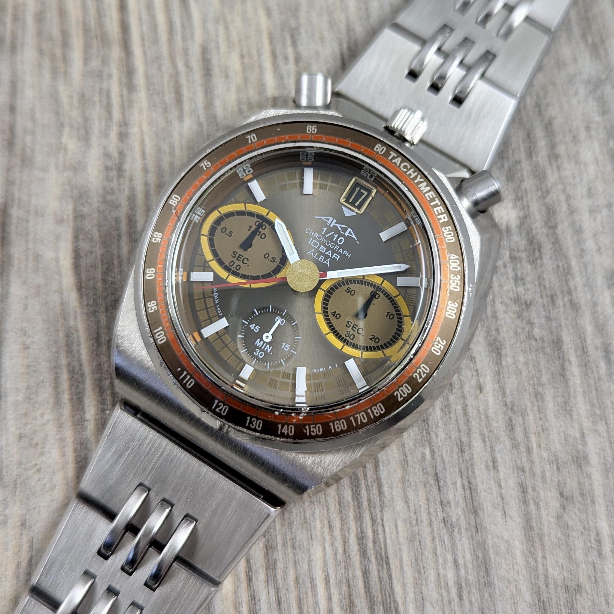 Up for grabs is a rare all-original Alba AKA by Seiko “Bullhead” quartz chronograph with brown dial. The movement/case number is V657-6060 and I believe the reference number is AMAS013. [**Link to additional images, timestamp, and video of chronograph resetting.**](https://imgur.com/a/AHhd58c) Although these AKA chronographs are obviously influenced by the Seiko 6138 bullhead from the 1970s, they were actually offered for a short period (about one year only) in the late 1990s. This particular piece is circa 1997. The case diameter is a “just right” 41mm, so not too large and not too small. Condition is far from perfect, but nonetheless very good considering its age and the fact that these watches were inexpensive when new. As far as specific condition issues, I would point out some abrasion on the bezel at 9 o’clock and the bottom edge of the case at 3 o’clock. As well, the domed mineral crystal has some scratches and pitting. Still, this piece presents nicely when not scrutinized under magnification. I don’t have any extra links, but the bracelet is presently sized for my almost 8” wrist, so it should fit most buyers. **Price reduced to $199 firm** includes free shipping within the United States. International shipping may be available at extra cost. Payment accepted via regular PayPal or Zelle. Thanks for the look!