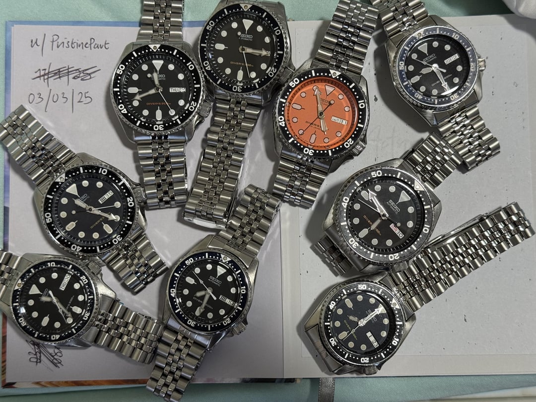 Selling my Seikos! Have some big expenses for a new home, so prices have been reduced + I cover shipping (around $20). Will be using economy shipping from Singapore, so it will take 2-3 weeks to USA/Europe/Africa, 1-2 weeks to Asia/Australia. FedEx is available to USA with a top up of $25. Price: $200 shipped (011J is $220 shipped). Add $34 for a new OEM Seiko Jubilee (no spring bars) - selling these at cost for those who get a watch! Payment methods: Wise / Revolut (no fees), Crypto, PayPal G&S (+4.5%) or PayPal F&F All watches come on a new aftermarket bracelet. Sale is watch only, no box or papers. All parts are original. [SKX011J - 2N5424](https://imgur.com/a/yJP9w9f) [SKX007 - 0D8412](https://imgur.com/a/Hvsdeq1) [SKX007 - 710555](https://imgur.com/a/PNKuKcB) [SKX007 - 830184](https://imgur.com/a/5uCsfBk) [SKX013 - 870264](https://imgur.com/a/8tK2QKx) [SKX013 - 1N0667](https://imgur.com/a/5VpuoP4) - (chapter ring misaligned) $180 [SKX013 - 275418](https://imgur.com/a/g3x1usA) [SKX013 - 730047](https://imgur.com/a/RxsqBdF) All of them have had a movement service. Not pressure tested, so definitely won’t recommend even showering with these on. Most of these have cosmetic damage, typically dings/scratches + fading on the bezel inserts, scratches on case and caseback, with some light scratches on the crystals. All of the bezels turn fine without being stuck. Crowns might have some play but they are all able to be screwed in. Check out the albums for more photos and let me know if you need more. Do comment before starting a chat or sending a PM, cheers!