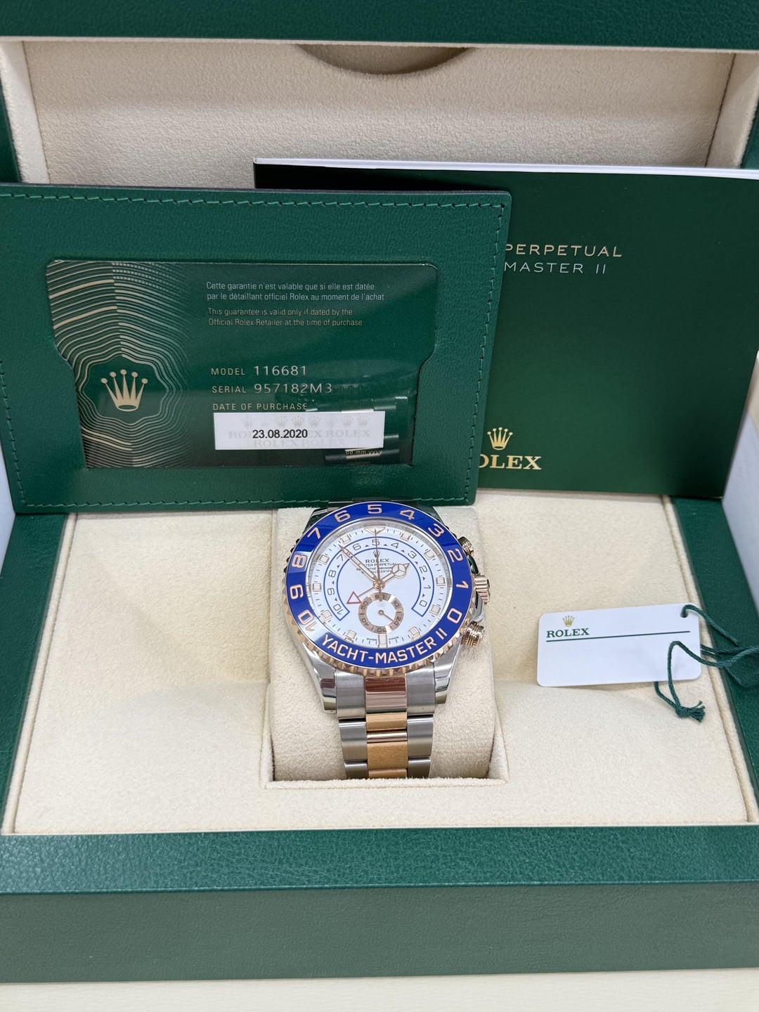 Rolex Yacht-Master II Ref No. 116681 This beautiful piece comes with a complete set, with box,booklets, hangtags, and card dated 09/2020. Watch is in beautiful condition and ready to wear. Offered for $22,999 including overnight shipping Full Time Dealer in Downtown LA for local pickup, or ship insured nationwide. Plenty of Reviews and References across platforms. Timestamp: https://imgur.com/a/v1rzfyQ