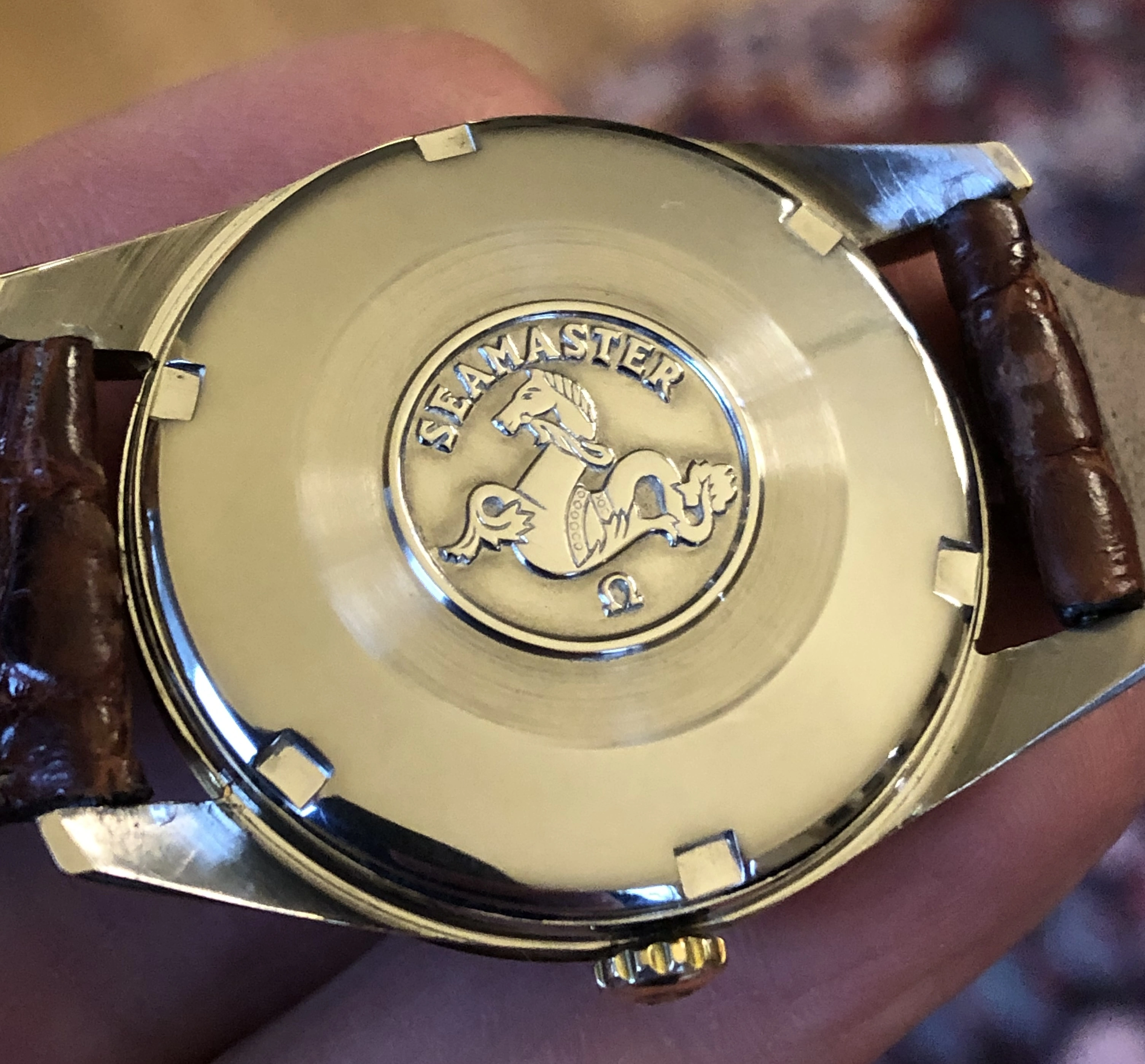 Here is a beautiful Omega Seamaster (ref 166.010) from the mid-1960s with a clean silver sunburst dial and a 35mm gold-capped over stainless case. The watch has not been serviced in my possession, but is winding, setting, and running properly. Comes with a lightly worn crocodile strap