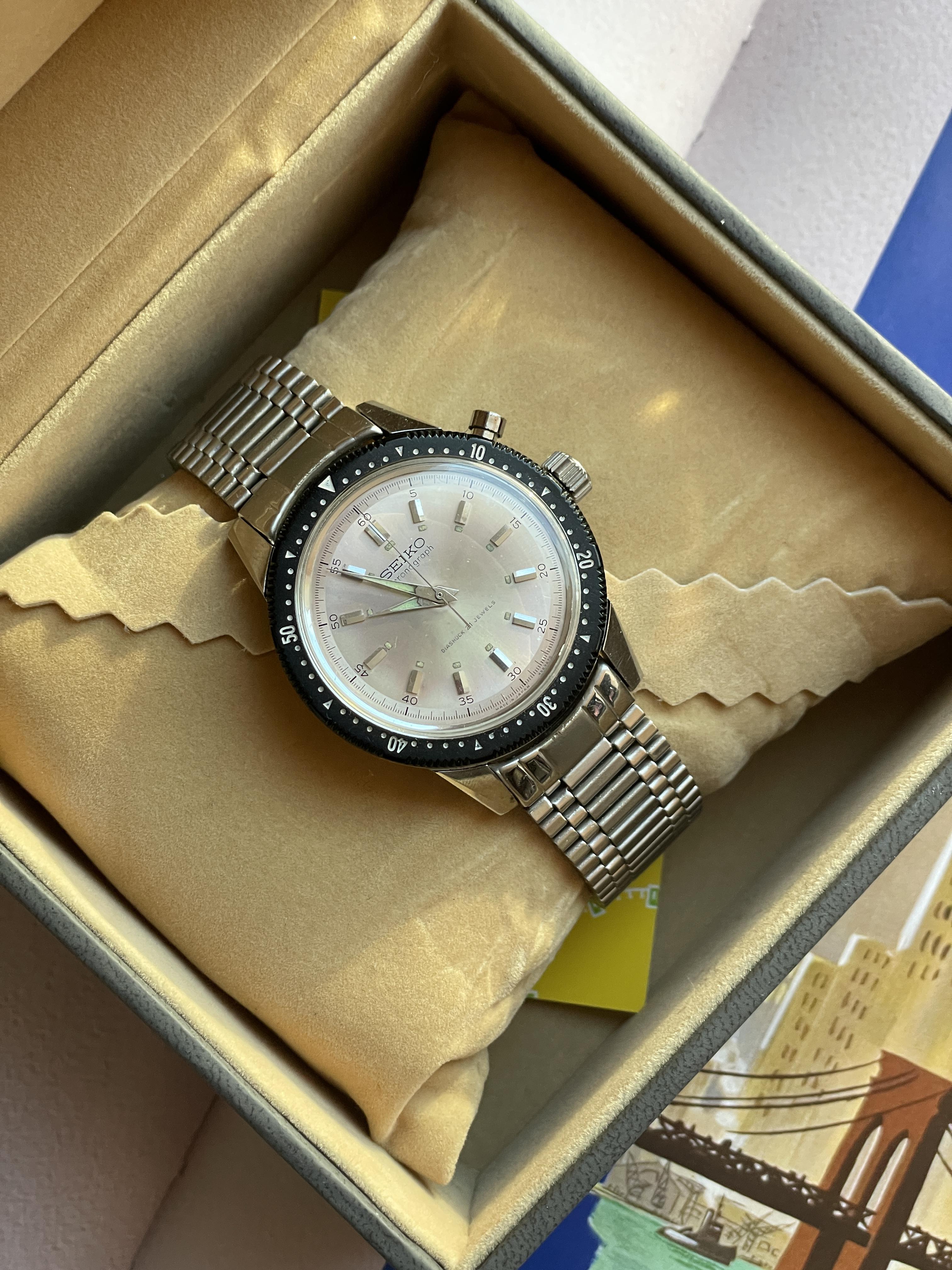 Hey Reddit, up for sale is a vintage Seiko icon. This piece is the 5719-45899 monopusher chronograph. This is the very first chronograph movement produced by Seiko, in commemoration of becoming the official timekeeper of the 1964 Summer Olympic games held in Tokyo. This chronograph is unique in that it has a monopusher which starts, stops, and resets the chronograph seconds hand. The first Japanese timepiece with a stopwatch complication, the "Crown" moniker is inherited from the hand-wound (non-chronograph) piece of the same name which this movement is based on. This piece is incredibly hard to come by in this condition. The plastic bezel is in immaculate condition, and the lume plots are all intact. The dial has developed a warm rose or salmon toned patina. This example has just been serviced and is running at around +6 seconds per day. The chronograph function is working properly and resets to 12 o'clock. Imgur & Timestamp: https://imgur.com/a/NBIrrgy Price: ~~$1850~~ ~~$1725~~ $1600 USD OBO Condition: Excellent vintage condition. Few marks on crystal and case. Caseback still retains Olympic torch inscription. The dial has developed a slightly salmon colored patina Shipping: Free 2-day insured & tracked shipping to CONUS. International shipping available. Comes With: Watch, Bracelet, Generic Vintage Seiko Box