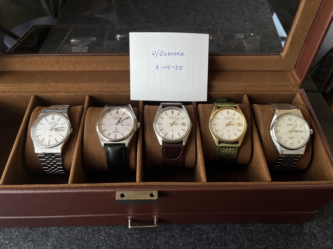 Hi everyone! Vintage Japanese Spring space-making sale! Descriptions of condition will be listed alongside price, all watches in proper working condition. These are all priced to sell, but I am happy to entertain offers and apply discounts if multiple watches are purchased. Thanks for looking! [Timestamp ](https://imgur.com/a/sWLB7Fn) **SQ Day/Date Frosted Dial** \- **~~$115~~** **$100 -** Excellent vintage condition with small patina between the 6 and 7 o'clock markers, overall the dial is stunning. Original Seiko branded bracelet is in fantastic shape with no stretching and has all original links, comes with box and papers. **Silverwave Day/Date Brushed Silver Dial - $130 -** Great vintage condition. Crystal has a number of scratches, but nothing to gasp at. Case is in good condition with minor scratches. Dial is in excellent, clean condition. Screw down crown with hacking. English/Kanji day wheel. Comes on a solid leather strap, will include a black alligator strap for no extra cost if interested. **SQ Date White Dial (Silver Case) -** **~~$115~~** **$90 -** Great condition. Has a brand new acrylic crystal, fitted with a cool Swiss Army strap. Clean dial, great lume, new battery. **SQ Date White Dial (Gold Case) - $60 -** Great condition. Minimal scratches on the crystal, small fleck of something stuck on the inside of the crystal. Dial is spotless with well-preserved lume. As-expected dings and minor scratches on the case, but overall in good condition. Comes on an olive green nylon strap. **Orient Swimmer - $50 -** B+ vintage condition. Screw down crown with hacking. Features English and Kanji date wheel with a spotless dial. Crystal is in good shape with one noticeable scratch right below the date window. Orient branded bracelet is in great condition with no stretching and all removable links present. Brand new battery. Preferred payment method is via PayPal, but can discuss other methods if need be. **CONUS** Shipping will be covered by buyer, add \~$10 depending on location/rates. Please feel free to reach out with any questions or for additional photos!