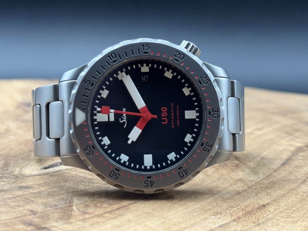 Le boîtier de cette Sinn U50 mesure 41mm de largeur pour 11,15mm d’épaisseur. Sa lunette unidirectionnelle est également fabriquée à partir d’une pièce d’acier pour sous-marin avec un large repère triangulaire luminescent. Celle-ci bénéfice de la technologie Tegiment, brevetée par Sinn, lui conférant une très grande résistance aux rayures avec une finition sablée pour un rendu mat.