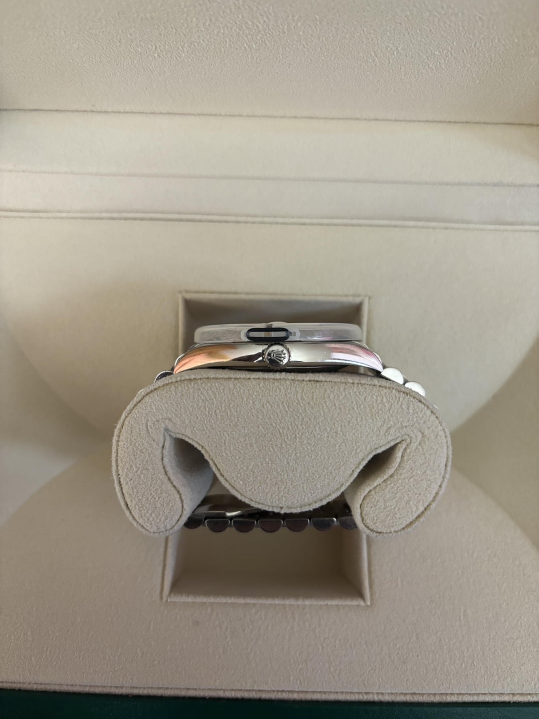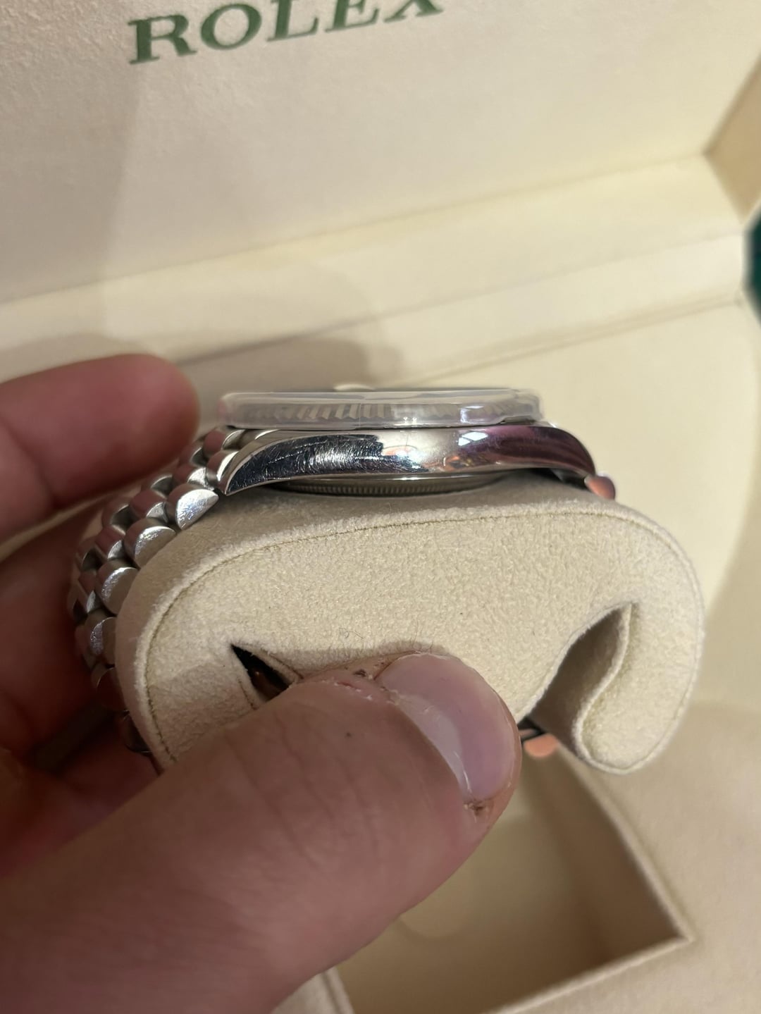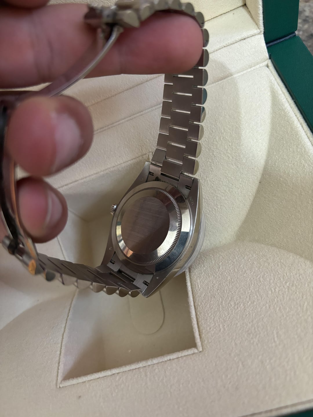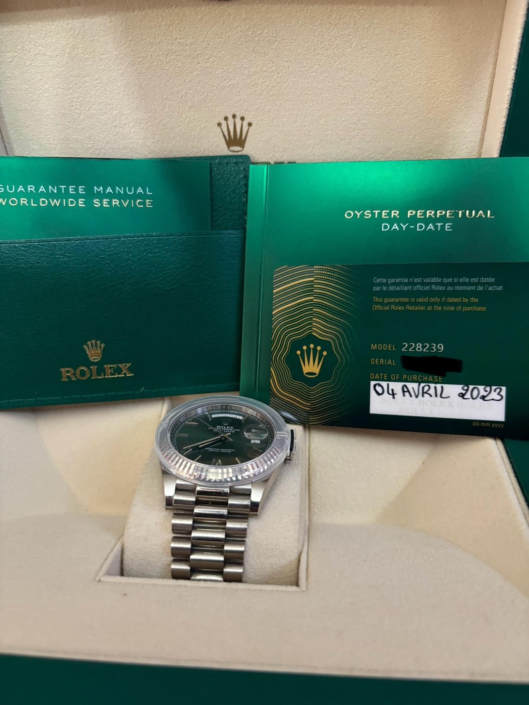 For Sale: Rolex Day-Date 40 Olive Dial – Ref. 228239 (2023, Full Set) Up for sale is a Rolex Day-Date 40 Ref. 228239, featuring the sought-after olive green dial with Roman numerals, encased in an 18k white gold case and matching President bracelet. This 2023 model is a full set, including the original box, card, booklets, tags, and double box. The watch is in pre-owned condition, showing signs of wear with some scratches on the bracelet and case. There is also a small scratch on the glass, but overall, the watch is in excellent working order, winding smoothly and functioning perfectly. A simple polish would restore it to like-new condition. Price: $39,000 Serious inquiries only. Located in Colorado willing to ship with insured delivery. 100% will FaceTime call and exchange IDS for safe transaction without a doubt. New to Reddit but have done multiple exchanges within watch trader community on Facebook. Feel free to reach out for more details or additional photos.