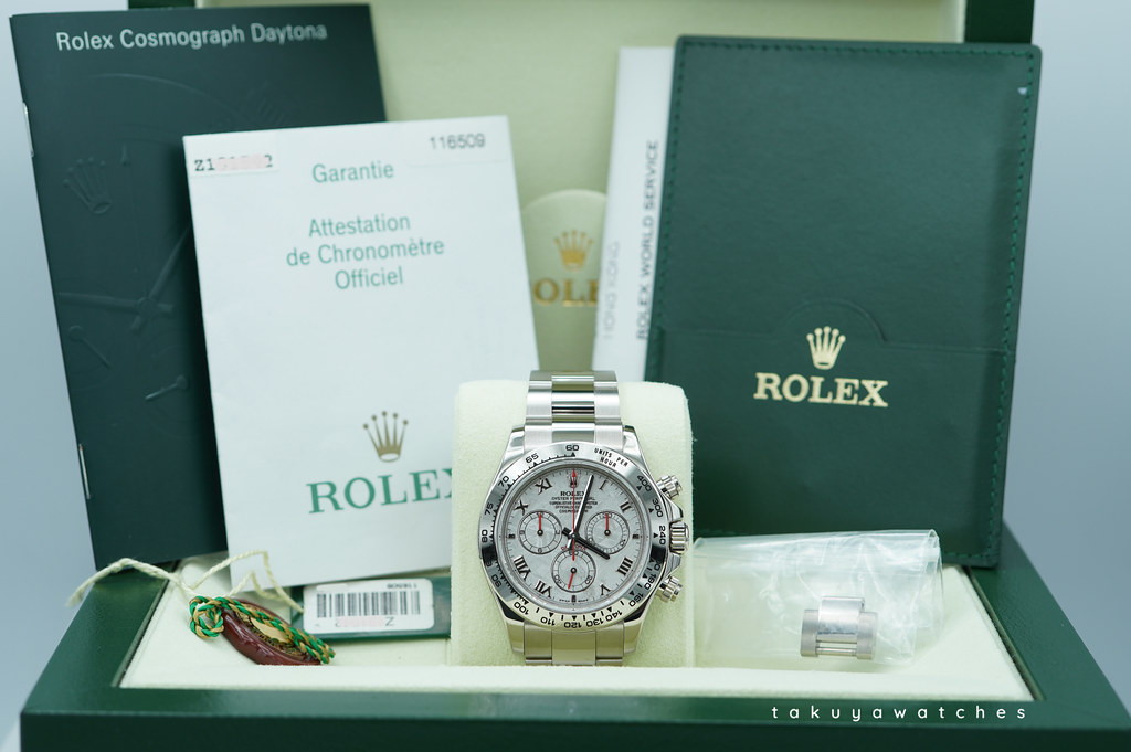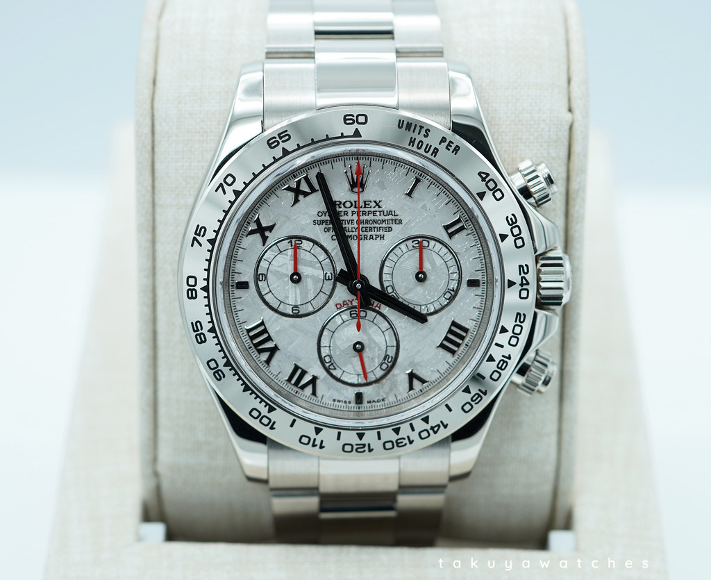 Hi, Selling An Excellent Condition & Very Beautiful Discontinued 40mm Rolex 116509 Cosmograph Daytona 18K White Gold with Rare Factory Meteorite Roman Numerals Dial. Z Serial with Rolex Engraved Rehaut. Purchased from Rolex Authorized Dealer in 11.2006. The Watch received Full Services from Rolex Service Center in 02.2023. Full Links & Full Set.