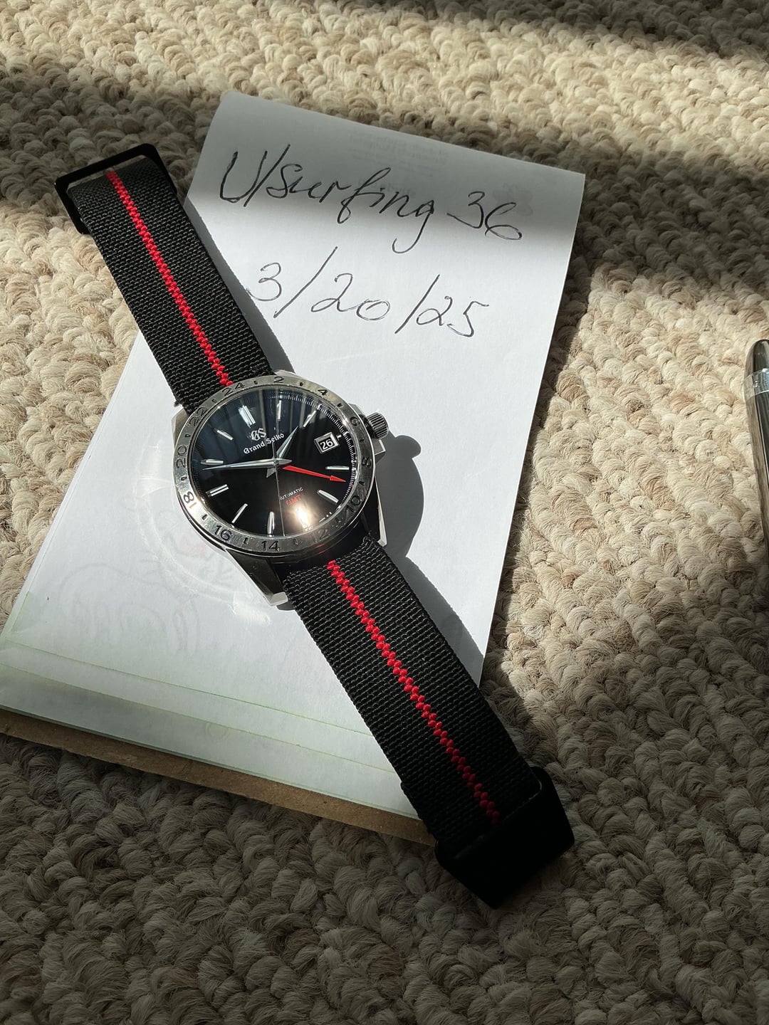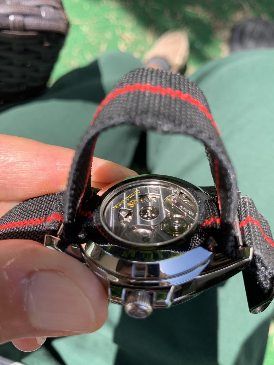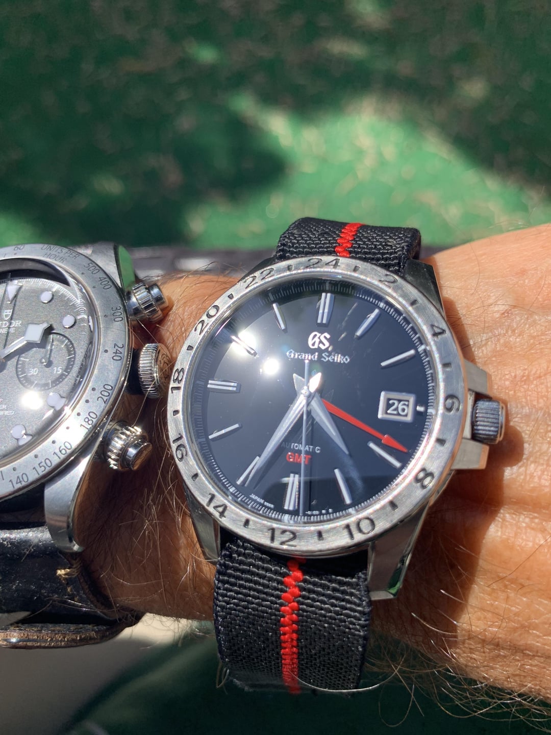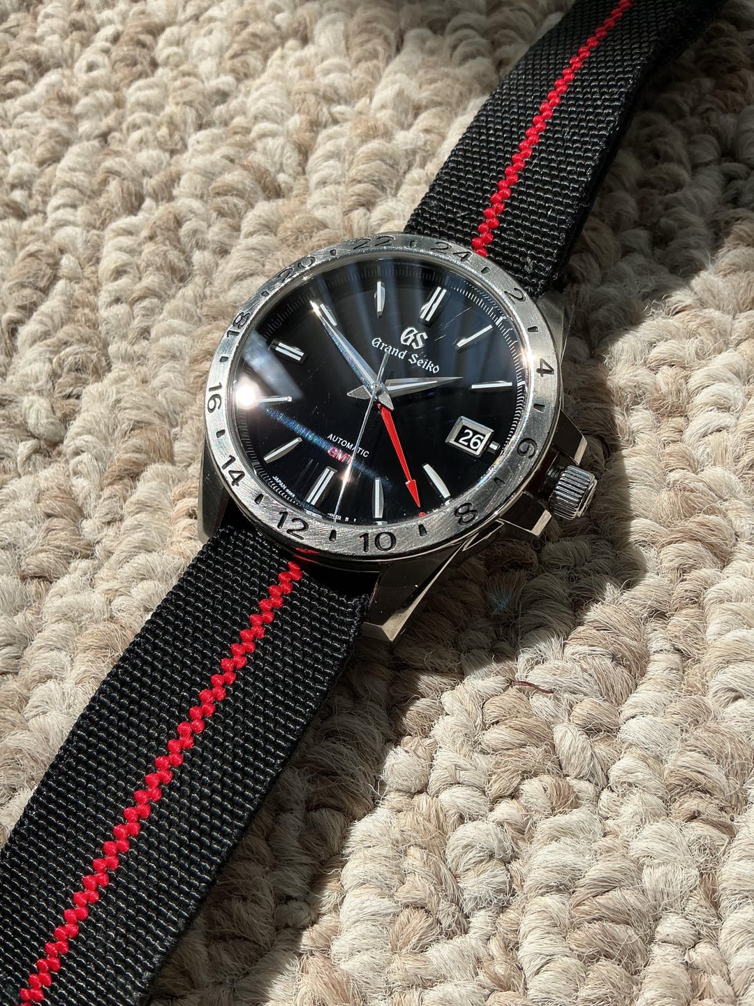Unique Japanese Domestic market only automatic GMT from Japan directly AMAZING open back caliber. Full set with all the boxes and the receipts. Only one! On Chrono 24 -cheaper than US quartz version and even some 2 labels: Seiko /grand Seiko SBGM 027. Got it last year from Japanese dealer. Claimed that it was service before sent out. If you deal with Japanese, usually they very strict. Appears polish and scratch on the crystal at 1 PM. That’s why it’s so cheap. Wear it on NATO . Coming with generic black rubber. I use original OEM 19 mm stainless steel bracelet for my another GS Open to trades or Zelle