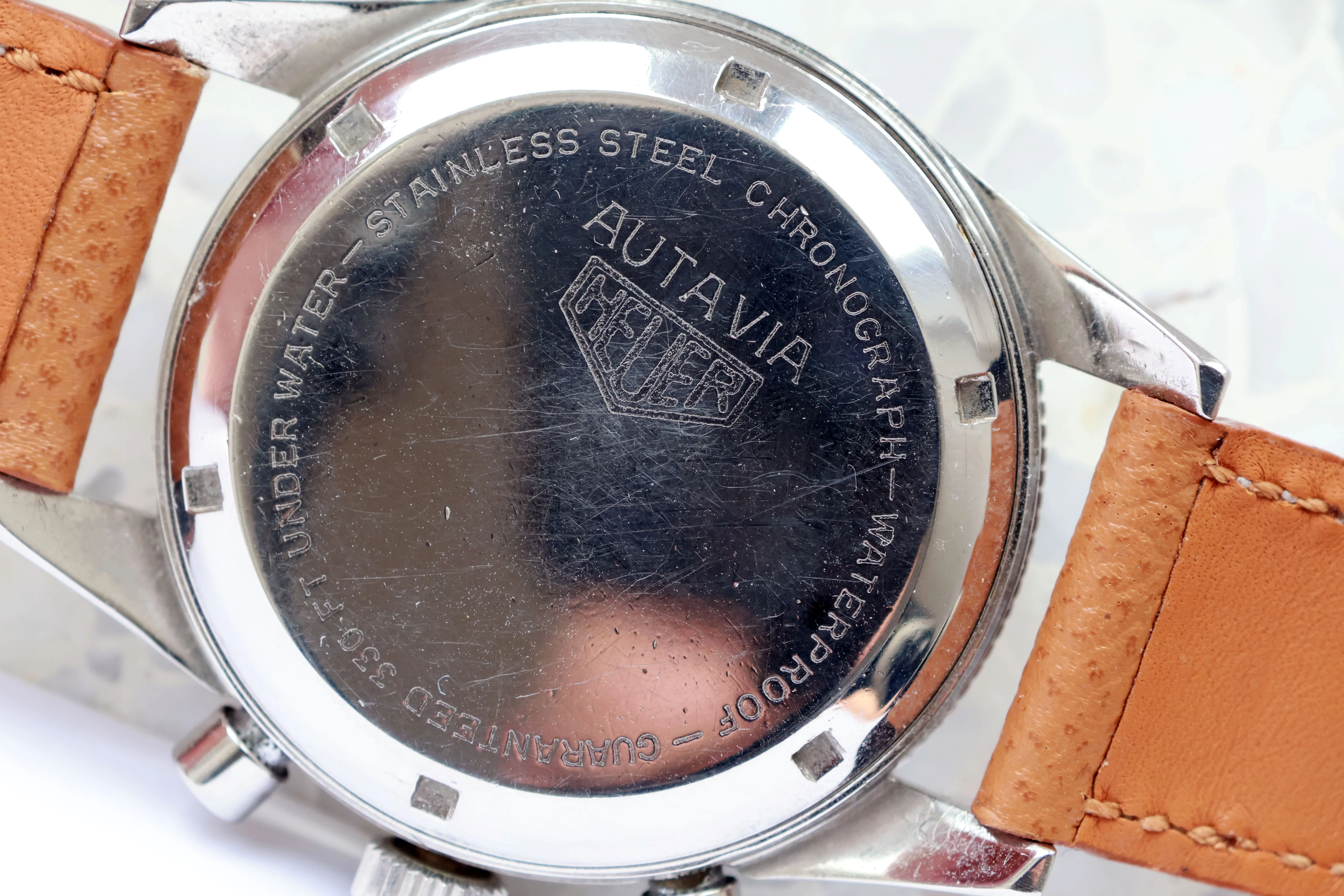 Case: Hard to capture on camera but the bevels can still be seen clearly also the caseback and the Heuer text is easily readible. On many examples the text on the caseback has somehow disappeared. Serial can be easily read between the lugs. The pictures don't do justice to the condition.