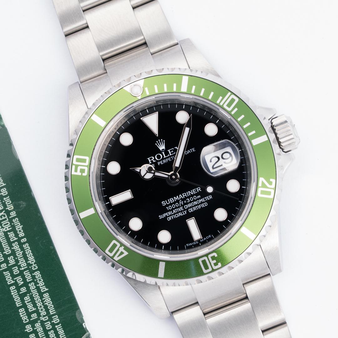 **Model**: 16610LV **Condition**: Mint (little to no signs of wear) **Year**: 2008 (M-Serial) **Scope**: Box & Papers **Movement**: Automatic, Cal. 3135 **Case Width**: 40mm **Strap Length**: 8.00" **Listing ID**: 220001831 **Price**: Offered at $13,950 obo shipped overnight via Bank Wire or Zelle [Album](https://imgur.com/a/Sxe0GLz) | [Timestamp](https://imgur.com/HBBtiND) **Our Take** In 2003, Rolex marked the 50th anniversary of the Rolex Submariner with the launch of the Ref 16610LV. Better known to collectors as the Rolex Kermit. The Kermit has arguably the best proportions of the Submariner according to many collectors; including slimmer pre-ceramic case, maxi-dial for easy legibility, solid end links with a no-holes case, and a sharp green aluminum pre-ceramic bezel. This example also features the later engraved rehaut. This watch is in mint pre-owned condition. The bracelet shows minimal signs of wear, nothing significant. The watch comes with all bracelet links and is currently keeping time within COSC Specifications. The bezel insert, dial, and hands are all in mint condition. It comes with the original box and papers.