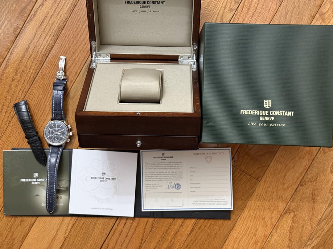 $650 This is a Frederique Constant flyback chronograph FC-760x4h. WATCHMAKER SPECIAL! I accidentally dropped the watch while changing the strap sometime last year. The 30-minute chronograph hand is LOOSE/BROKEN OFF and floating around the dial. However, the watch is otherwise in excellent condition and has been worn sparingly in a large collection. I have the original strap, buckle, box, and papers (unstamped), as well as the original strap in 98% condition. I am selling the watch as is, with the defects included. I am asking $650 OBO before listing it on eBay as an auction. I’m selling this at a SEVERELY reduced cost so the new owner can have it serviced, or fix it themselves. I’ve had the watch for just over 5 years and the only owner. This watch started my YouTube channel and was my first review. I’ve sold many watches on Watchuseek (jimiwilli), Longtime member and seller at watchfeeks (Alkies) and Baby (cbarnes767). NO TRADES AT THIS TIME - Unless they include a watch I’d want and at least 60% of the listed price. This watch is being sold as is. Acceptable payments are Venmo, Zelle, PayPal F&F, or CashApp. While I make every reasonable attempt to tell you the condition and maintenance history of the watch, I am not a watchmaker. I am not affiliated with any of the brands, and only sell and buy as a personal collector and lover of watches. I am consolidating a very large collection as I’m putting the last kid in college and we are downsizing our home and lifestyle. References as Seller:[https://www.watchuseek.com/threads/jimiwilli-is-a-reliable-seller.5457277/?post\_id=55955740#post-55955740](https://www.watchuseek.com/threads/jimiwilli-is-a-reliable-seller.5457277/?post_id=55955740#post-55955740) [https://www.watchuseek.com/threads/jimiwilli-great-seller.5459605/?post\_id=56000288#post-56000288](https://www.watchuseek.com/threads/jimiwilli-great-seller.5459605/?post_id=56000288#post-56000288) [https://www.watchuseek.com/threads/jimiwilli-is-an-awesome-seller.5496206/?post\_id=56656643#post-56656643](https://www.watchuseek.com/threads/jimiwilli-is-an-awesome-seller.5496206/?post_id=56656643#post-56656643) [https://www.watchuseek.com/threads/jimiwilli-is-an-awesome-seller.5461688/?post\_id=56038769#post-56038769](https://www.watchuseek.com/threads/jimiwilli-is-an-awesome-seller.5461688/?post_id=56038769#post-56038769) [https://www.watchuseek.com/threads/jimiwilli-is-a-great-guy.5240330/?post\_id=52438327#post-52438327](https://www.watchuseek.com/threads/jimiwilli-is-a-great-guy.5240330/?post_id=52438327#post-52438327) [https://www.watchuseek.com/threads/jimiwilli-is-a-great-guy.5240330/?post\_id=52438327#post-52438327](https://www.watchuseek.com/threads/jimiwilli-is-a-great-guy.5240330/?post_id=52438327#post-52438327)