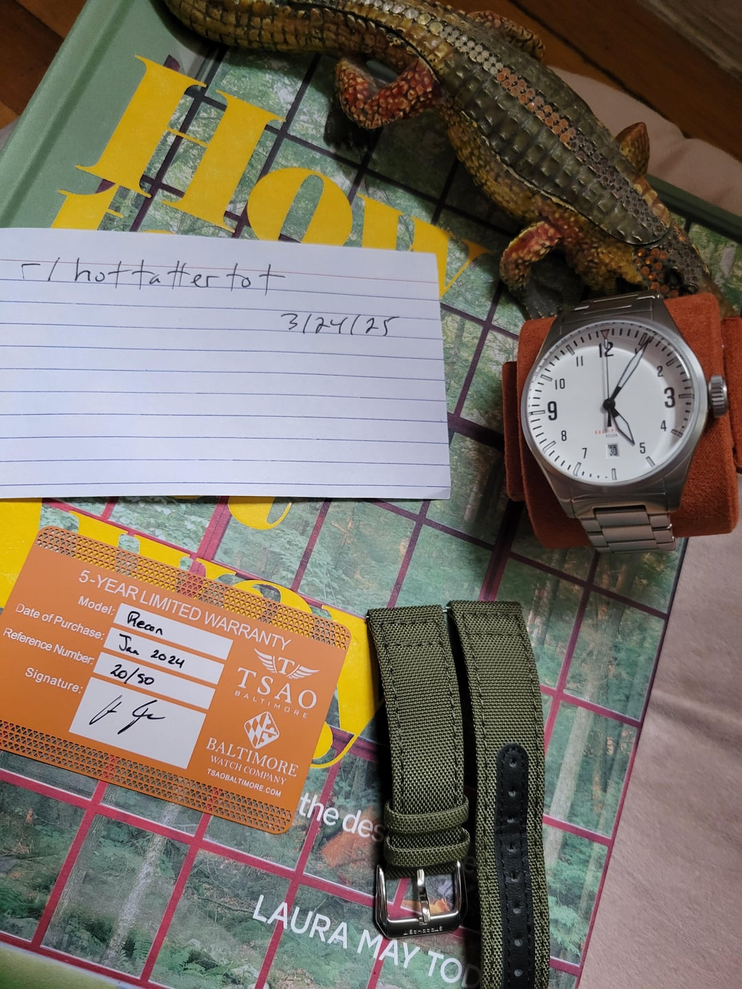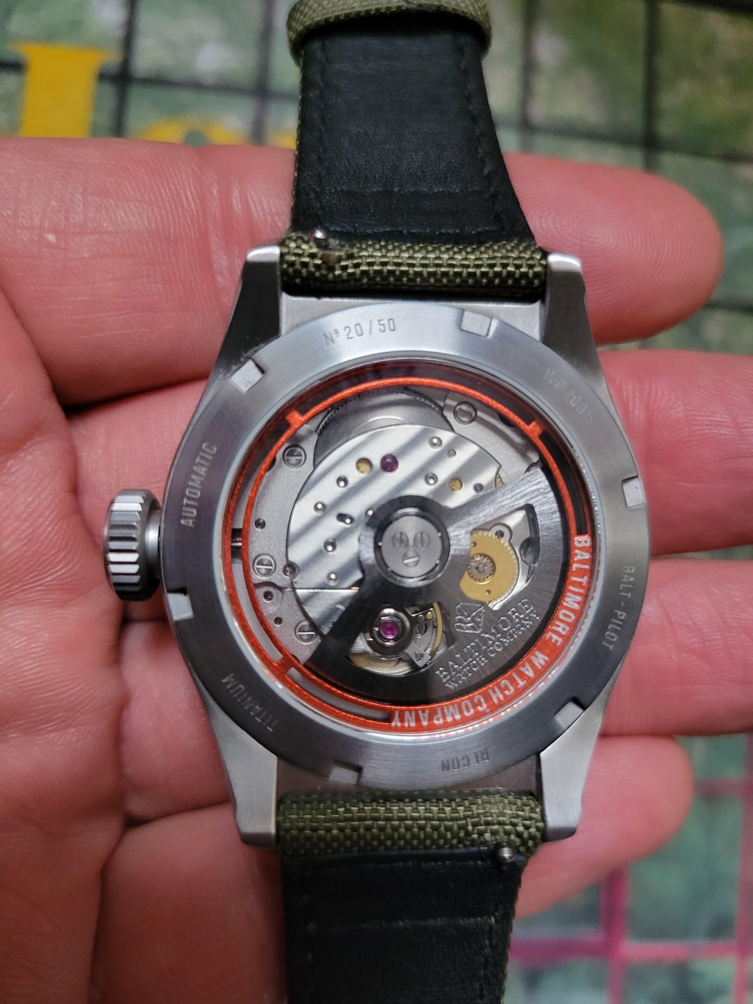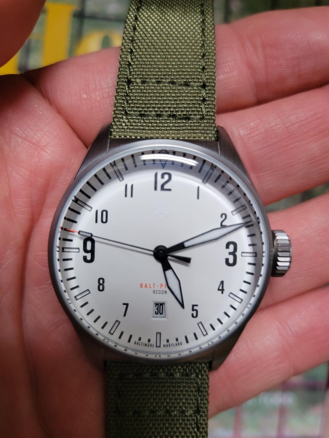 Wonderful lightweight titanium Pilot's watch! I am the original owner purchased a little over a year ago. This watch is in pristine condition with no noticeable scratches or marks on the bracelet, case or clasp. It's well loved and cared for and I'm only selling to fund a grail watch buy. $675 shipped CONUS via UPS/USPS priority. Prefer Venmo/Zelle but I will accept PayPal from members with history (+3% for PP G&S). It's a unique (one of 50) GADA option that looks fantastic on the bracelet and with straps. I'm also including a Strap Habit army green sailcloth strap that is a $25 value if desired. Just FYI, I no longer have the complimentary travel watch roll that it came with. The watch is under warranty until Jan. 2029. \--------------------------------------------- Balt-Pilot Recon Features: Movement: Automatic Miyota 9015 (Regulated) Case: Titanium (Ti2) with 1200HV Hardened Coating Case Width: 40mm Lug Width: 20mm Lug to Lug: 48mm Height: 13.6mmm Lume: Swiss Super Luminova T-CX1 (Blue) Bracelet: Titanium (Ti2) with Quick Release Pins (20mm tapered to 18mm) Buckle: Stainless Steel with micro adjustments Caseback: See Thru (Sapphire Crystal) Front Crystal: Boxed Dome Sapphire w/AR coating Water Resistance: 200 meters / 660 feet Crown: Large Screw Down Warranty: 5 year Limited International Warranty Black Canvas/Rubber Hybrid Strap