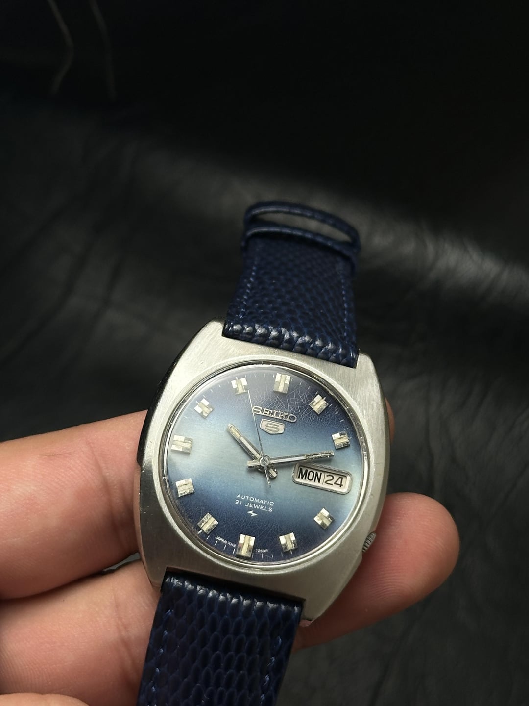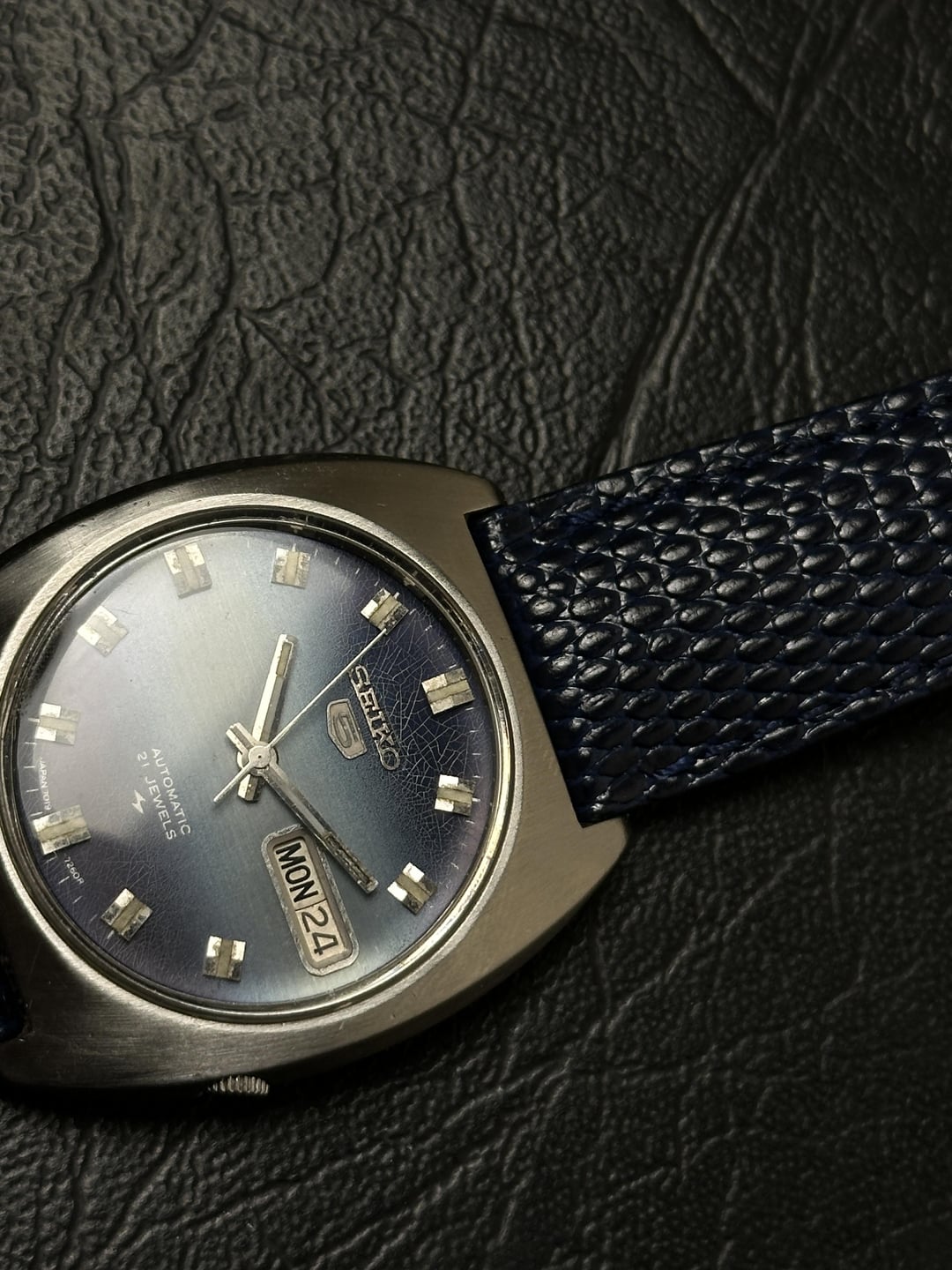 Timestamp: [https://imgur.com/a/4AGkv46](https://imgur.com/a/4AGkv46) Hello r/watchexchange, up for sale is a SEIKO 5  7019-7190 from June 1974 With its classic design and automatic movement, it's perfect for everyday wear.  Dial features a dual shade dial with effects of cracked paint on the top and bottom shade. 🎏Features: -  Automatic movement  \- Day/date Calendar  \- 7019 day pusher  \- Dark Grey dial  \- baby Monaco  📐Measurements:  \- Case diameter: 36mm  \- Case thickness: 11mm  \- Lug width: 20mm * Blue Hirsch Lizard strap. Price: 125USD shipped Note:-  • ⁠Comment before PM or chat  • ⁠Videos or custom timestamp pictures can be provided.  • ⁠Payment method: Paypal F&F or G&S (+4.5% International Paypal G&S fees).  • ⁠Ships İnternationally by UPS.